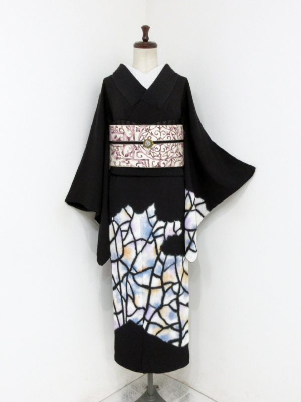 ■雅星■アンティーク!!ブラック*ひび割れ ステンドグラス♪一つ紋訪問着 正絹袷 裄61丈149
