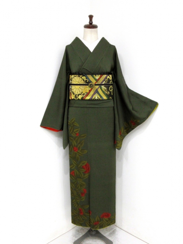 ■雅星■美品!!鶯色*額縁 花模様♪訪問着 正絹袷 裄68.5丈162ロング