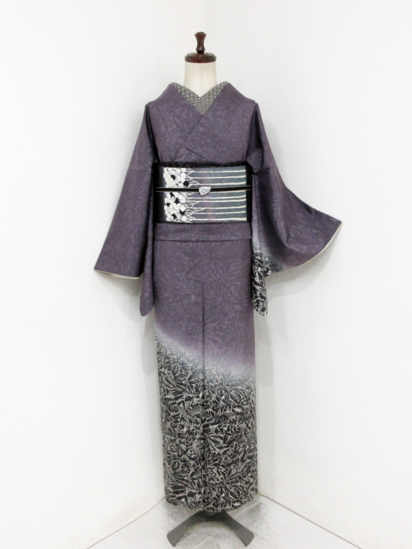 ■雅星■美品!!灰紫グラデ*リーフシルエット♪染め大島紬 一つ紋付下げ訪問着 正絹袷 裄64丈165ロング