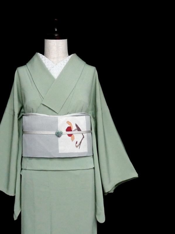 〓雅星〓美品!!裏葉柳色*洗える 一つ紋色無地 縮緬 単衣 裄61.5丈150