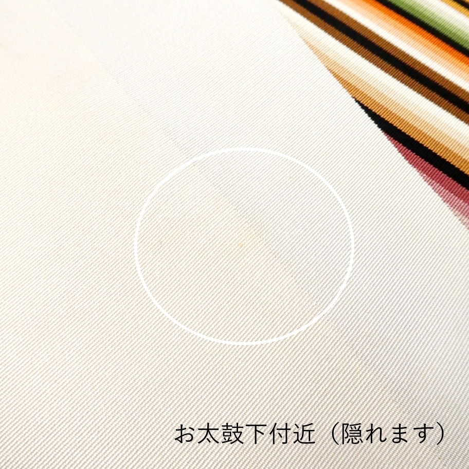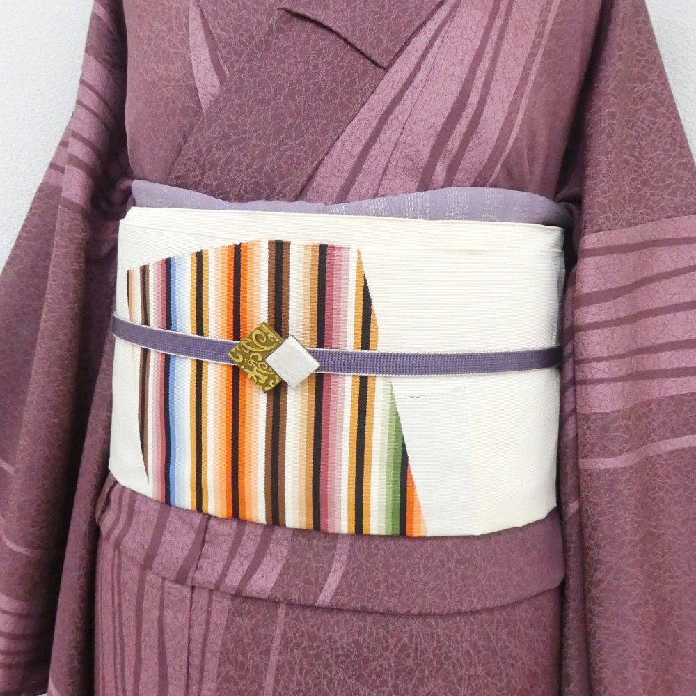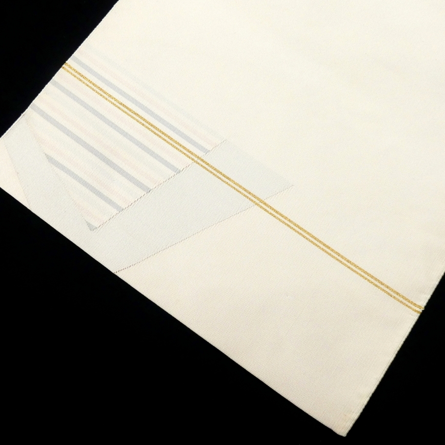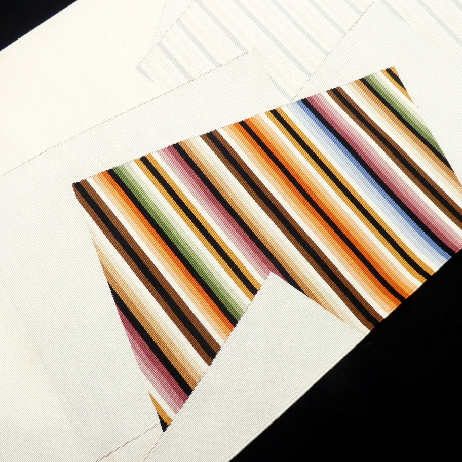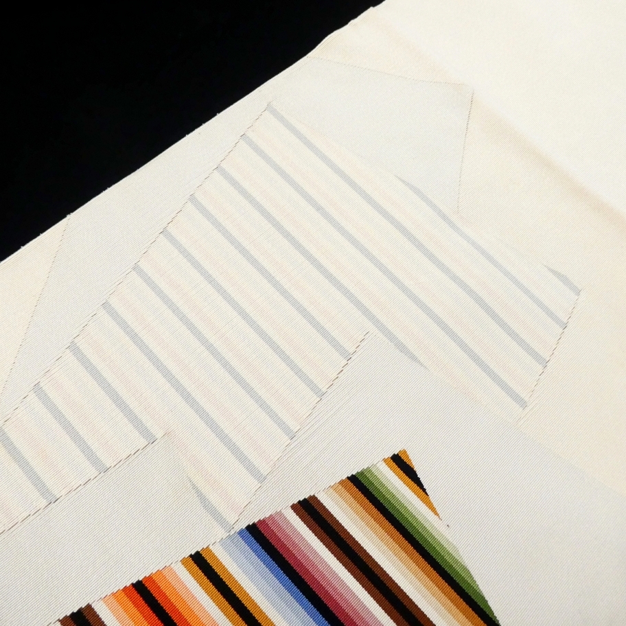 優しいアイボリーの本綴れ地、カラフルストライプの重ね四角文がスタイリッシュな印象♪