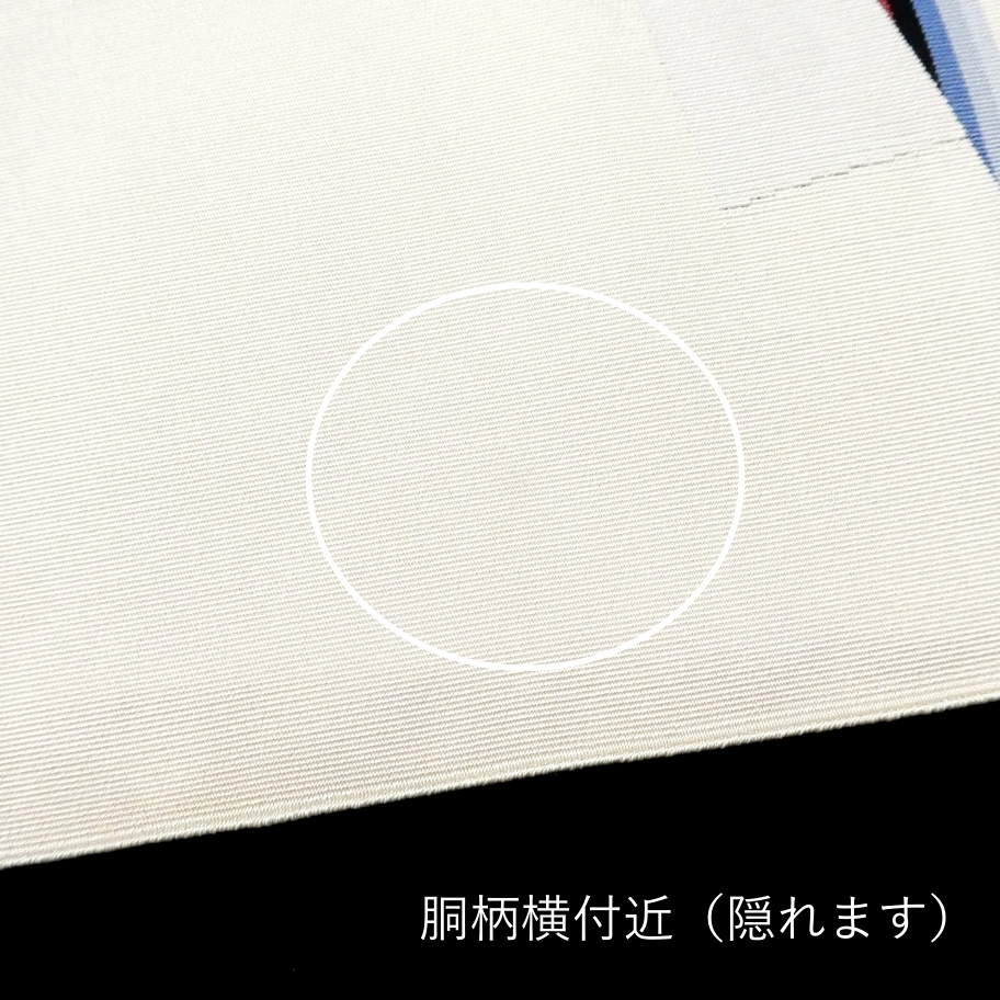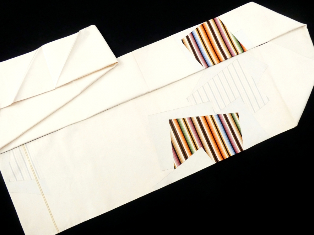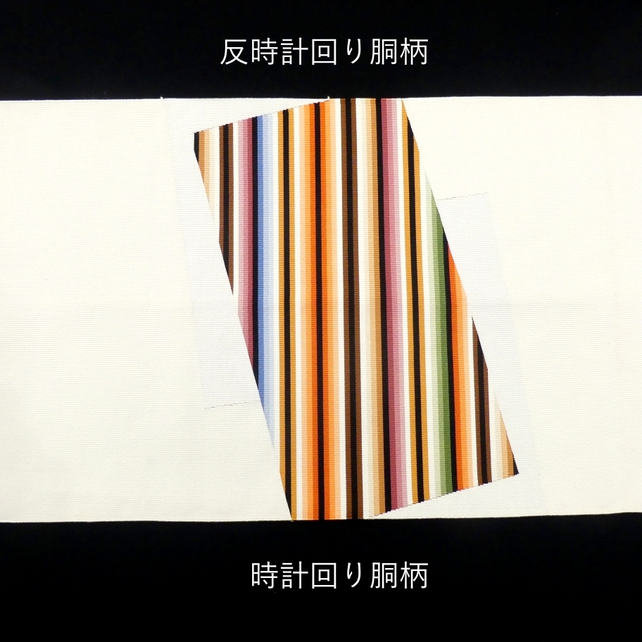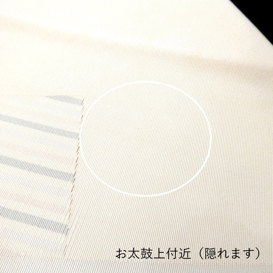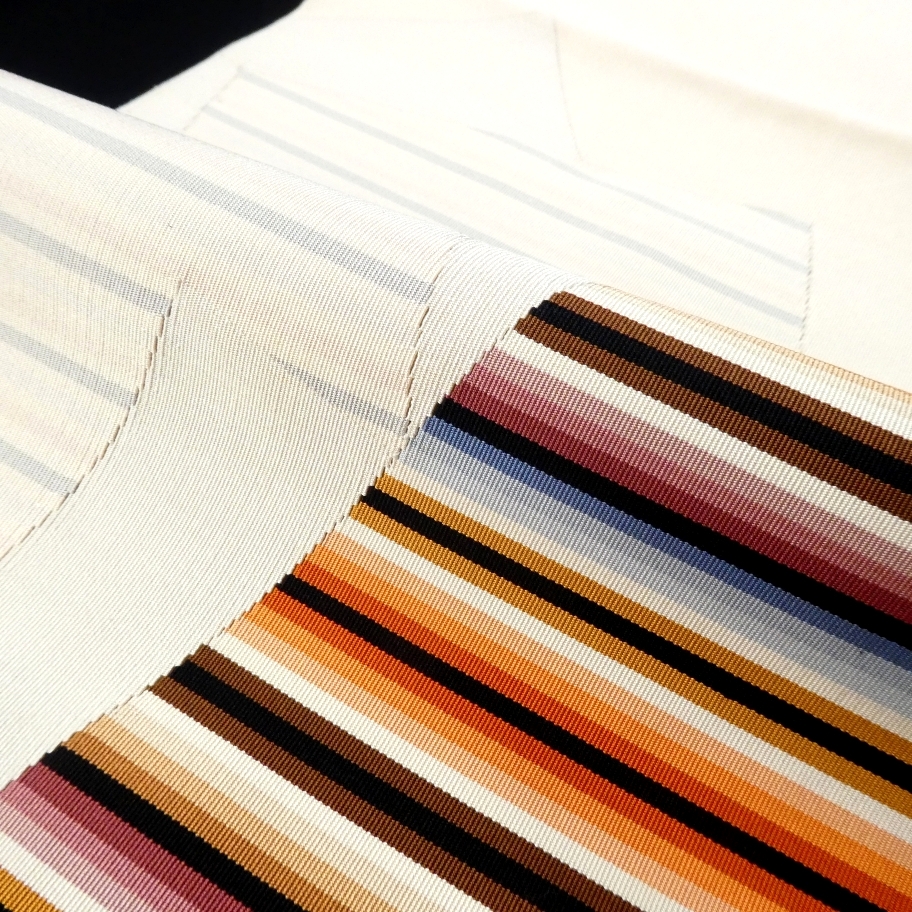 優しいアイボリーの本綴れ地、カラフルストライプの重ね四角文がスタイリッシュな印象♪