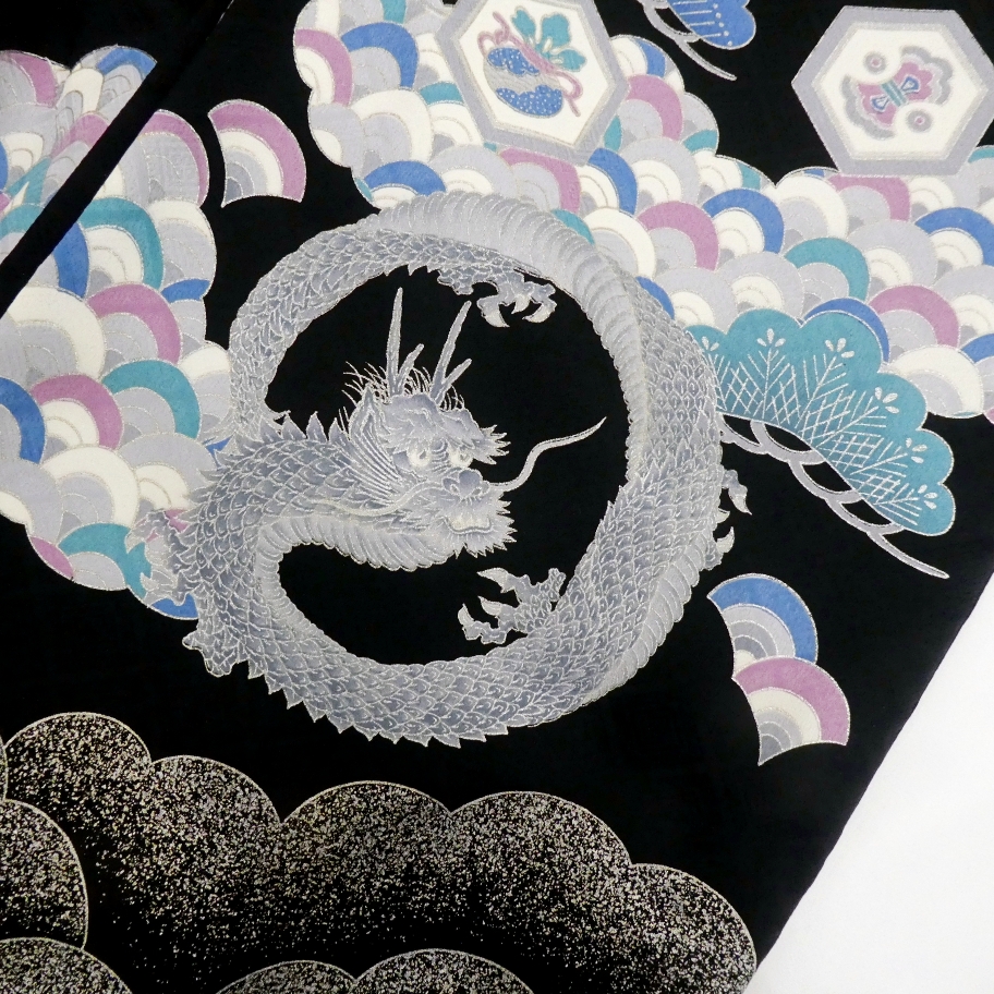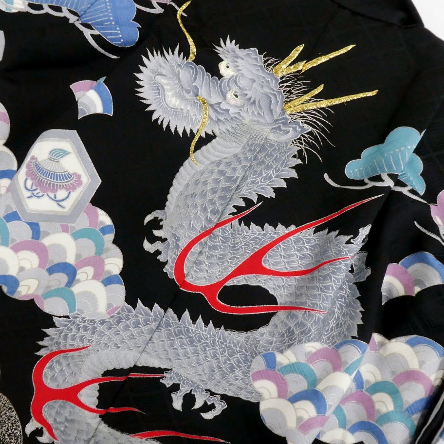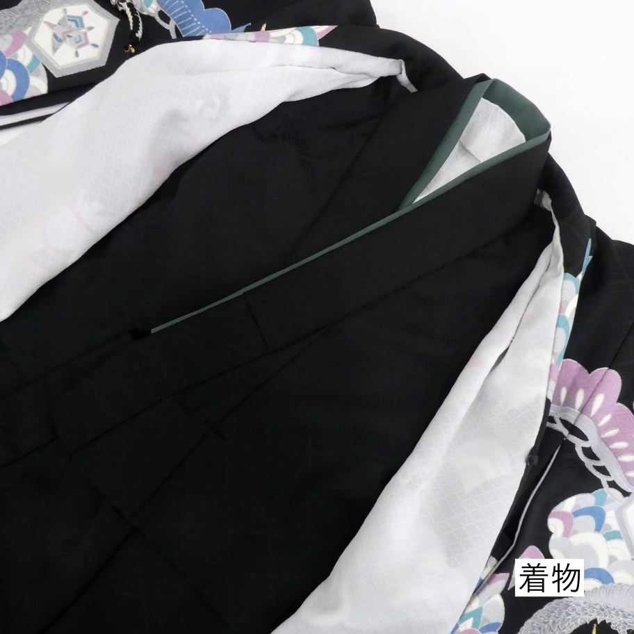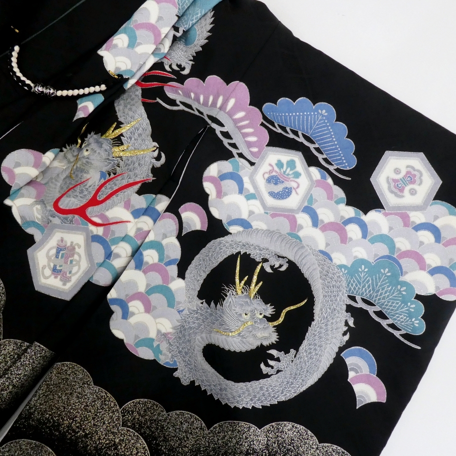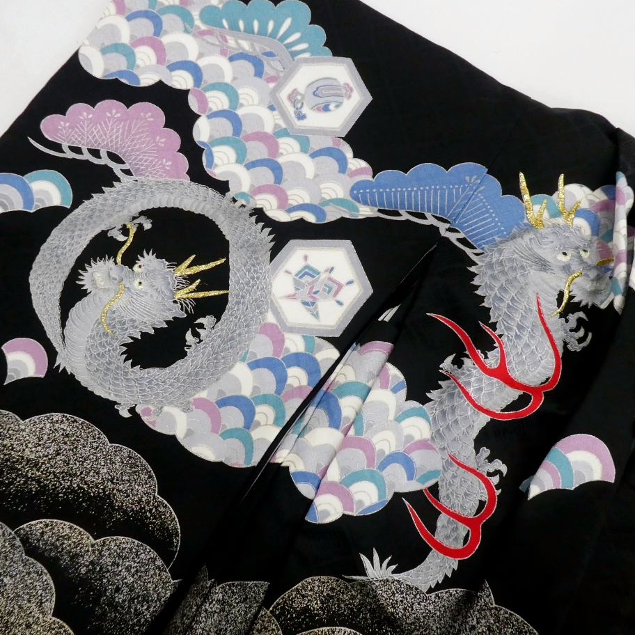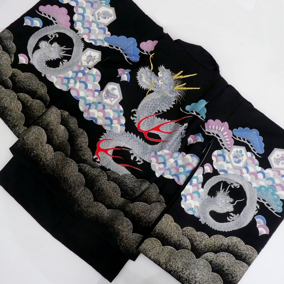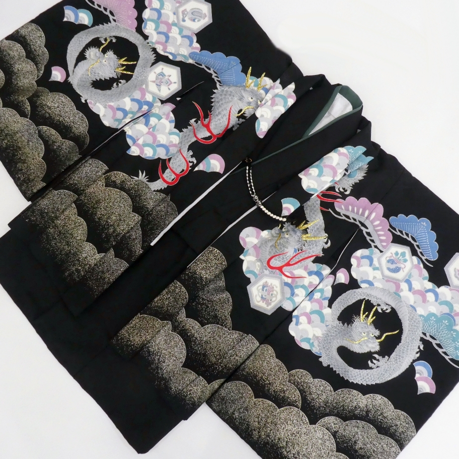 〓雅星〓美品!!子供着物 5歳男児*ブラック*雲取り 龍文*洗える 羽織袴セット《七五三 御祝着 お正月》 販売価格 29,800円 (税込) 購入数 \送料無料/ カートに入れる この商品について問い合わせる お気に入り 特定商取引法に基づく表記 商品詳細 状態ランク: ★★★★ ブラックベースに青海波などの古典模様があしらわれた雲取り文、勇ましい龍も目を惹くインパクトのあるデザイン。 パステルカラーなので印象が強すぎず、程よいやんちゃ感が愛らしい♪ 袴はシルバーを基調としたグラデーション。 羽織・着物・襦袢・袴・角帯・羽織紐・懐剣のセットです。 目立つシミ汚れのない綺麗なお品です。 ☆5歳くらいのお子様向き ※現状は羽織の肩揚げがされています。 お子様の体に合わせて揚げを調整してあげてください♪ サイズ・素材 羽織 裄48cm(揚げ6cm) 肩身丈58cm 袖丈53cm 袴 紐下丈59cm 素材 ポリエステル 状態ランクについて ★★★★★ 超美品・新品・未使用品です。 ★★★★ 中古品ですがダメージの無いお品です。 ★★★ 薄ジミなどがありますが着用時には目立ちません。 ★★ 工夫次第で十分着用可能なお買い得品です ★ 大きめのシミがありますので、リメイク材料等にどうぞ。 >