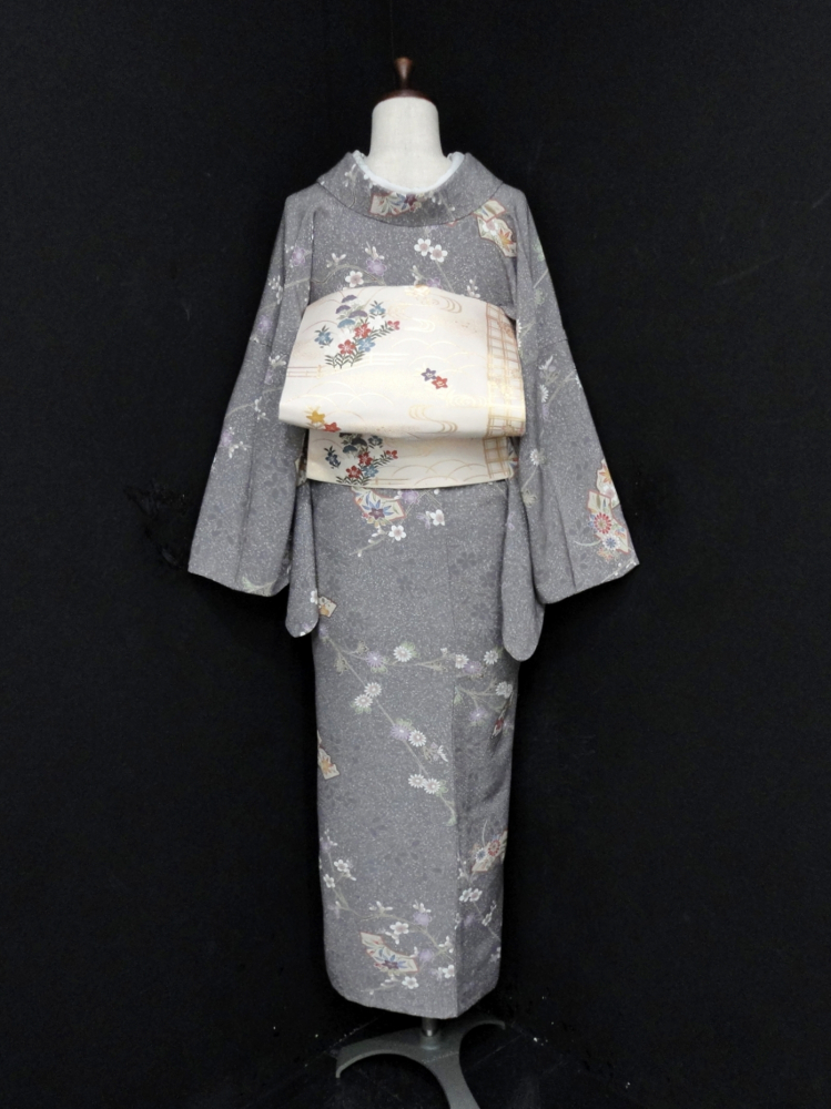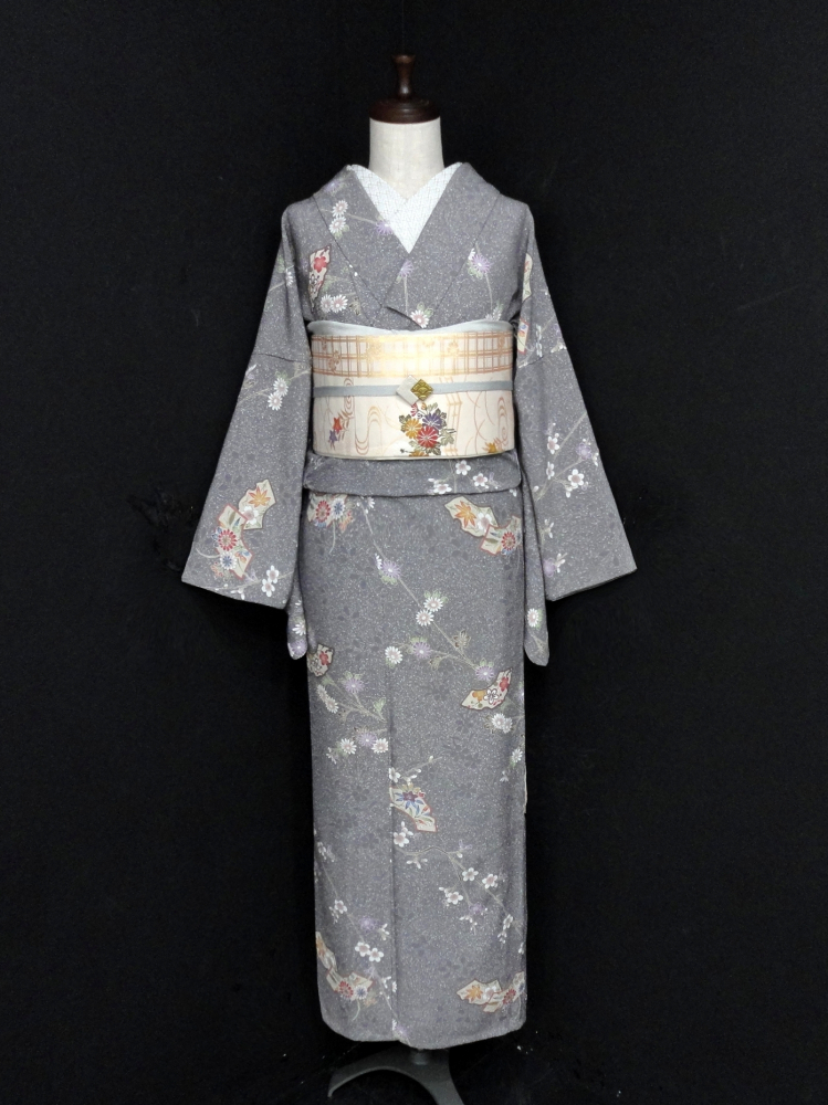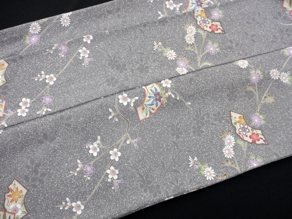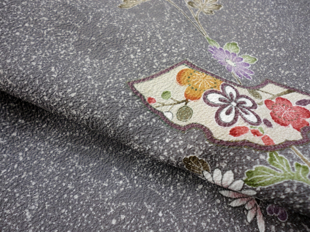 グレーベースに散らし文、色鮮やかな四季の花があしらわれた落ち着きのある上品なデザイン。