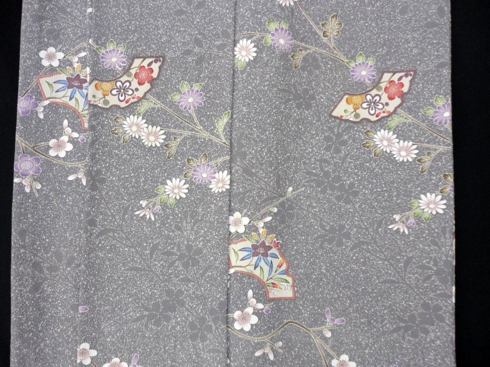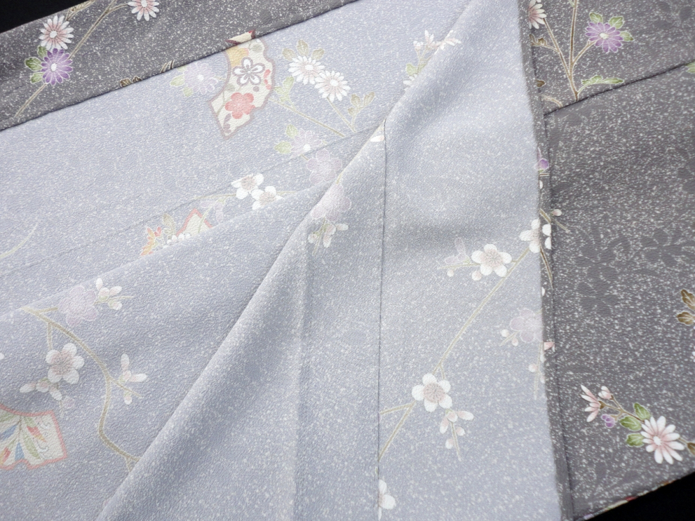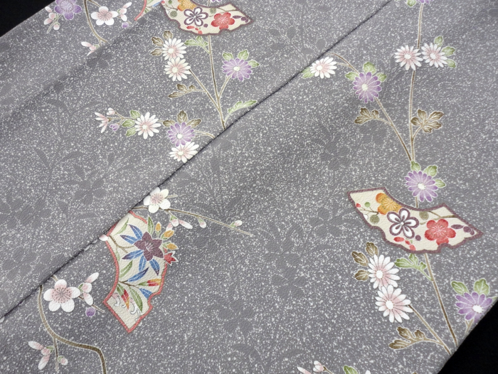 ○雅星○超美!!銀鼠*散らし文 四季の花♪洗える小紋 単衣 裄66.5丈168ロング