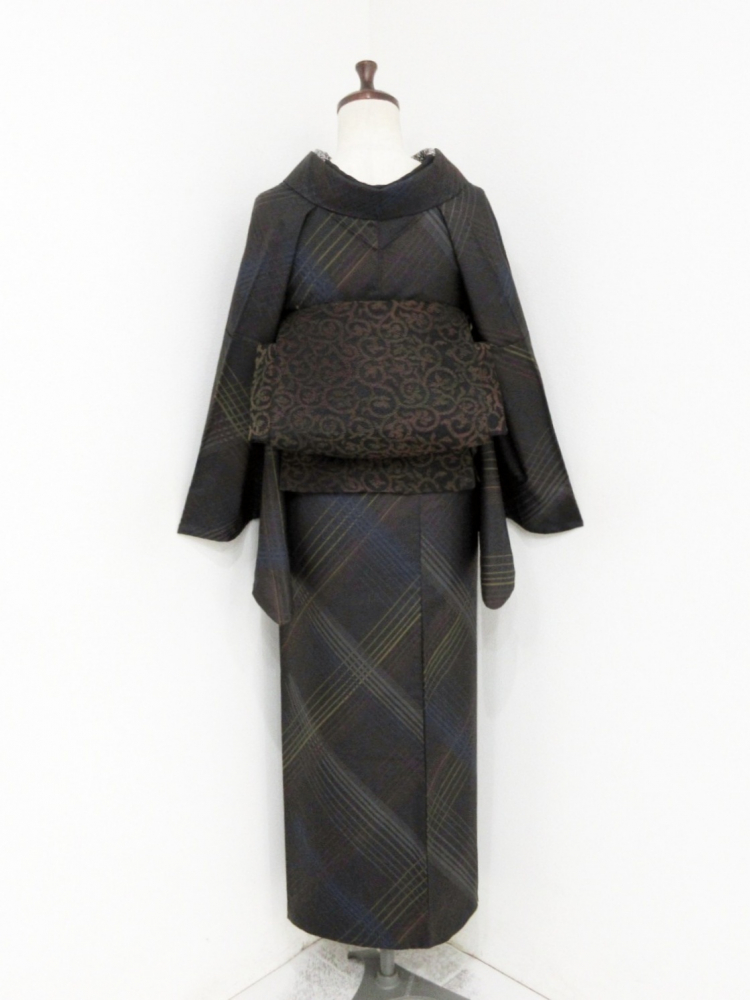 新着商品■雅星■超美!!本場大島紬 ブラック*斜めチェック♪正絹袷 裄64丈161ロング