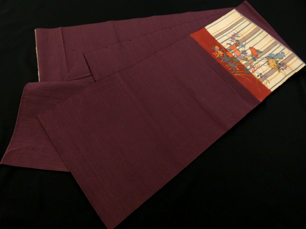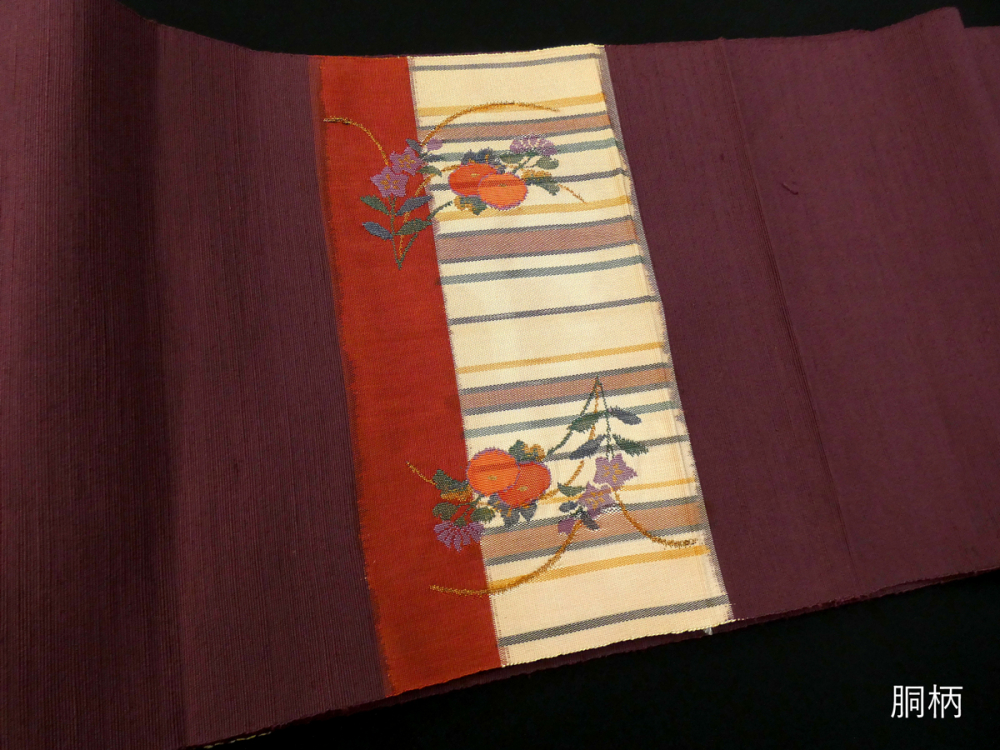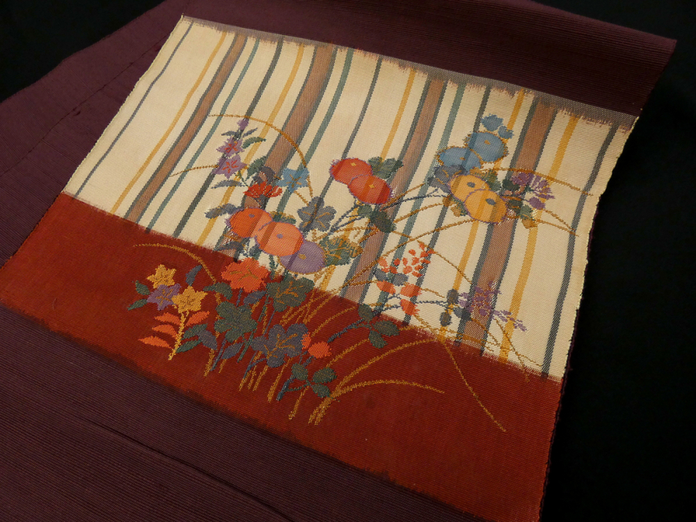 濃い赤茶色ベース、縞模様と草花模様が織り出された上品なデザインです。