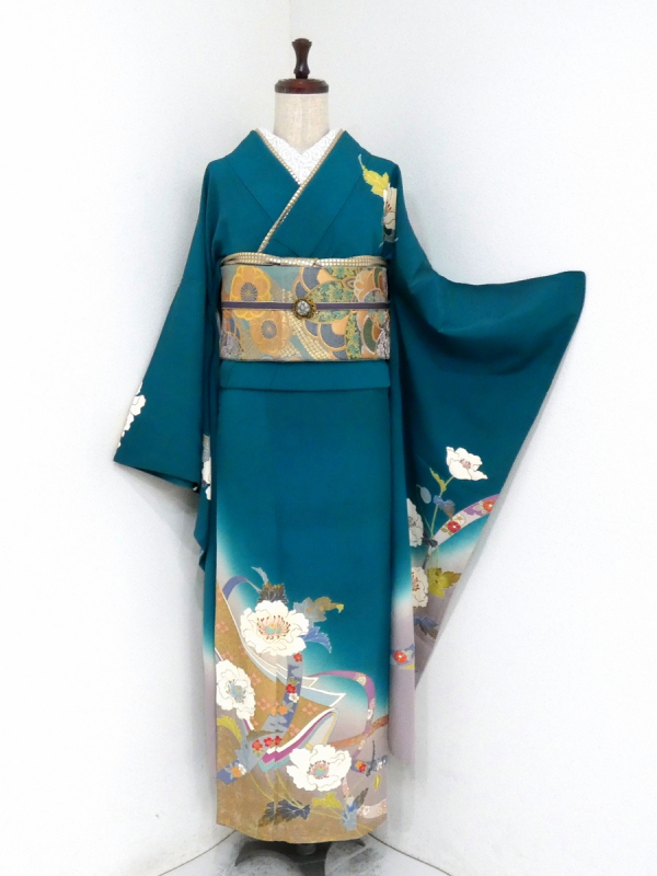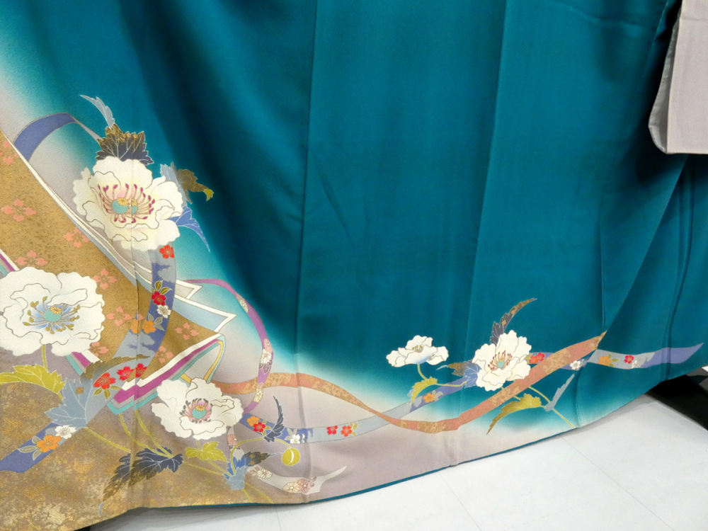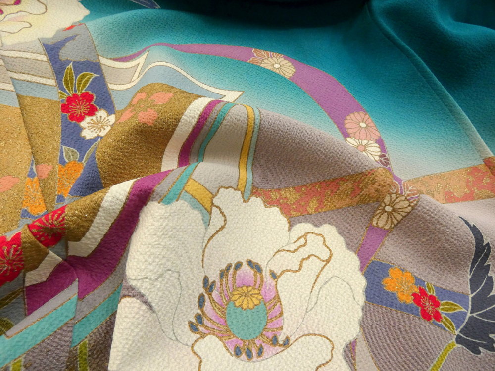 ◆雅星◆超美!!青緑色*縞 鬘帯にポピー 振袖 正絹袷 裄68.5丈166ロング