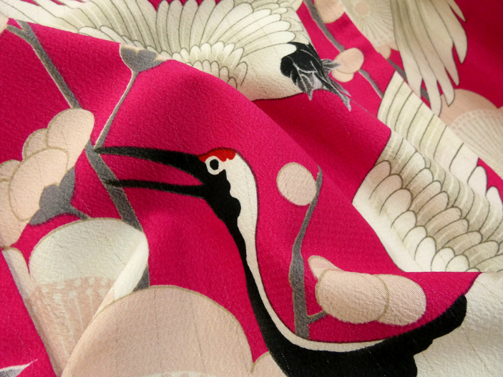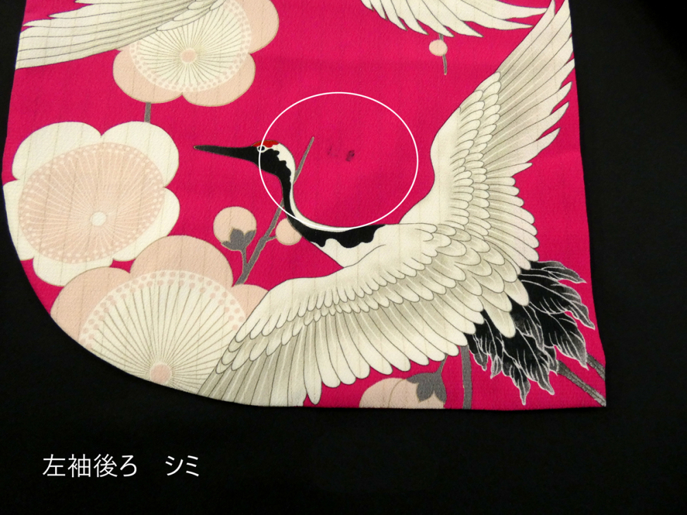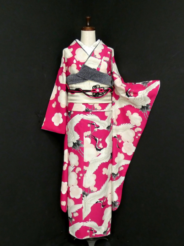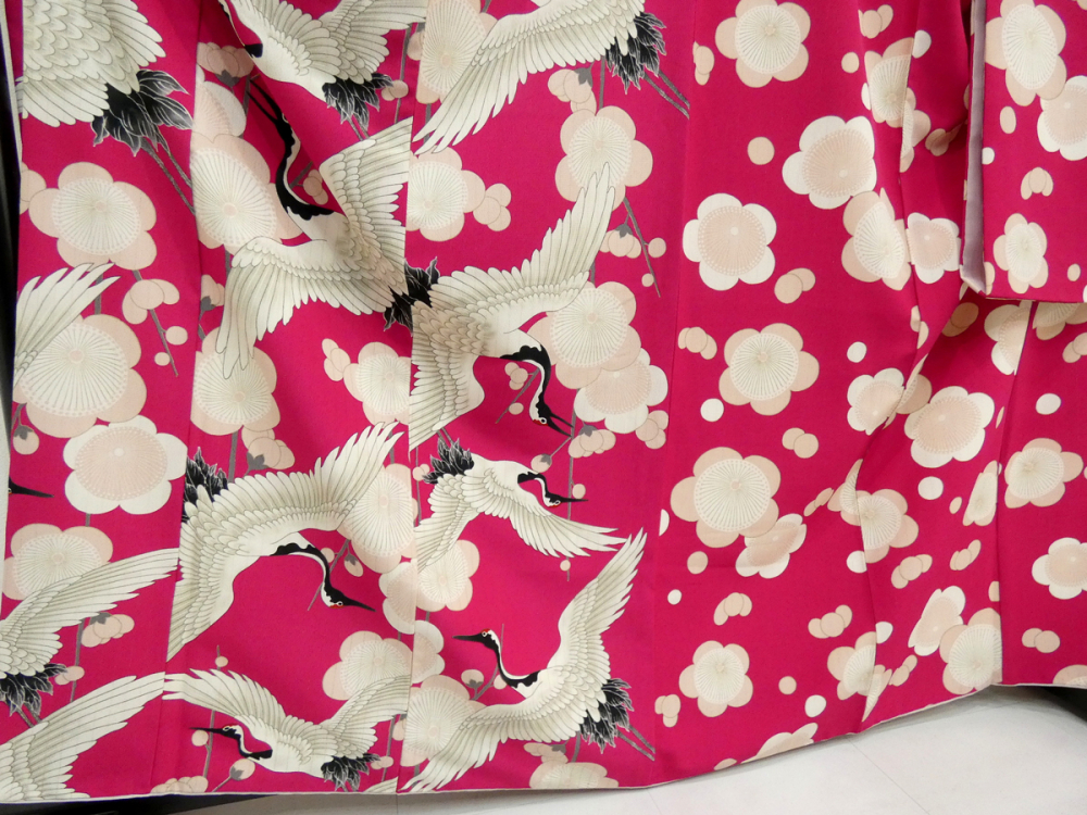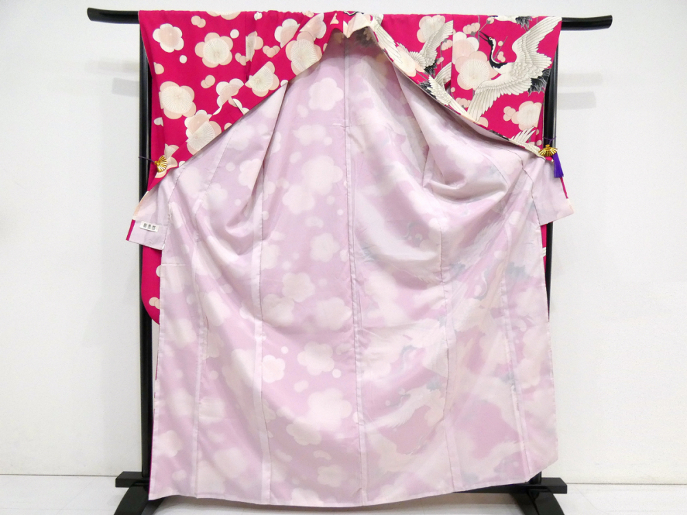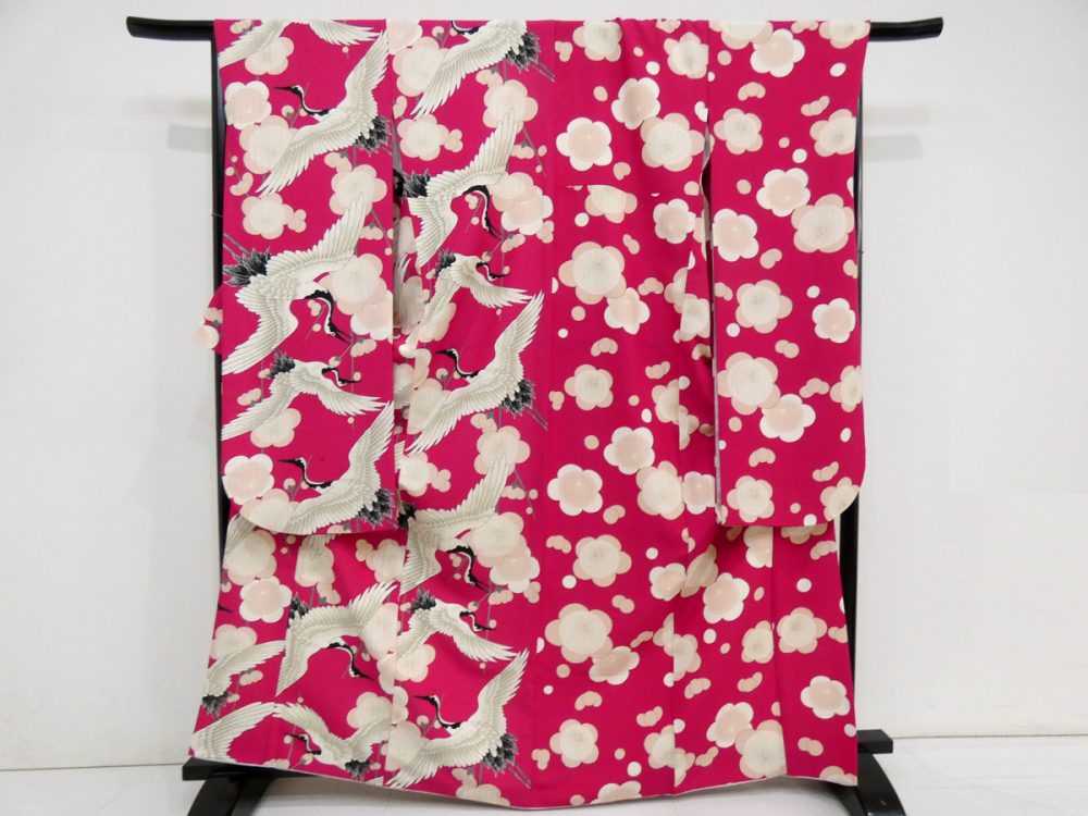 ◆雅星◆良品!!マゼンタ*【和風館】鶴×梅 片身替わり 洗える振袖 袷 裄68.5丈168ロング