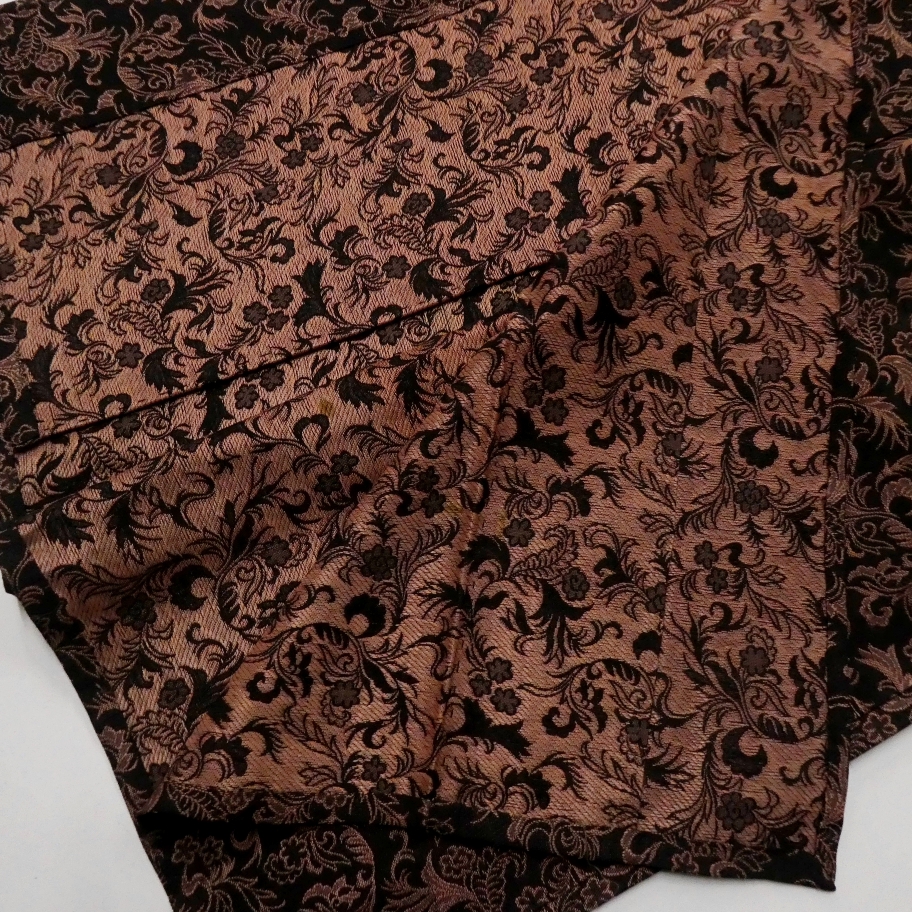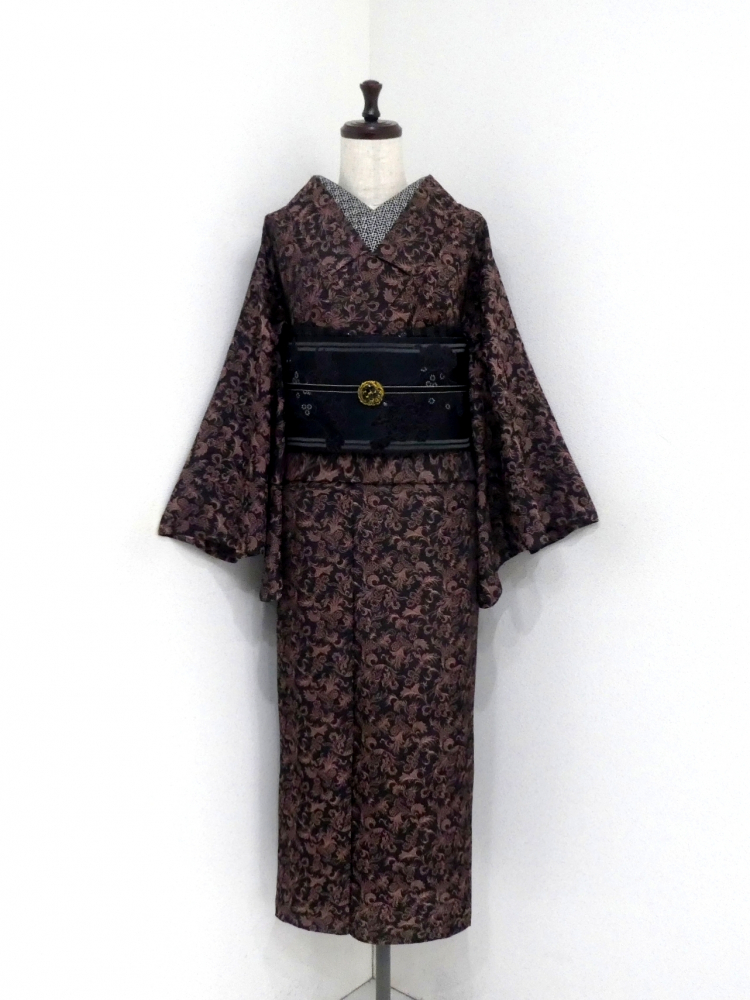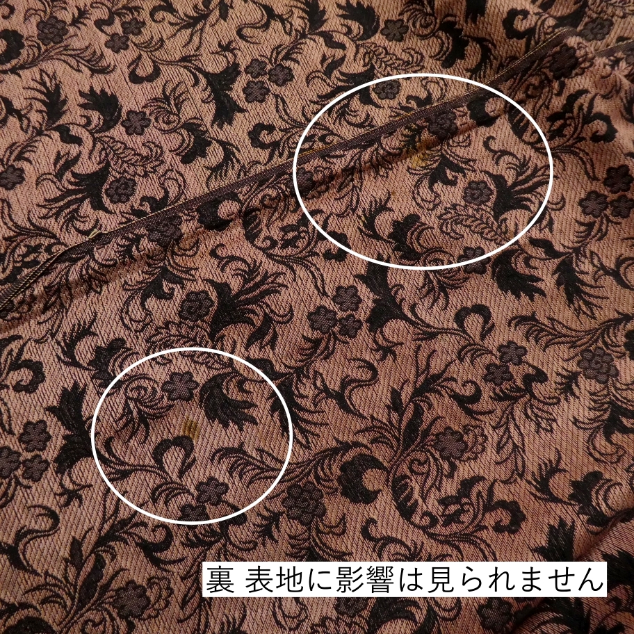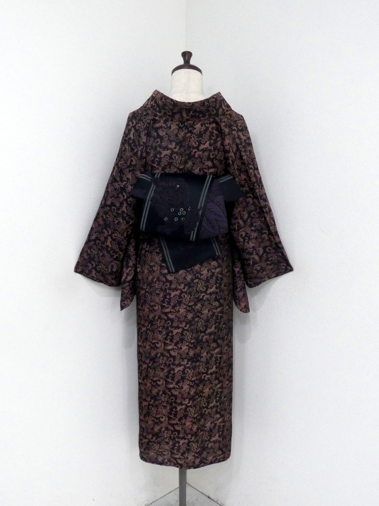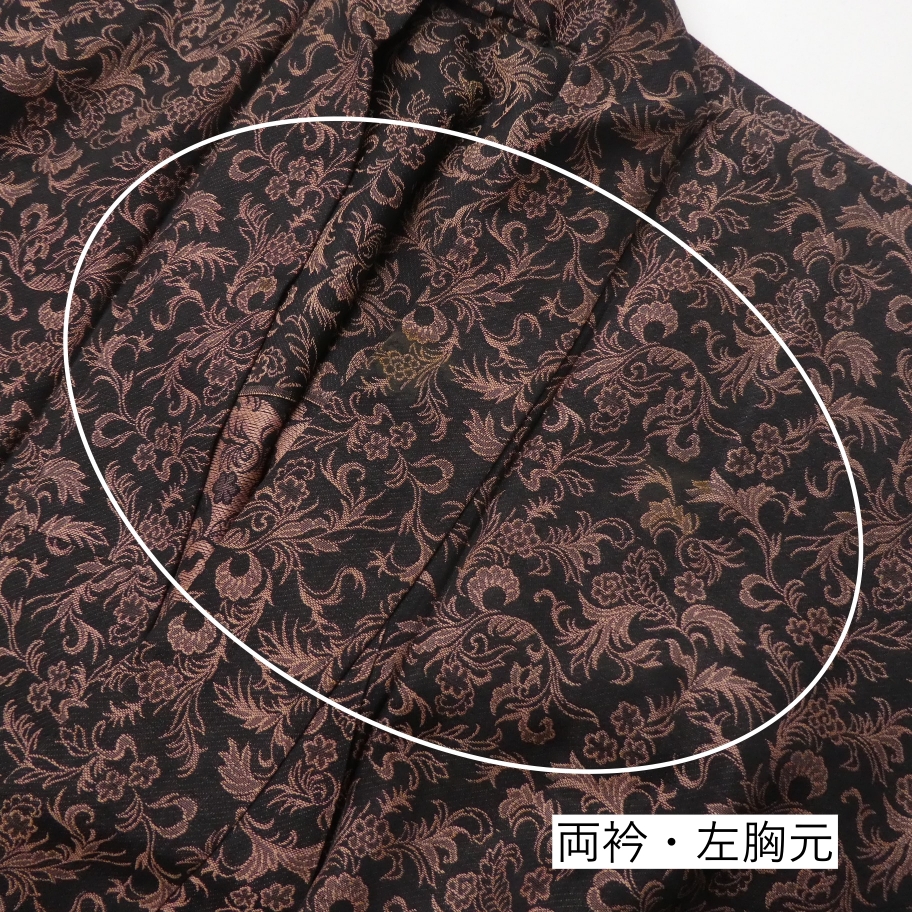 〓雅星〓レトロ!!ブラック×ブラウン*唐花文♪お召し 正絹単衣 裄63丈142 販売価格 15,800円 (税込) sold out この商品について問い合わせる お気に入り 特定商取引法に基づく表記 コーディネートで使用している商品 ★雅星本店オリジナル★新品【唐獅子牡丹】黒紫*リバーシブル《半幅帯》 16,800円(税込) ★雅星本店オリジナル★新品!!ブラック*シマシマ 銀通し 帯揚げ 正絹 【クリックポスト発送】 15,400円(税込) ★雅星本店オリジナル★新品*リバーシブル 縁あり三分紐【クリックポスト発送】 6,600円(税込) 商品詳細 状態ランク: ★★★ ブラックベースにブラウンの唐花模様が織り出されたシックなデザイン。 お召し地なので程よく張りがありつつしなやかなので、キズ崩れもしにくく普段キモノに最適。 人と差のつくこなれた着こなしが楽しめるセミアンティークのお召しです。 《単衣・バチ衿》身長〜147cm位までの方にオススメです。 それ以上の方は対丈や洋服ミックスのスタイリングもお洒落です♪ 生地を重ねると色合いが異なって見える箇所がありますが、ヤケではなく元々の地色だと思います。 衿元に薄シミが見られる為ぐっとお値下げしていますが、色柄に紛れて目立ちにくく感じました。 時代物に慣れた方・色柄を気に入ってくださった方に是非! 着物のみの価格で、帯・小物は含まれておりません。 サイズ・素材 裄 63cm 肩身丈 142cm 袖丈 46cm 袖幅 32cm 前幅 22.5cm 後ろ幅 30cm 内揚げ 0cm 縫込み(袖側) 2cm 縫込み(肩側) 2cm 素材 正絹 状態ランクについて ★★★★★ 超美品・新品・未使用品です。 ★★★★ 中古品ですがダメージの無いお品です。 ★★★ 薄ジミなどがありますが着用時には目立ちません。 ★★ 工夫次第で十分着用可能なお買い得品です ★ 大きめのシミがありますので、リメイク材料等にどうぞ。 _an _hito