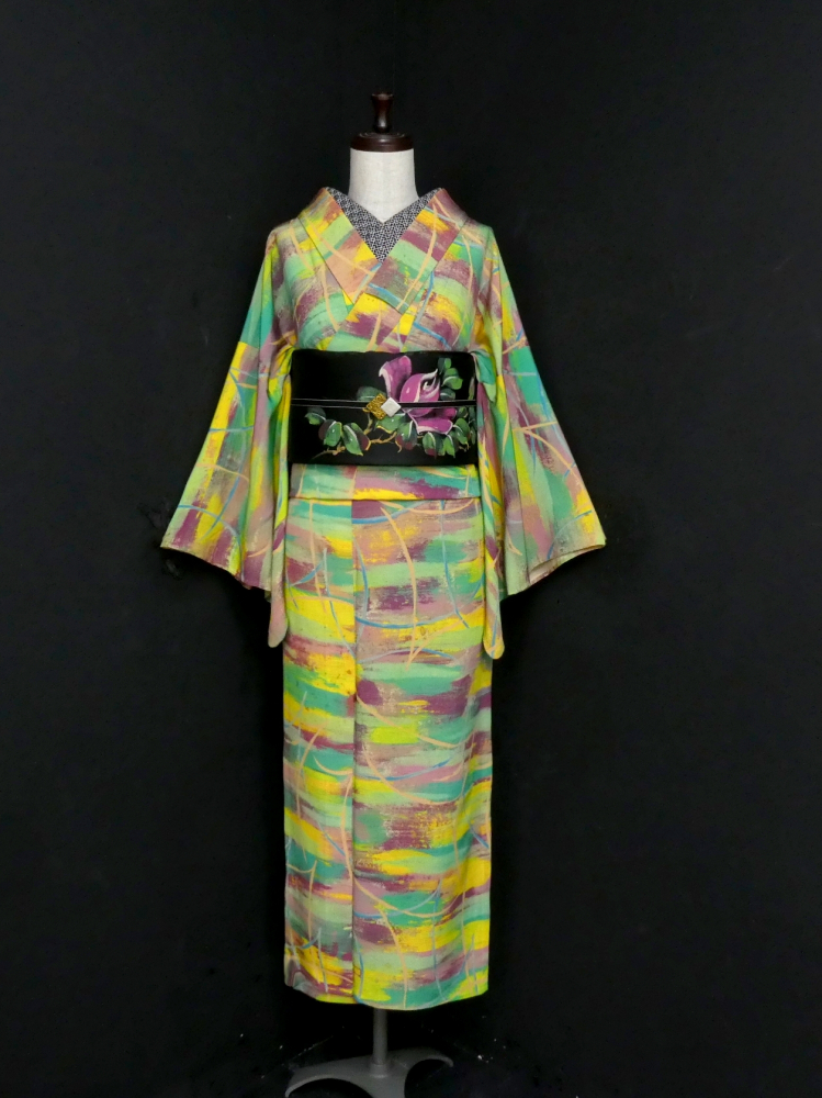 現代にはない色使いで一際目を惹くセミアンティーク小紋です。