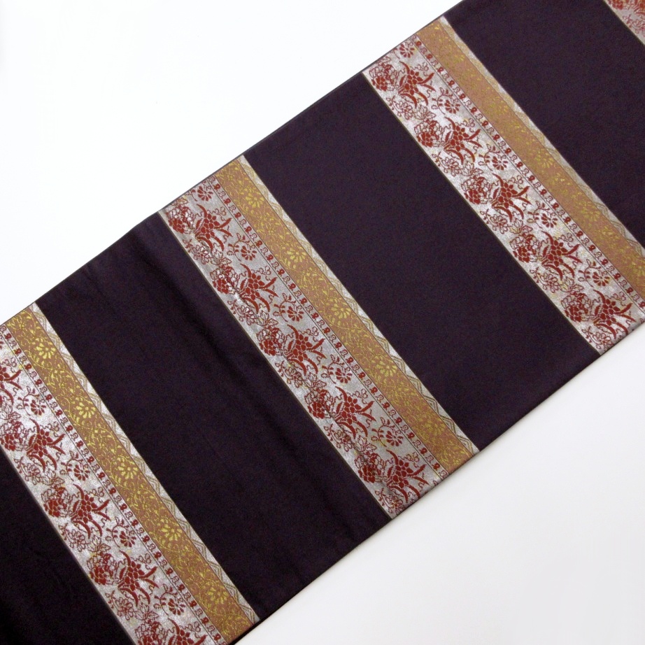 ■雅星■美品!!黒紫*横段 草花文 正絹六通《袋帯》