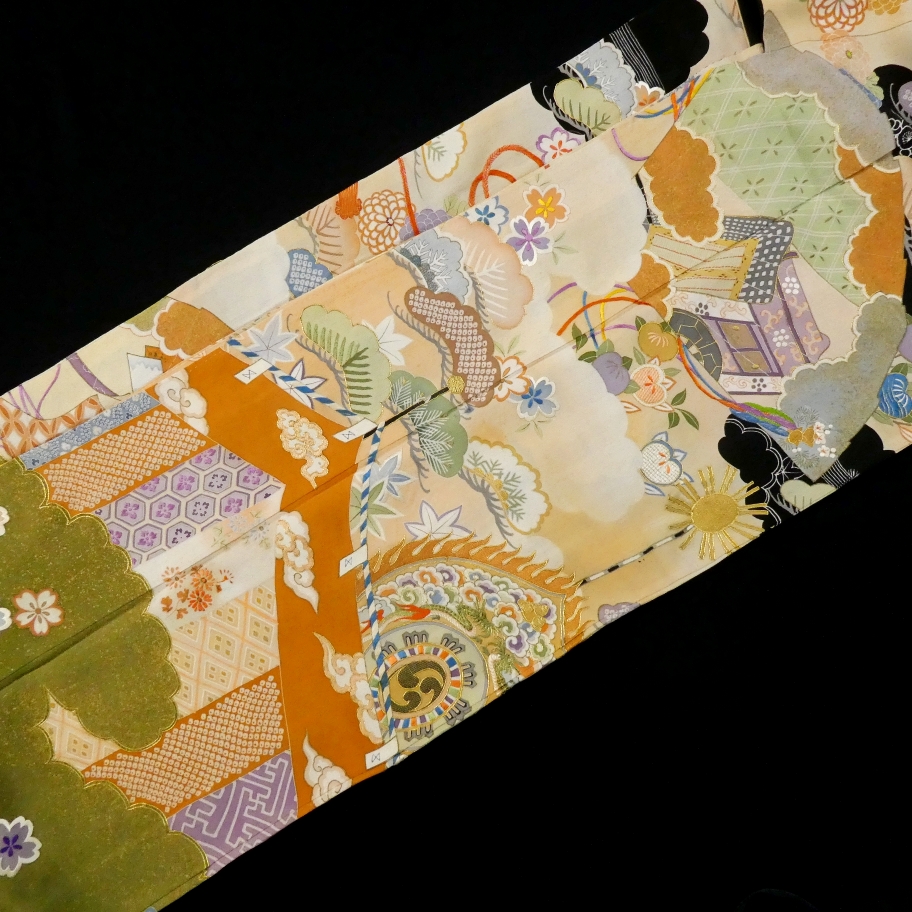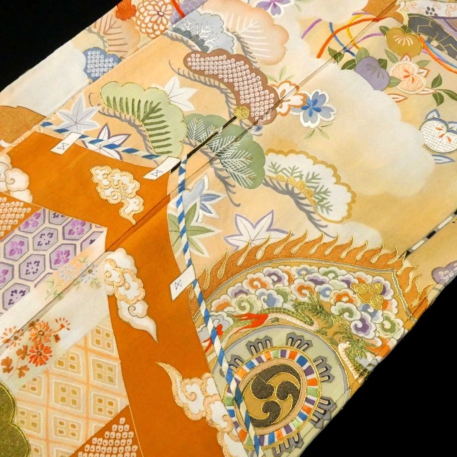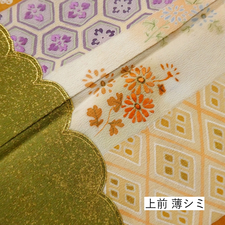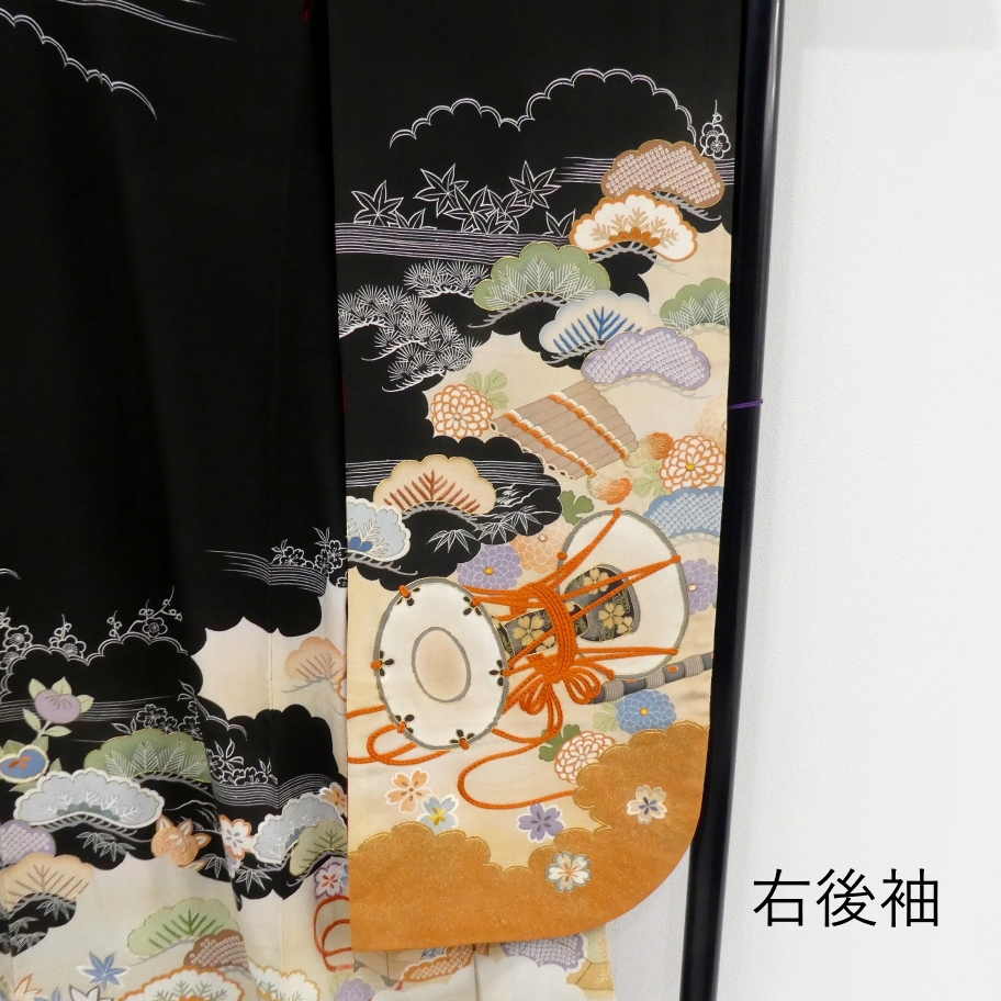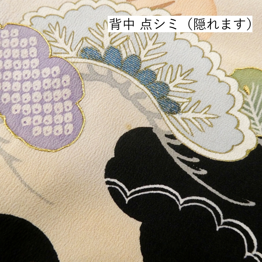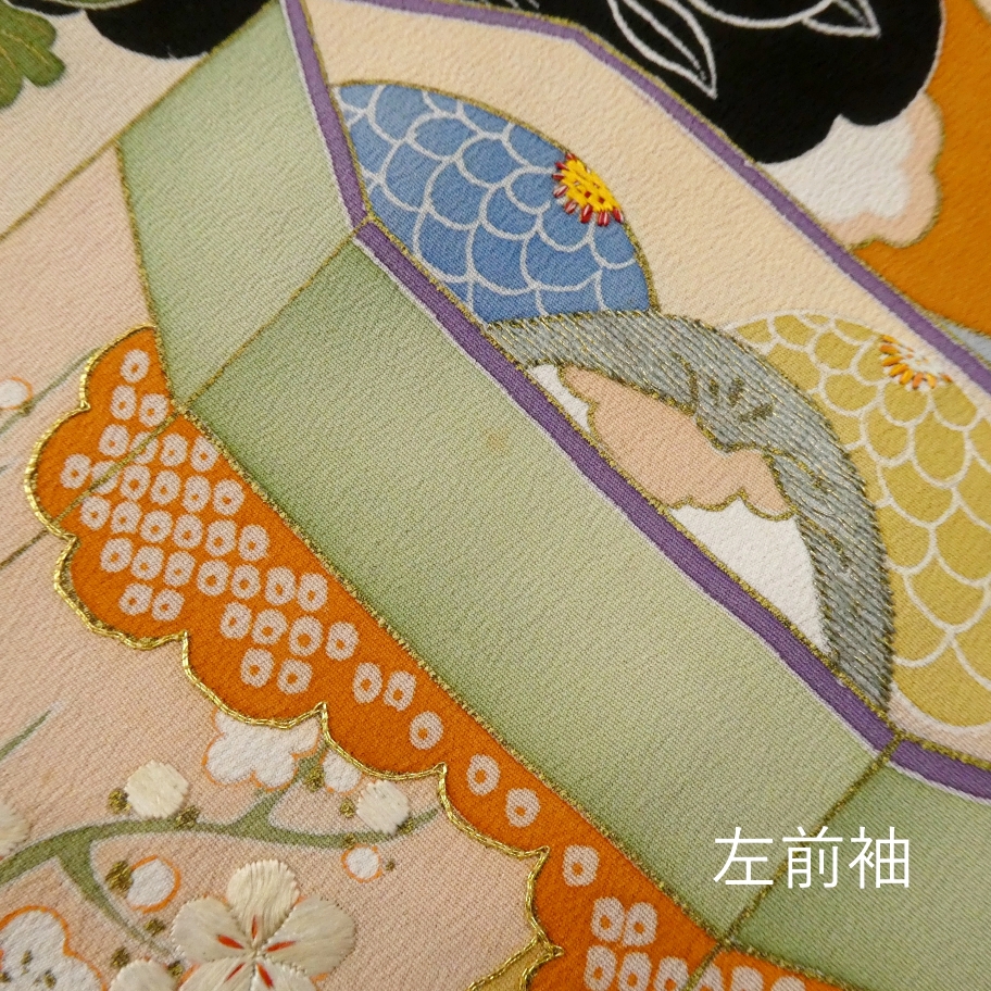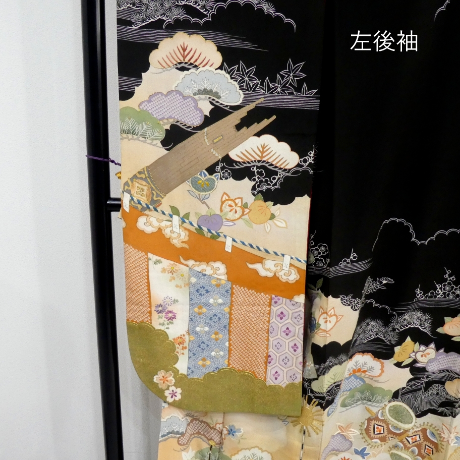〓雅星〓アンティーク!!ブラック*古典文様*一つ紋 引き振袖 正絹袷 裄63.5丈173ロング 販売価格 128,000円 (税込) 購入数 \送料無料/ カートに入れる この商品について問い合わせる お気に入り 特定商取引法に基づく表記 コーディネートで使用している商品 〓雅星〓未使用超美!!ブラック×ゴールド【山本寛斎】唐花文♪正絹全通《袋帯》 49,800円(税込) ■雅星■新品!!ブラック*振袖用 総絞り 正絹帯揚げ 【クリックポスト発送】 16,500円(税込) 商品詳細 状態ランク: ★★★ シボの細かな縮緬地、ずっしりとした重みがあり落ち感も綺麗です。 黒地ベースに鼓や鳳凰・御簾など書ききれないほどの様々な古典柄が施され一際目を惹く豪華さ。 繊細な刺繍や金駒刺繍もあしらわれ、職人の技術が光る逸品です。 引き振袖なのでふき綿仕立てになっており、着物をより美しく魅せデザイン的にもアクセントになっています。 パーティーシーンや成人式など、人と差のつく着こなしが叶うアンティークの引き振袖です。 《袷・広衿》身166〜176cm位までの方にオススメです。 染めの一つ紋入り、引き振袖(花嫁衣裳)なので結婚式のご参列には適しません。 全体にうっすら時代なりの色褪せ、画像の様な薄シミも所々に見られますが 着用時には柄に紛れ目立ちにくいです。 金駒刺繍の留めが一部弱っている箇所がありますが着用には何ら問題ありません。 酷く目立つダメージはなく、時代物の中ではかなり状態の良い綺麗なお品です。 着物のみの価格で、帯・小物は含まれておりません。 サイズ・素材 裄 63.5cm 肩身丈 173cm 袖丈 107cm 袖幅 33cm 前幅 22.5cm 後ろ幅 30cm 内揚げ 0cm 縫込み(袖側) 1cm 縫込み(肩側) 3cm 素材 正絹 状態ランクについて ★★★★★ 超美品・新品・未使用品です。 ★★★★ 中古品ですがダメージの無いお品です。 ★★★ 薄ジミなどがありますが着用時には目立ちません。 ★★ 工夫次第で十分着用可能なお買い得品です ★ 大きめのシミがありますので、リメイク材料等にどうぞ。 _furi _fo