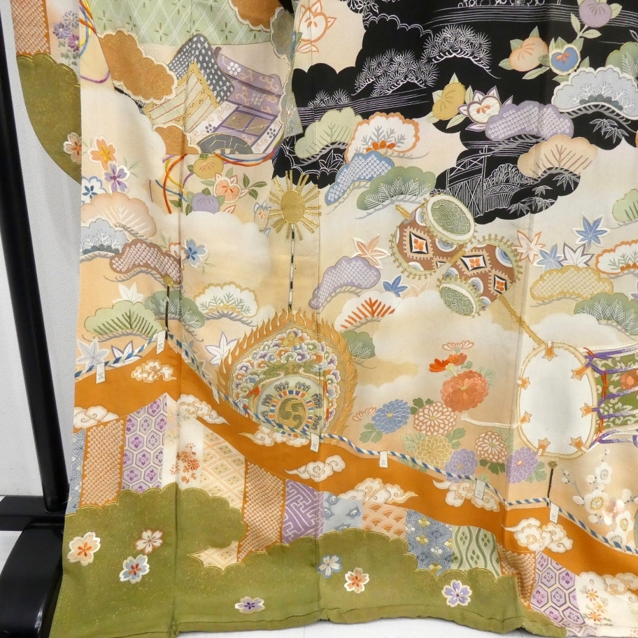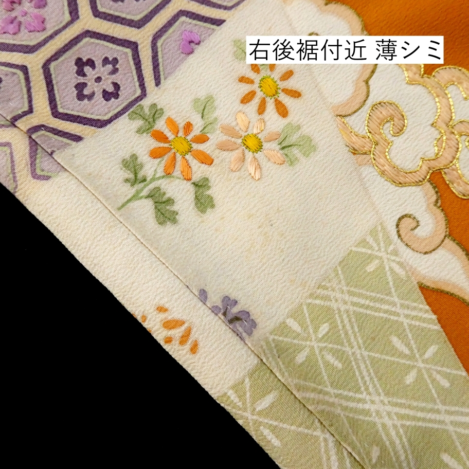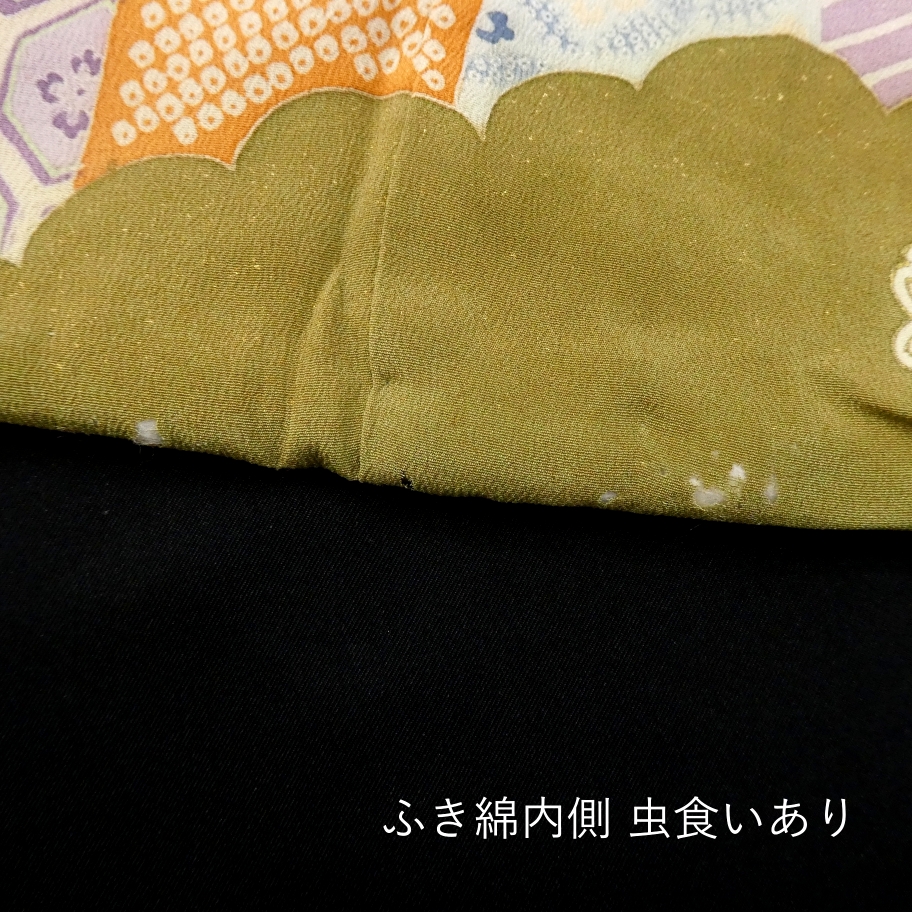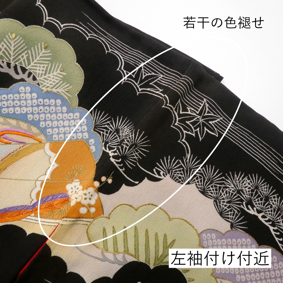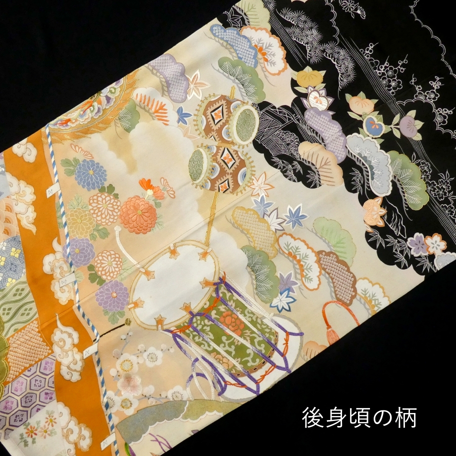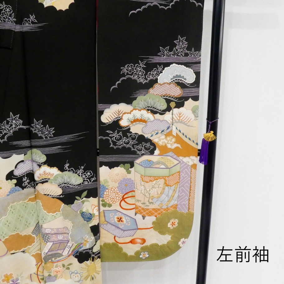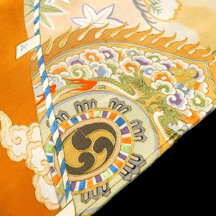 〓雅星〓アンティーク!!ブラック*古典文様*一つ紋 引き振袖 正絹袷 裄63.5丈173ロング 販売価格 128,000円 (税込) 購入数 \送料無料/ カートに入れる この商品について問い合わせる お気に入り 特定商取引法に基づく表記 コーディネートで使用している商品 〓雅星〓未使用超美!!ブラック×ゴールド【山本寛斎】唐花文♪正絹全通《袋帯》 49,800円(税込) ■雅星■新品!!ブラック*振袖用 総絞り 正絹帯揚げ 【クリックポスト発送】 16,500円(税込) 商品詳細 状態ランク: ★★★ シボの細かな縮緬地、ずっしりとした重みがあり落ち感も綺麗です。 黒地ベースに鼓や鳳凰・御簾など書ききれないほどの様々な古典柄が施され一際目を惹く豪華さ。 繊細な刺繍や金駒刺繍もあしらわれ、職人の技術が光る逸品です。 引き振袖なのでふき綿仕立てになっており、着物をより美しく魅せデザイン的にもアクセントになっています。 パーティーシーンや成人式など、人と差のつく着こなしが叶うアンティークの引き振袖です。 《袷・広衿》身166〜176cm位までの方にオススメです。 染めの一つ紋入り、引き振袖(花嫁衣裳)なので結婚式のご参列には適しません。 全体にうっすら時代なりの色褪せ、画像の様な薄シミも所々に見られますが 着用時には柄に紛れ目立ちにくいです。 金駒刺繍の留めが一部弱っている箇所がありますが着用には何ら問題ありません。 酷く目立つダメージはなく、時代物の中ではかなり状態の良い綺麗なお品です。 着物のみの価格で、帯・小物は含まれておりません。 サイズ・素材 裄 63.5cm 肩身丈 173cm 袖丈 107cm 袖幅 33cm 前幅 22.5cm 後ろ幅 30cm 内揚げ 0cm 縫込み(袖側) 1cm 縫込み(肩側) 3cm 素材 正絹 状態ランクについて ★★★★★ 超美品・新品・未使用品です。 ★★★★ 中古品ですがダメージの無いお品です。 ★★★ 薄ジミなどがありますが着用時には目立ちません。 ★★ 工夫次第で十分着用可能なお買い得品です ★ 大きめのシミがありますので、リメイク材料等にどうぞ。 _furi _fo