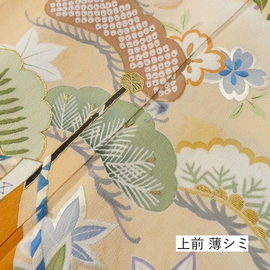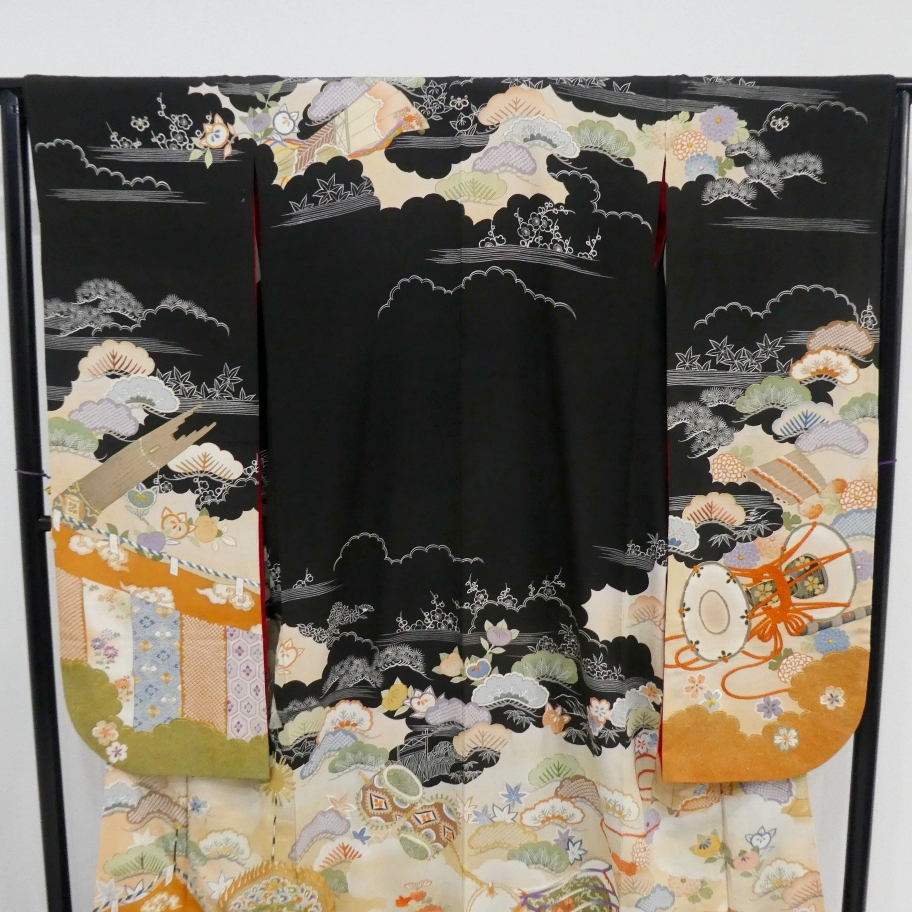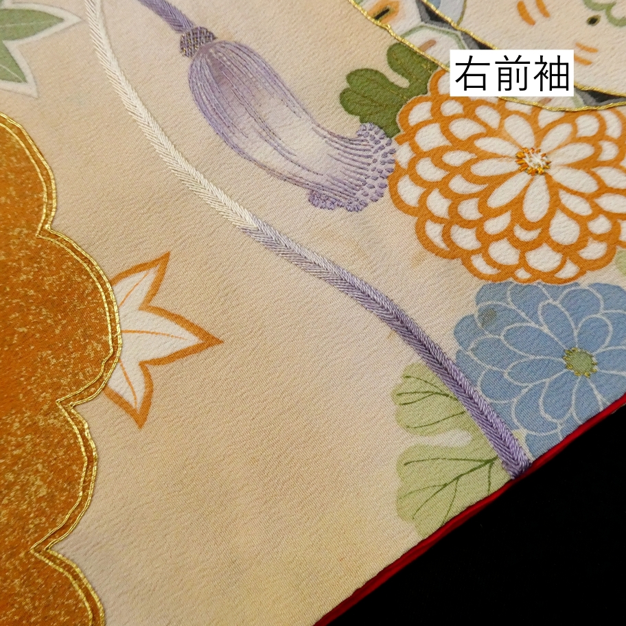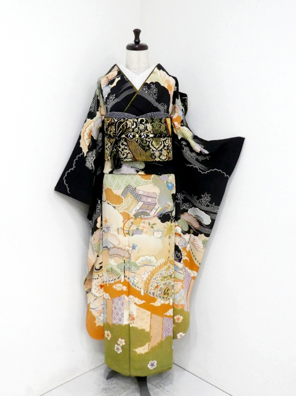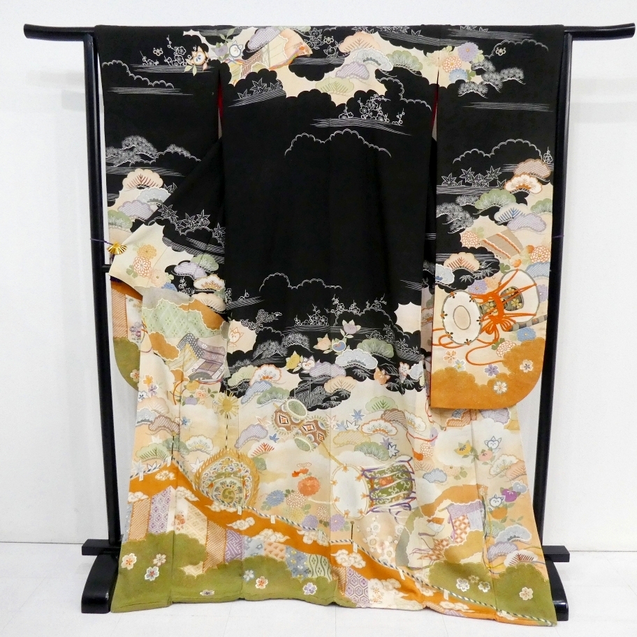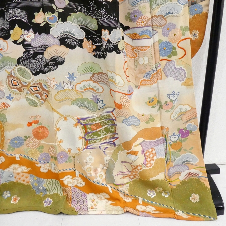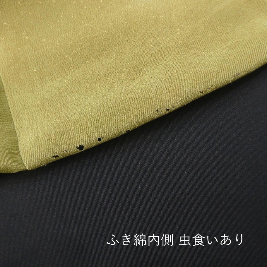 〓雅星〓アンティーク!!ブラック*古典文様*一つ紋 引き振袖 正絹袷 裄63.5丈173ロング 販売価格 128,000円 (税込) 購入数 \送料無料/ カートに入れる この商品について問い合わせる お気に入り 特定商取引法に基づく表記 コーディネートで使用している商品 〓雅星〓未使用超美!!ブラック×ゴールド【山本寛斎】唐花文♪正絹全通《袋帯》 49,800円(税込) ■雅星■新品!!ブラック*振袖用 総絞り 正絹帯揚げ 【クリックポスト発送】 16,500円(税込) 商品詳細 状態ランク: ★★★ シボの細かな縮緬地、ずっしりとした重みがあり落ち感も綺麗です。 黒地ベースに鼓や鳳凰・御簾など書ききれないほどの様々な古典柄が施され一際目を惹く豪華さ。 繊細な刺繍や金駒刺繍もあしらわれ、職人の技術が光る逸品です。 引き振袖なのでふき綿仕立てになっており、着物をより美しく魅せデザイン的にもアクセントになっています。 パーティーシーンや成人式など、人と差のつく着こなしが叶うアンティークの引き振袖です。 《袷・広衿》身166〜176cm位までの方にオススメです。 染めの一つ紋入り、引き振袖(花嫁衣裳)なので結婚式のご参列には適しません。 全体にうっすら時代なりの色褪せ、画像の様な薄シミも所々に見られますが 着用時には柄に紛れ目立ちにくいです。 金駒刺繍の留めが一部弱っている箇所がありますが着用には何ら問題ありません。 酷く目立つダメージはなく、時代物の中ではかなり状態の良い綺麗なお品です。 着物のみの価格で、帯・小物は含まれておりません。 サイズ・素材 裄 63.5cm 肩身丈 173cm 袖丈 107cm 袖幅 33cm 前幅 22.5cm 後ろ幅 30cm 内揚げ 0cm 縫込み(袖側) 1cm 縫込み(肩側) 3cm 素材 正絹 状態ランクについて ★★★★★ 超美品・新品・未使用品です。 ★★★★ 中古品ですがダメージの無いお品です。 ★★★ 薄ジミなどがありますが着用時には目立ちません。 ★★ 工夫次第で十分着用可能なお買い得品です ★ 大きめのシミがありますので、リメイク材料等にどうぞ。 _furi _fo
