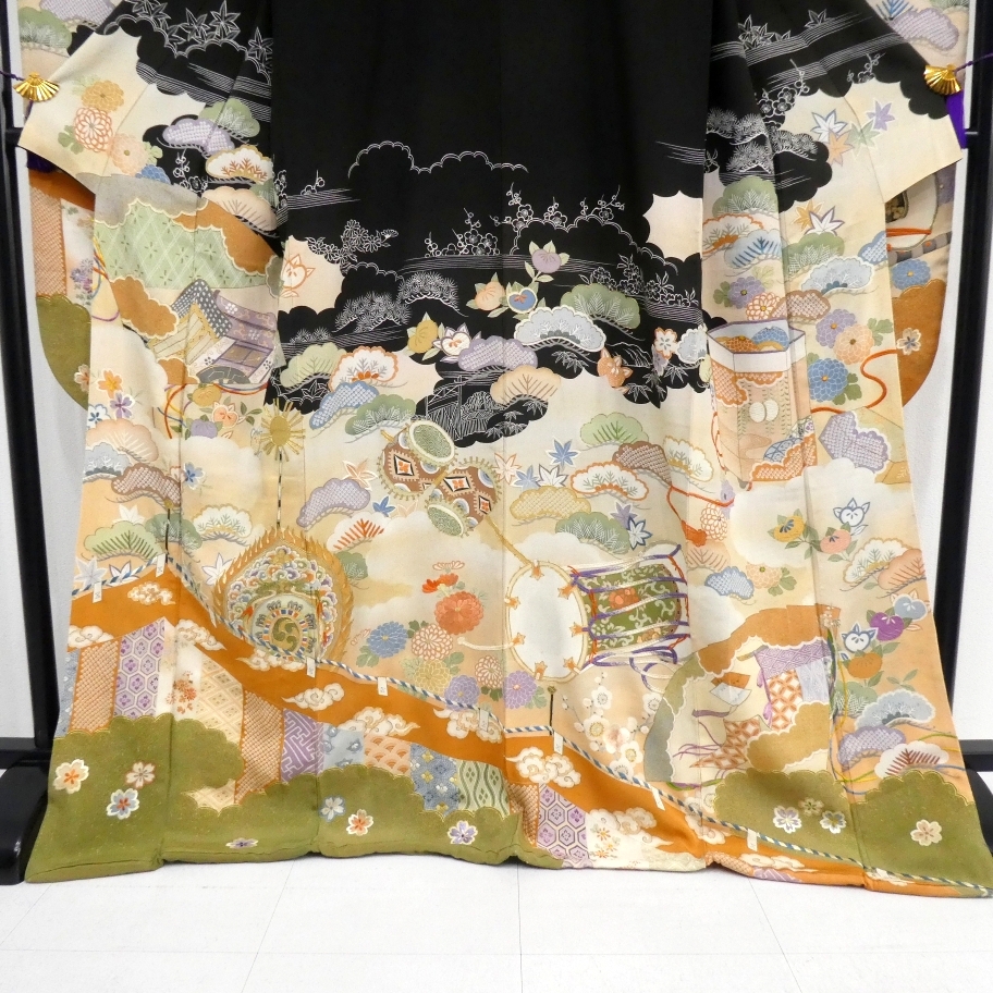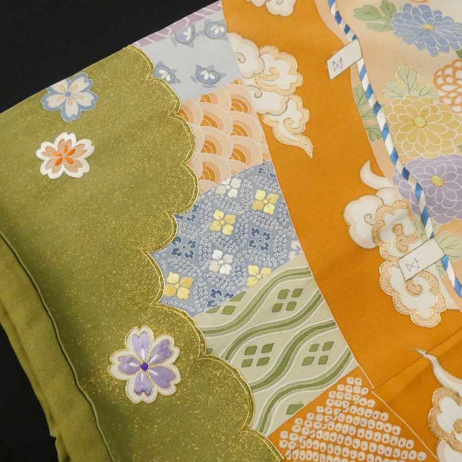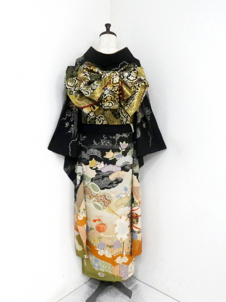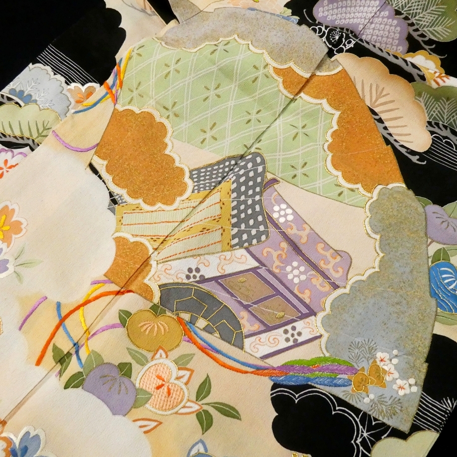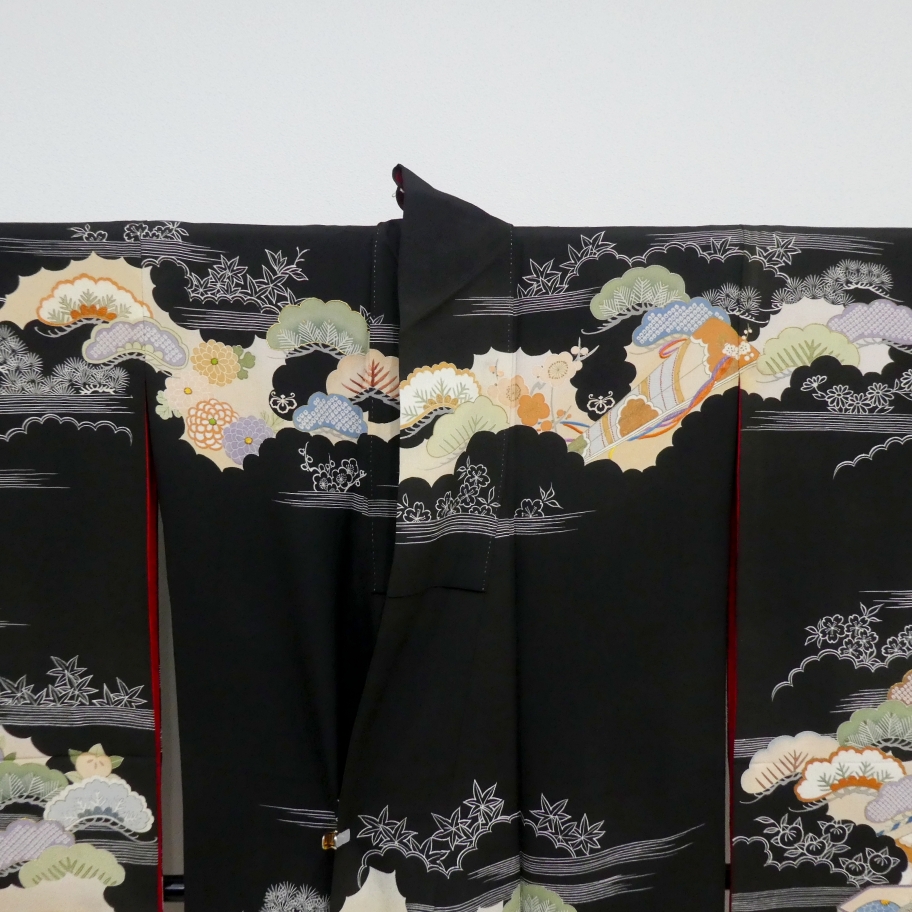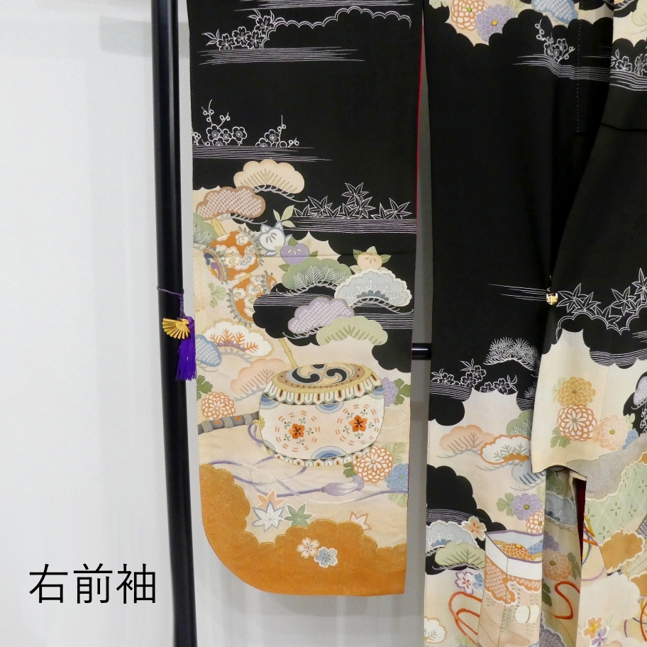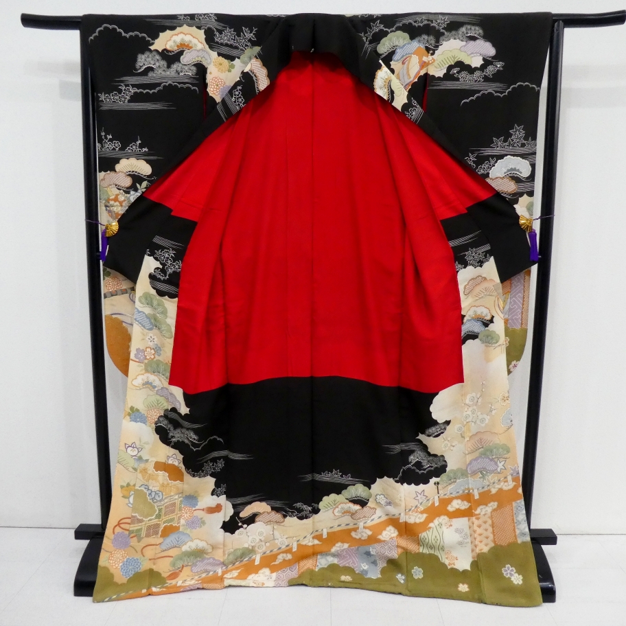 〓雅星〓アンティーク!!ブラック*古典文様*一つ紋 引き振袖 正絹袷 裄63.5丈173ロング 販売価格 128,000円 (税込) 購入数 \送料無料/ カートに入れる この商品について問い合わせる お気に入り 特定商取引法に基づく表記 コーディネートで使用している商品 〓雅星〓未使用超美!!ブラック×ゴールド【山本寛斎】唐花文♪正絹全通《袋帯》 49,800円(税込) ■雅星■新品!!ブラック*振袖用 総絞り 正絹帯揚げ 【クリックポスト発送】 16,500円(税込) 商品詳細 状態ランク: ★★★ シボの細かな縮緬地、ずっしりとした重みがあり落ち感も綺麗です。 黒地ベースに鼓や鳳凰・御簾など書ききれないほどの様々な古典柄が施され一際目を惹く豪華さ。 繊細な刺繍や金駒刺繍もあしらわれ、職人の技術が光る逸品です。 引き振袖なのでふき綿仕立てになっており、着物をより美しく魅せデザイン的にもアクセントになっています。 パーティーシーンや成人式など、人と差のつく着こなしが叶うアンティークの引き振袖です。 《袷・広衿》身166〜176cm位までの方にオススメです。 染めの一つ紋入り、引き振袖(花嫁衣裳)なので結婚式のご参列には適しません。 全体にうっすら時代なりの色褪せ、画像の様な薄シミも所々に見られますが 着用時には柄に紛れ目立ちにくいです。 金駒刺繍の留めが一部弱っている箇所がありますが着用には何ら問題ありません。 酷く目立つダメージはなく、時代物の中ではかなり状態の良い綺麗なお品です。 着物のみの価格で、帯・小物は含まれておりません。 サイズ・素材 裄 63.5cm 肩身丈 173cm 袖丈 107cm 袖幅 33cm 前幅 22.5cm 後ろ幅 30cm 内揚げ 0cm 縫込み(袖側) 1cm 縫込み(肩側) 3cm 素材 正絹 状態ランクについて ★★★★★ 超美品・新品・未使用品です。 ★★★★ 中古品ですがダメージの無いお品です。 ★★★ 薄ジミなどがありますが着用時には目立ちません。 ★★ 工夫次第で十分着用可能なお買い得品です ★ 大きめのシミがありますので、リメイク材料等にどうぞ。 _furi _fo