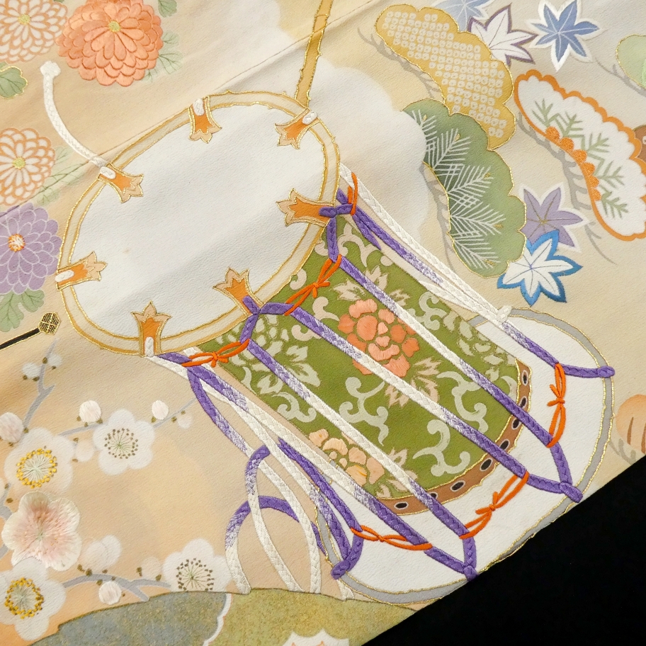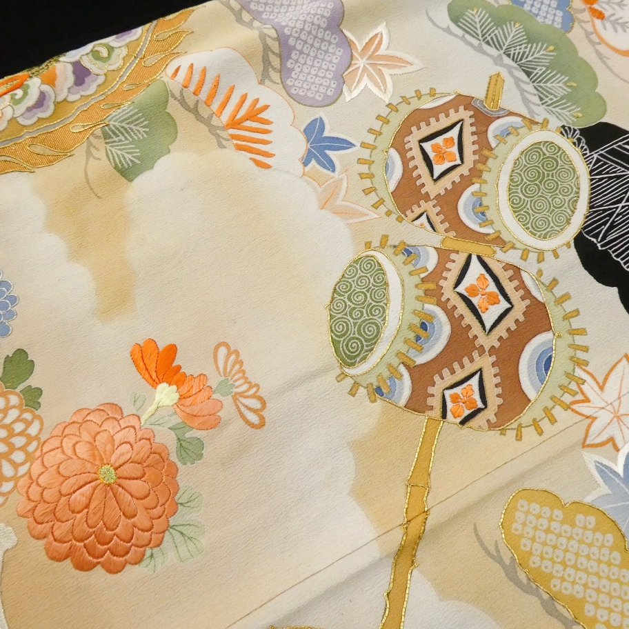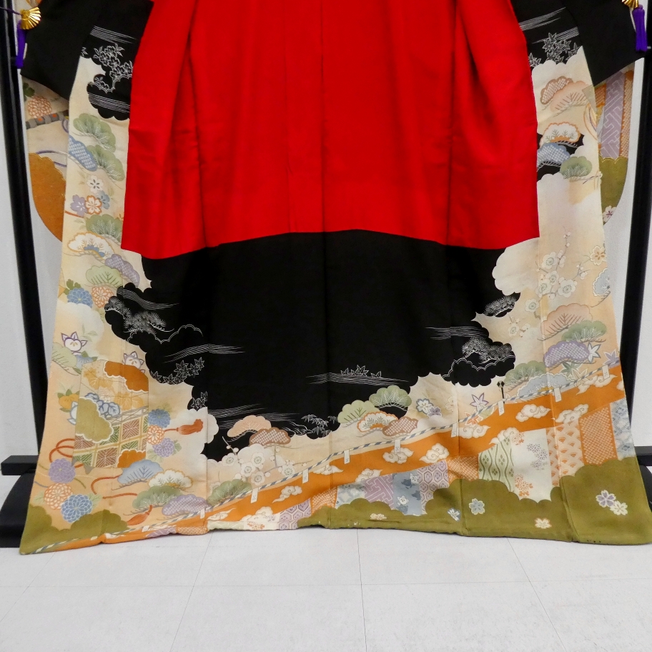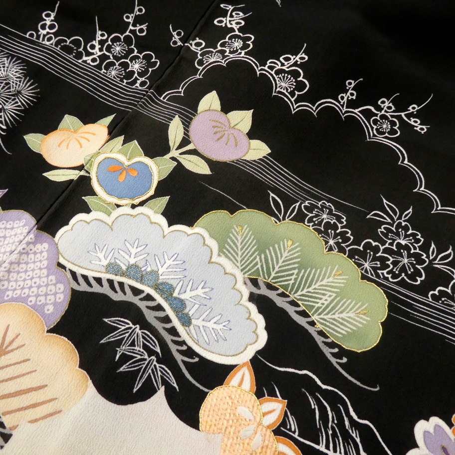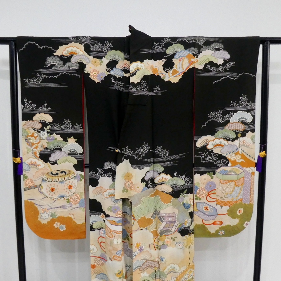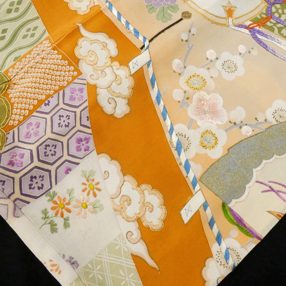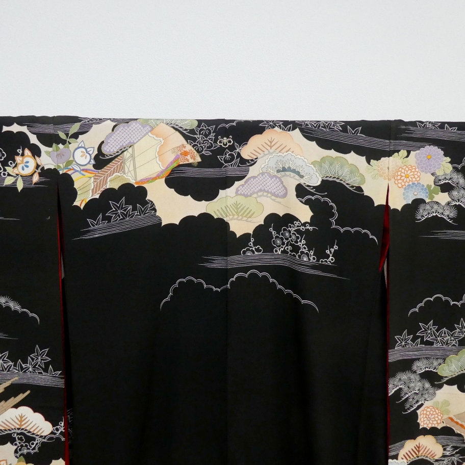 〓雅星〓アンティーク!!ブラック*古典文様*一つ紋 引き振袖 正絹袷 裄63.5丈173ロング 販売価格 128,000円 (税込) 購入数 \送料無料/ カートに入れる この商品について問い合わせる お気に入り 特定商取引法に基づく表記 コーディネートで使用している商品 〓雅星〓未使用超美!!ブラック×ゴールド【山本寛斎】唐花文♪正絹全通《袋帯》 49,800円(税込) ■雅星■新品!!ブラック*振袖用 総絞り 正絹帯揚げ 【クリックポスト発送】 16,500円(税込) 商品詳細 状態ランク: ★★★ シボの細かな縮緬地、ずっしりとした重みがあり落ち感も綺麗です。 黒地ベースに鼓や鳳凰・御簾など書ききれないほどの様々な古典柄が施され一際目を惹く豪華さ。 繊細な刺繍や金駒刺繍もあしらわれ、職人の技術が光る逸品です。 引き振袖なのでふき綿仕立てになっており、着物をより美しく魅せデザイン的にもアクセントになっています。 パーティーシーンや成人式など、人と差のつく着こなしが叶うアンティークの引き振袖です。 《袷・広衿》身166〜176cm位までの方にオススメです。 染めの一つ紋入り、引き振袖(花嫁衣裳)なので結婚式のご参列には適しません。 全体にうっすら時代なりの色褪せ、画像の様な薄シミも所々に見られますが 着用時には柄に紛れ目立ちにくいです。 金駒刺繍の留めが一部弱っている箇所がありますが着用には何ら問題ありません。 酷く目立つダメージはなく、時代物の中ではかなり状態の良い綺麗なお品です。 着物のみの価格で、帯・小物は含まれておりません。 サイズ・素材 裄 63.5cm 肩身丈 173cm 袖丈 107cm 袖幅 33cm 前幅 22.5cm 後ろ幅 30cm 内揚げ 0cm 縫込み(袖側) 1cm 縫込み(肩側) 3cm 素材 正絹 状態ランクについて ★★★★★ 超美品・新品・未使用品です。 ★★★★ 中古品ですがダメージの無いお品です。 ★★★ 薄ジミなどがありますが着用時には目立ちません。 ★★ 工夫次第で十分着用可能なお買い得品です ★ 大きめのシミがありますので、リメイク材料等にどうぞ。 _furi _fo