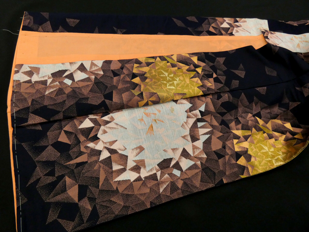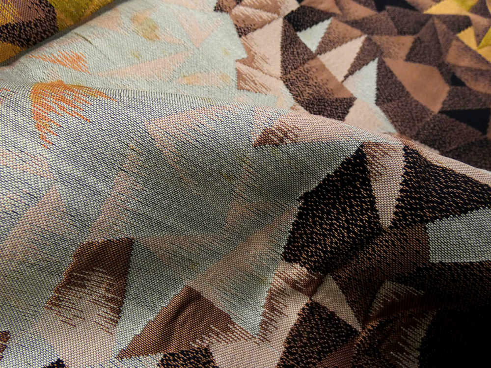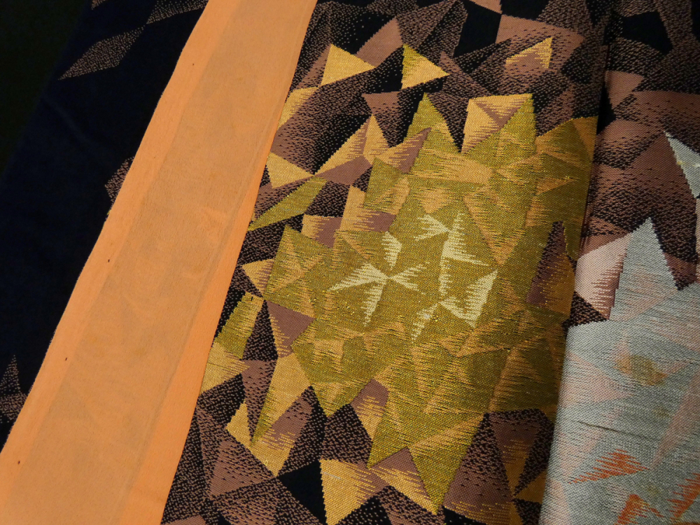 黒に近いネイビー地に幾何学模様で表現されたバラの花が織り出されています。