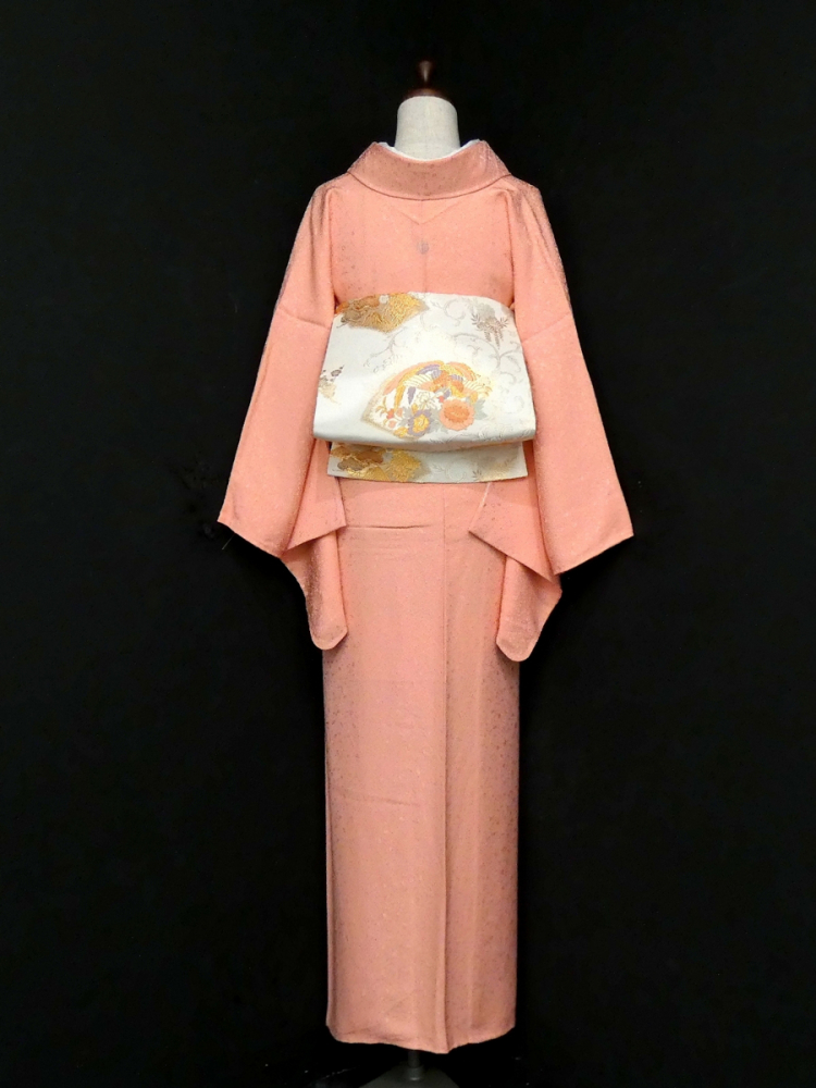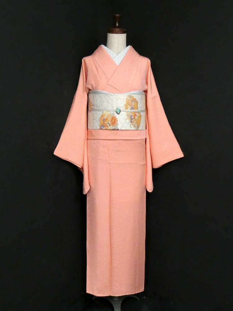 ◆雅星◆未使用超美!!一斤染色*一つ紋色無地 霰 正絹袷 裄66.5丈161ロング 販売価格 24,800円 (税込) 購入数 \送料無料/ カートに入れる この商品について問い合わせる お気に入り 特定商取引法に基づく表記 コーディネートで使用している商品 ◆雅星◆超美!!白地*花鳳凰地紙 正絹九寸《名古屋帯》 19,800円(税込) ★雅星本店オリジナル★新品!!プラチナ*シマシマ 銀通し 帯揚げ 正絹 【クリックポスト発送】 15,400円(税込) ★雅星本店オリジナル★新品*リバーシブル 縁あり三分紐【クリックポスト発送】 6,600円(税込) 商品詳細 状態ランク: ★★★★★ しなやかな手触りで落ち感の綺麗な正絹地。 黄みのピンクベースに霰のような地紋、鮮やかすぎないので様々な年齢の方にご着用いただけます。 縫いの一つ紋入り、スタイリング次第でパーティなどのフォーマルシーンから普段着まで振り幅広めに楽しめる色無地です。 《袷・広衿》身長156〜166cm位までの方にオススメです。 しつけ付き、シミ汚れのない超美品です。 着物のみの価格で、帯・小物は含まれておりません。 サイズ・素材 裄 66.5cm 肩身丈 161cm 袖丈 48.5cm 袖幅 33cm 前幅 23.5cm 後ろ幅 29.5cm 内揚げ 14cm 縫込み(袖側) 2cm 縫込み(肩側) 1.5cm 素材 正絹 状態ランクについて ★★★★★ 超美品・新品・未使用品です。 ★★★★ 中古品ですがダメージの無いお品です。 ★★★ 薄ジミなどがありますが着用時には目立ちません。 ★★ 工夫次第で十分着用可能なお買い得品です ★ 大きめのシミがありますので、リメイク材料等にどうぞ。