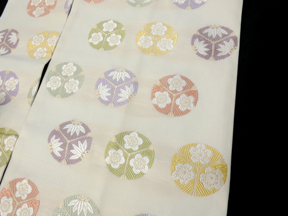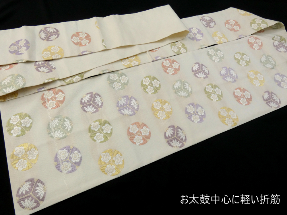 ◆雅星◆良品!!白地*松竹梅丸紋 正絹九寸《名古屋帯》 販売価格 17,800円 (税込) 購入数 \送料無料/ カートに入れる この商品について問い合わせる お気に入り 特定商取引法に基づく表記 商品詳細 状態ランク: ★★★ 白地に立体感のある唐織、カラフルな松竹梅丸紋が織り出されています。 優雅で清潔感のある色柄が正統派の着こなしと良く合います◎ 普段着からセミフォーマルコーデまで幅広く活躍してくれる名古屋帯です。 お太鼓の中心の軽い折筋が見られますが、 締めた際には目立ちにくいです。 その他目立つシミ汚れなくグッドコンディションです。 帯のみの価格で、着物・小物は含まれておりません。 サイズ・素材 長さ 31cm×380cm 素材 正絹 状態ランクについて ★★★★★ 超美品・新品・未使用品です。 ★★★★ 中古品ですがダメージの無いお品です。 ★★★ 薄ジミなどがありますが着用時には目立ちません。 ★★ 工夫次第で十分着用可能なお買い得品です ★ 大きめのシミがありますので、リメイク材料等にどうぞ。