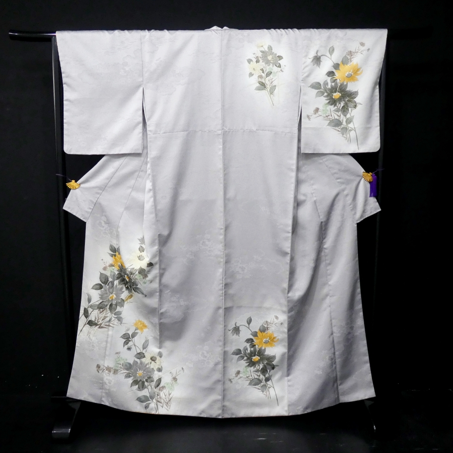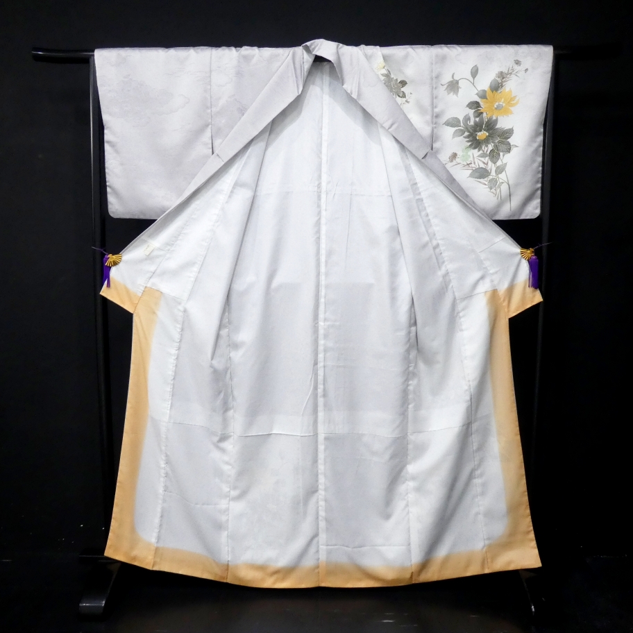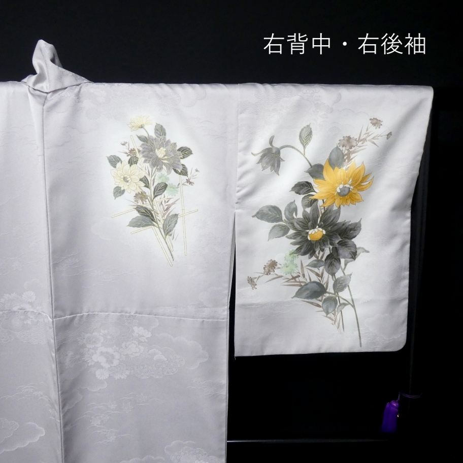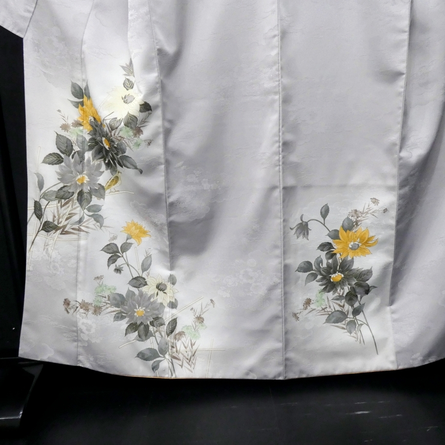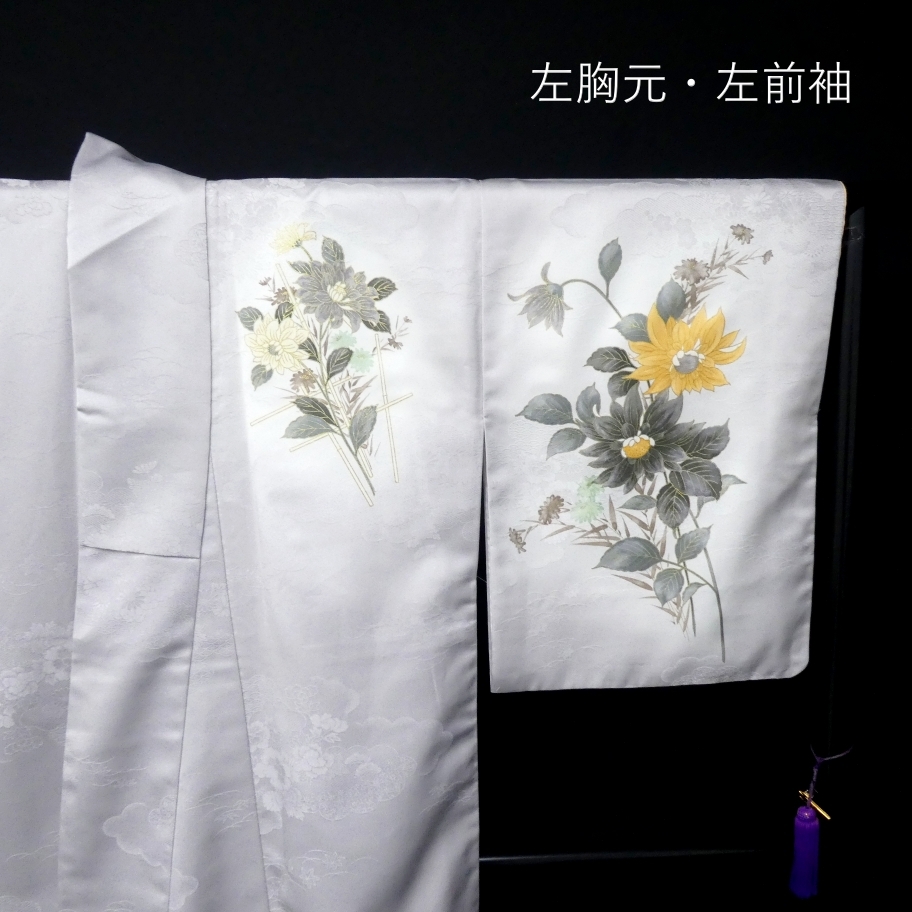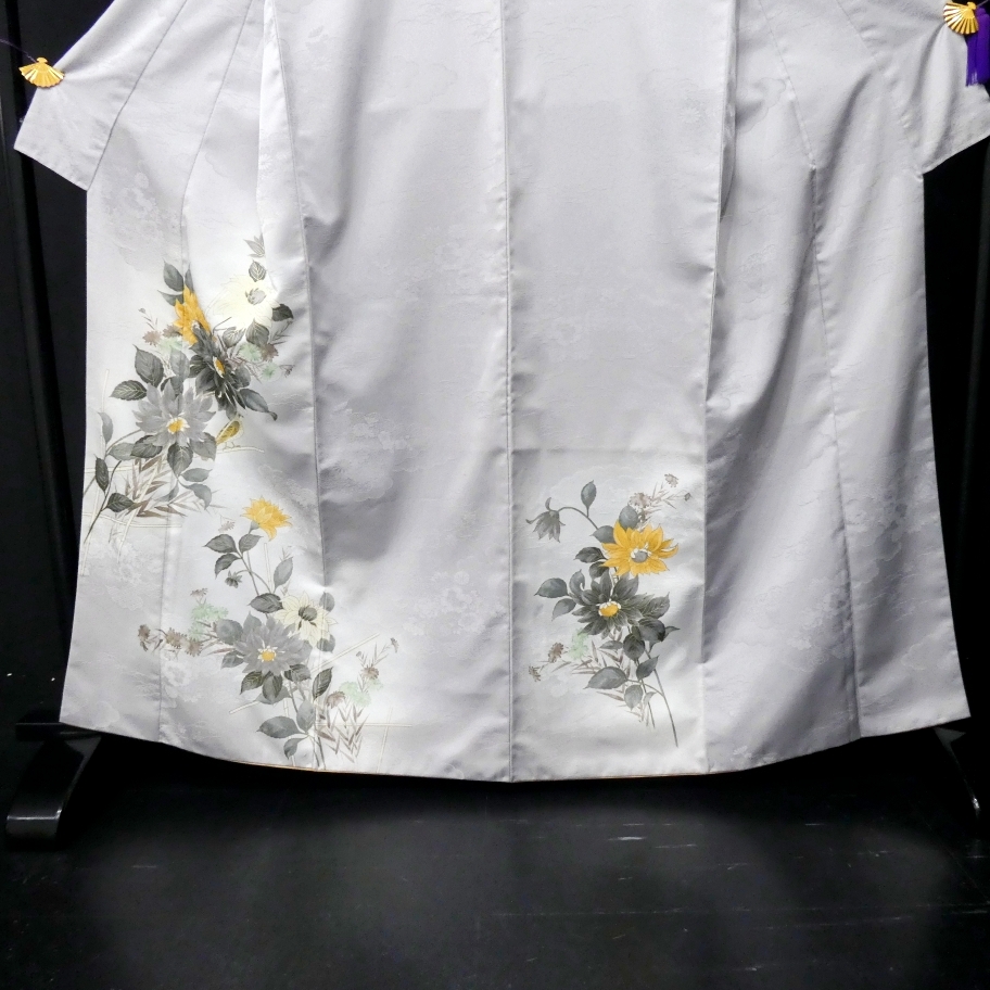 白っぽい薄グレーの暈しベース、雲取りに菊花や牡丹などの艶やかな地紋が施されています。