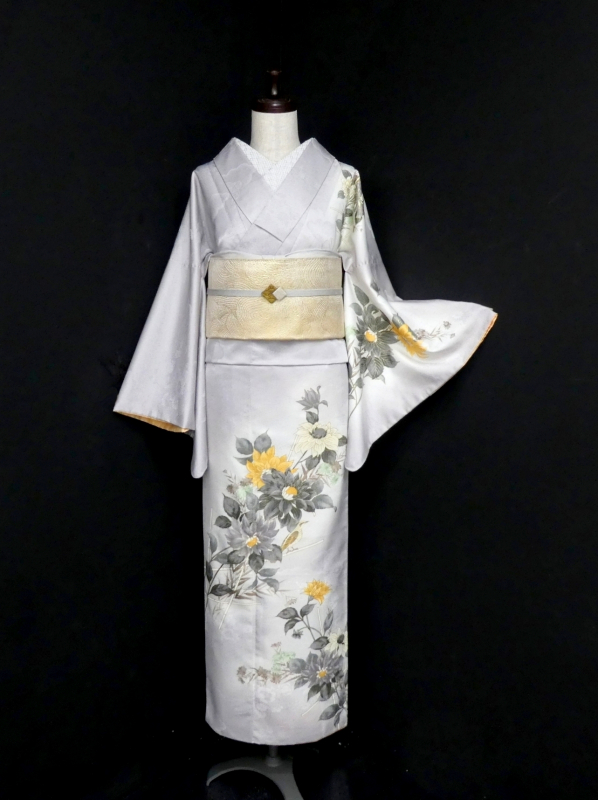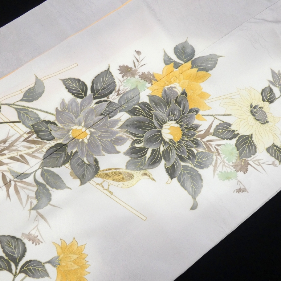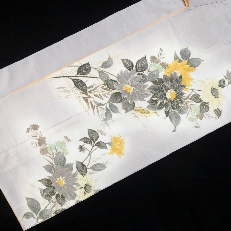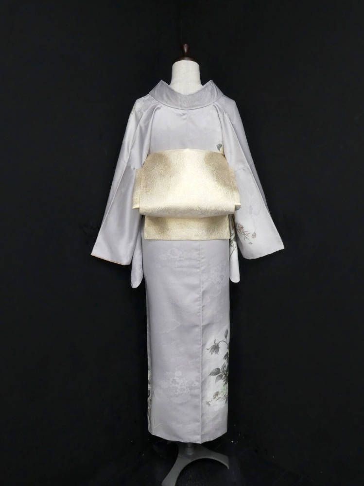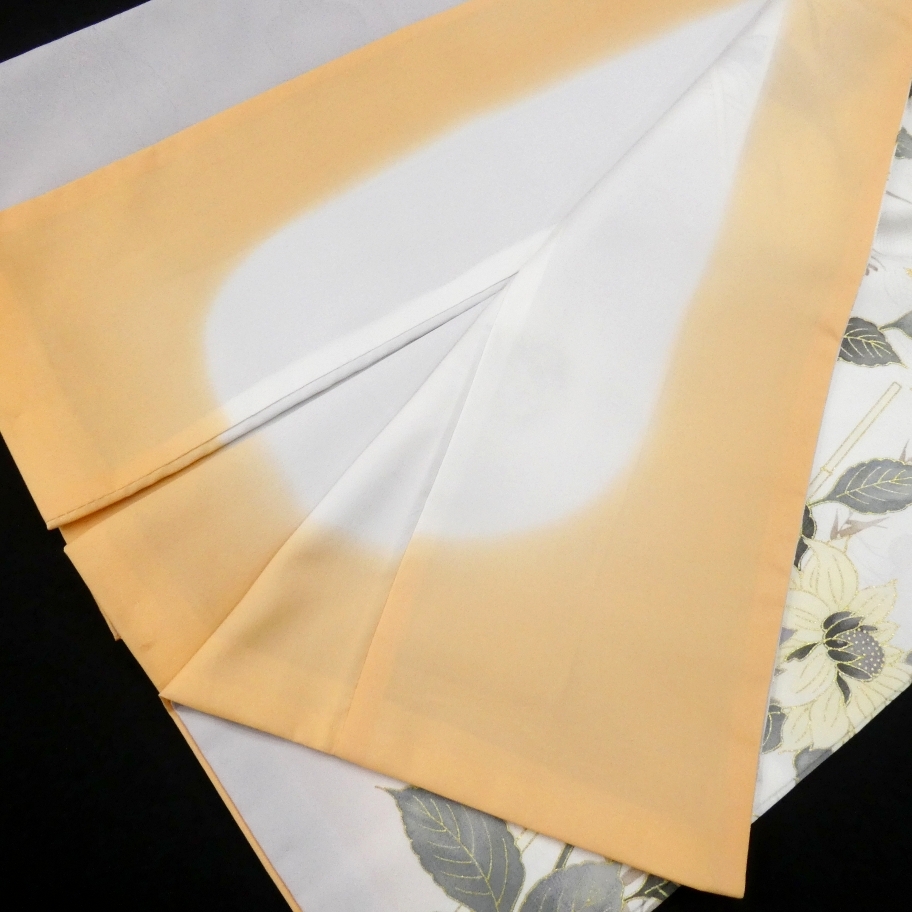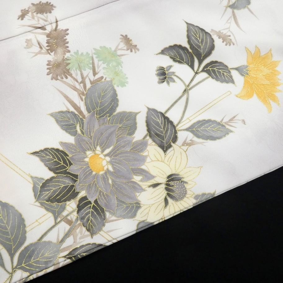 白っぽい薄グレーの暈しベース、雲取りに菊花や牡丹などの艶やかな地紋が施されています。