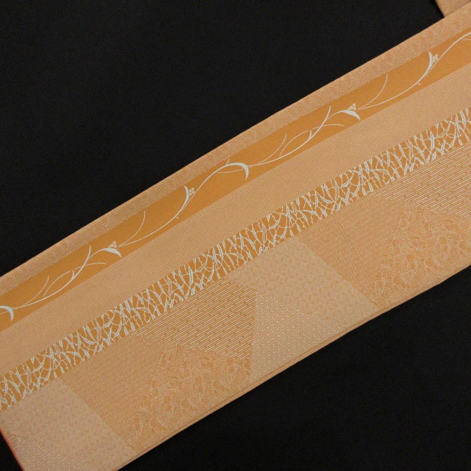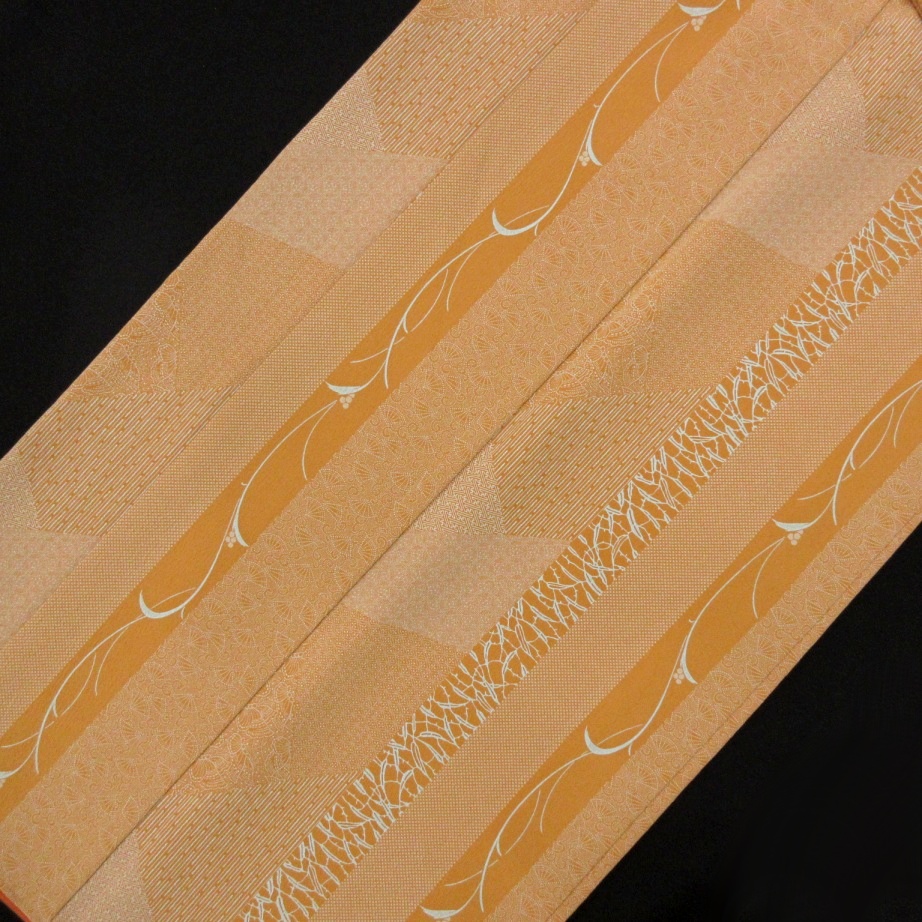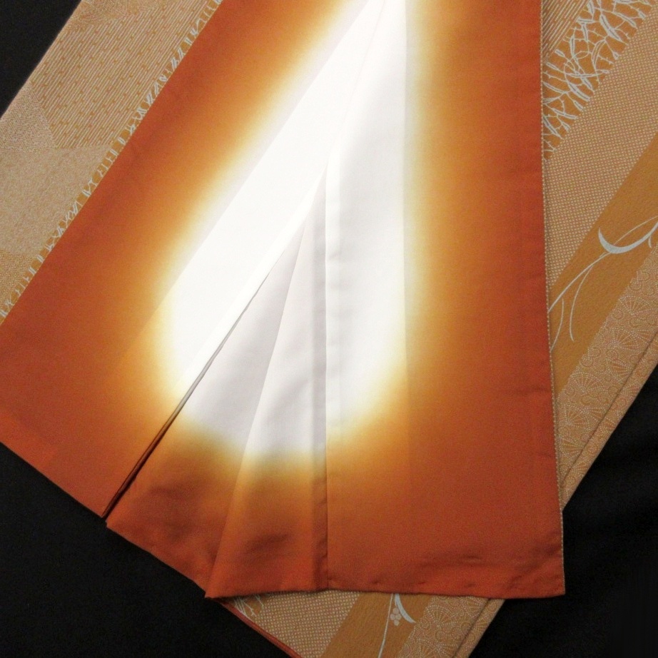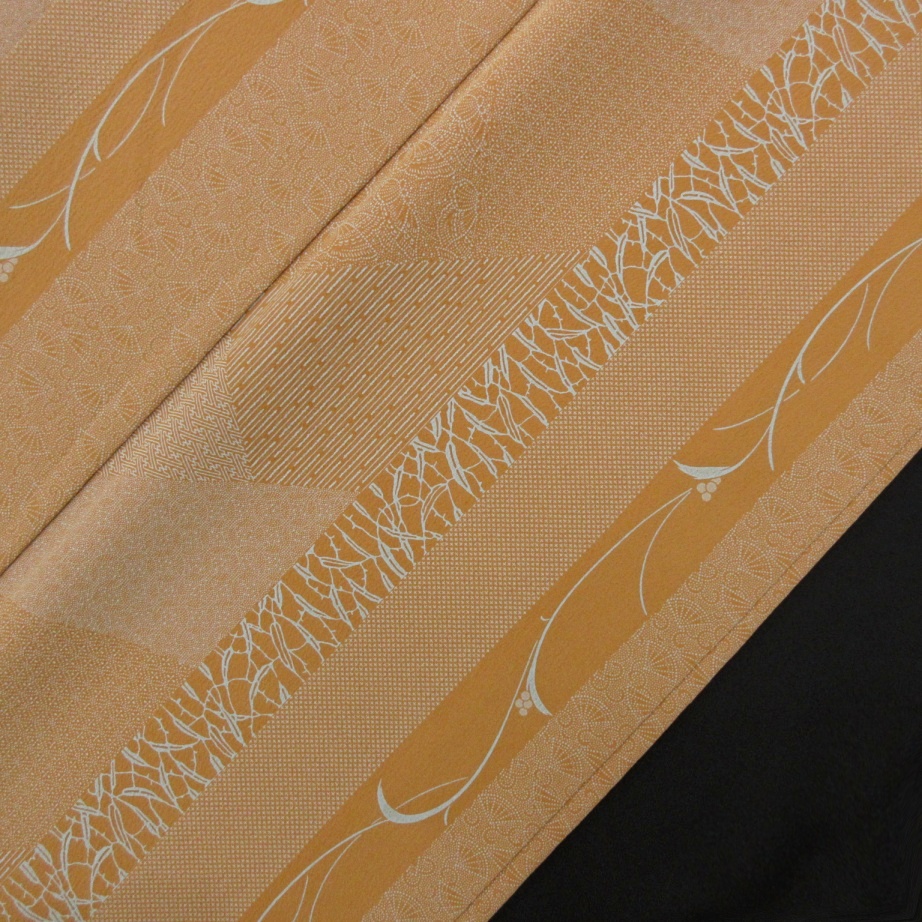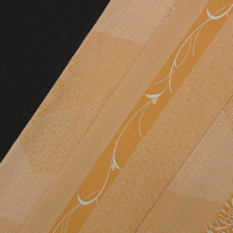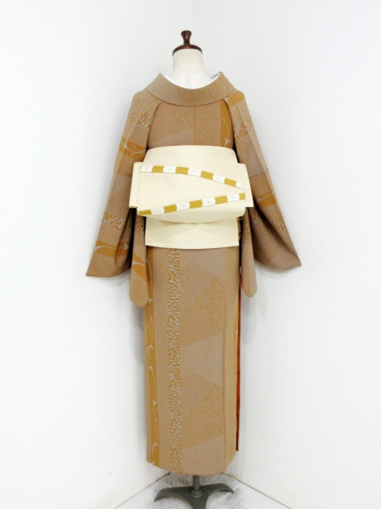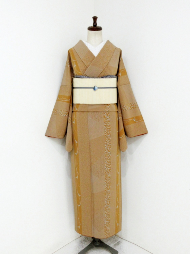 赤みがかった暗い黄褐色ベースに植物の縦縞と江戸小紋の文様が裂れ取状にあしらわれた粋なデザインで、人と差のつくこなれた着姿が叶います。