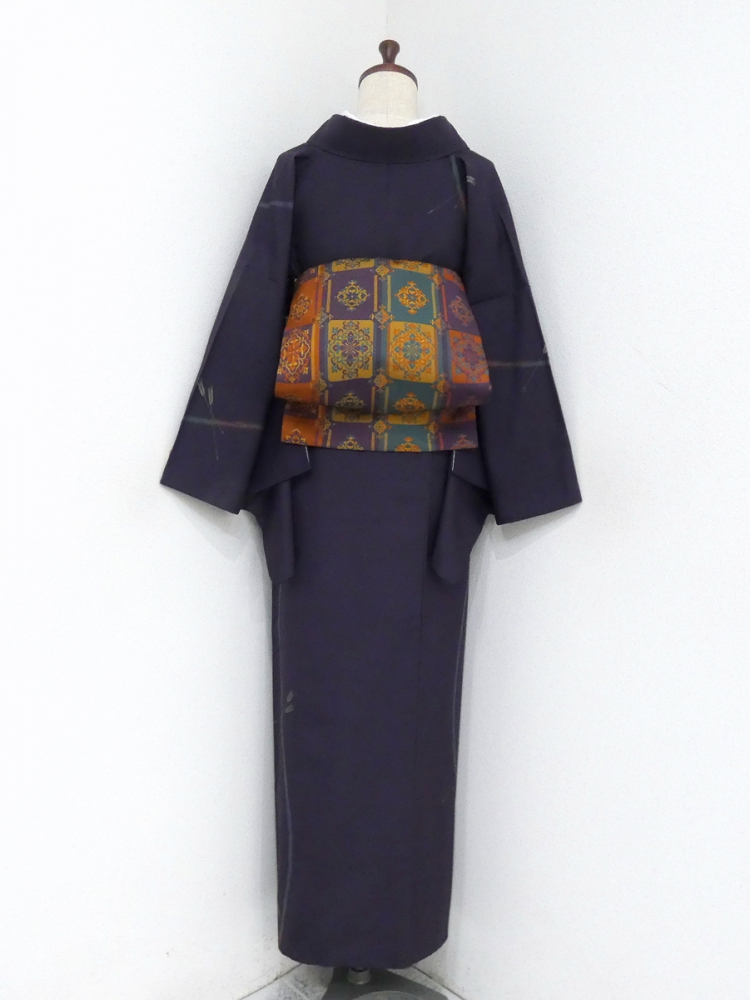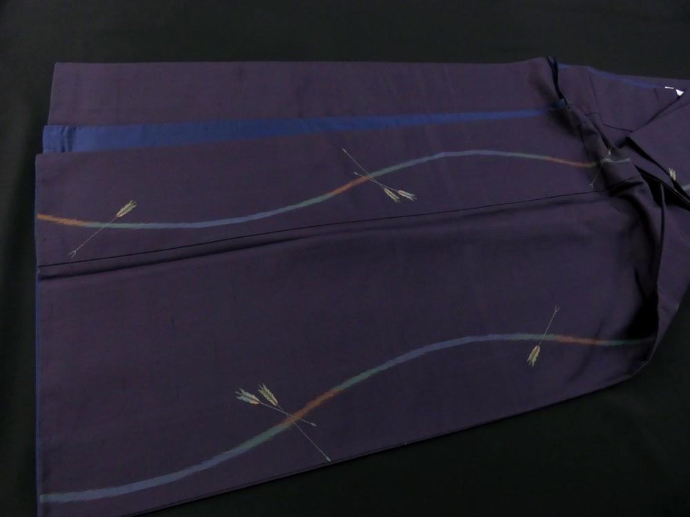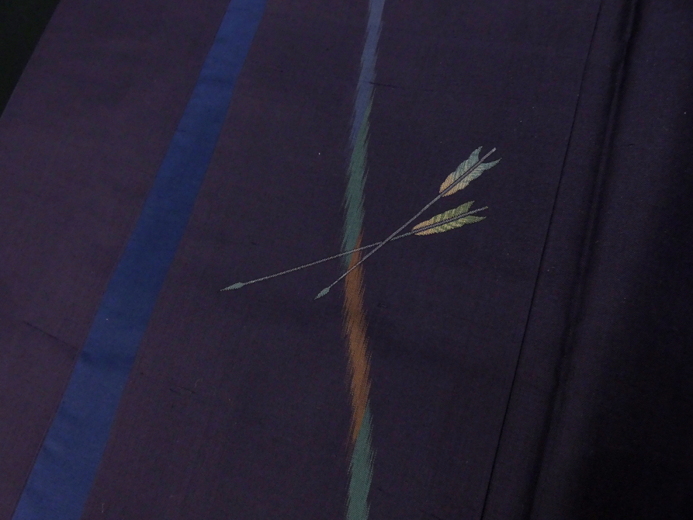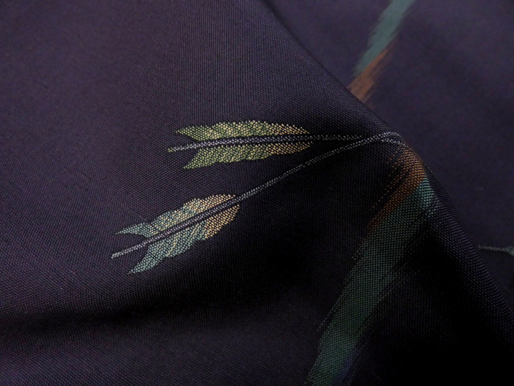 濃い紫色ベースによろけ縞模様、鏑矢模様が織り出された上品なデザイン♪