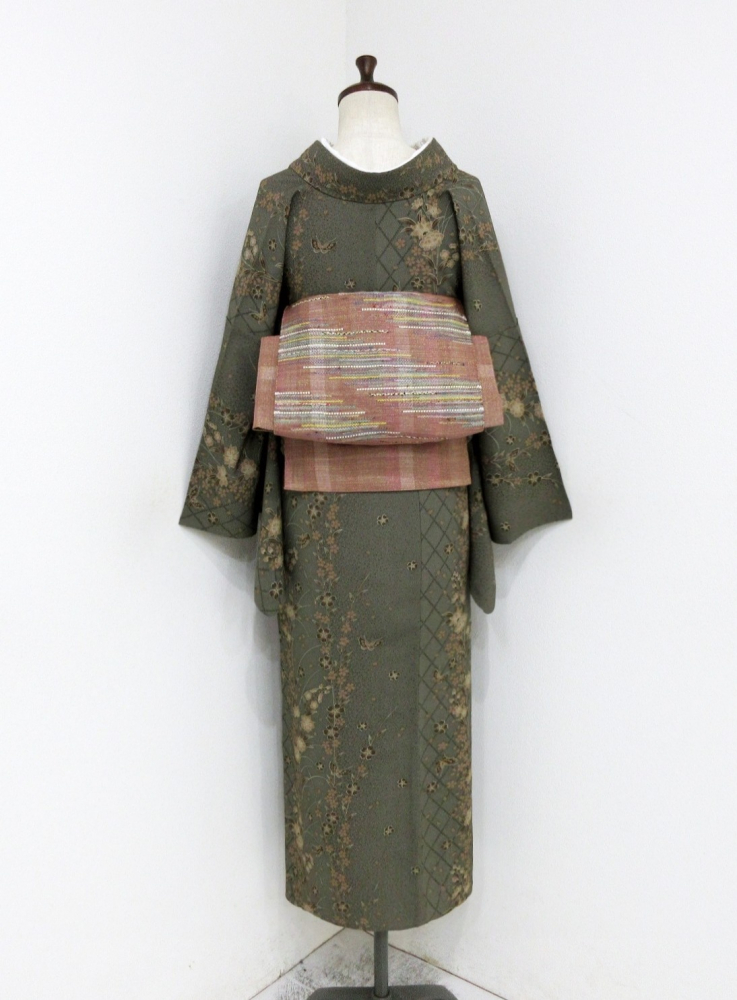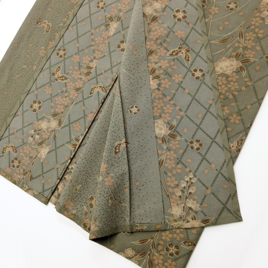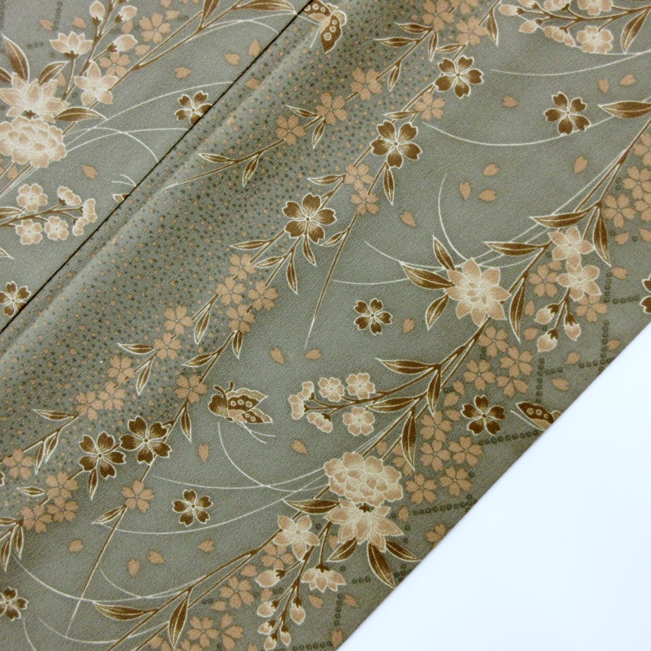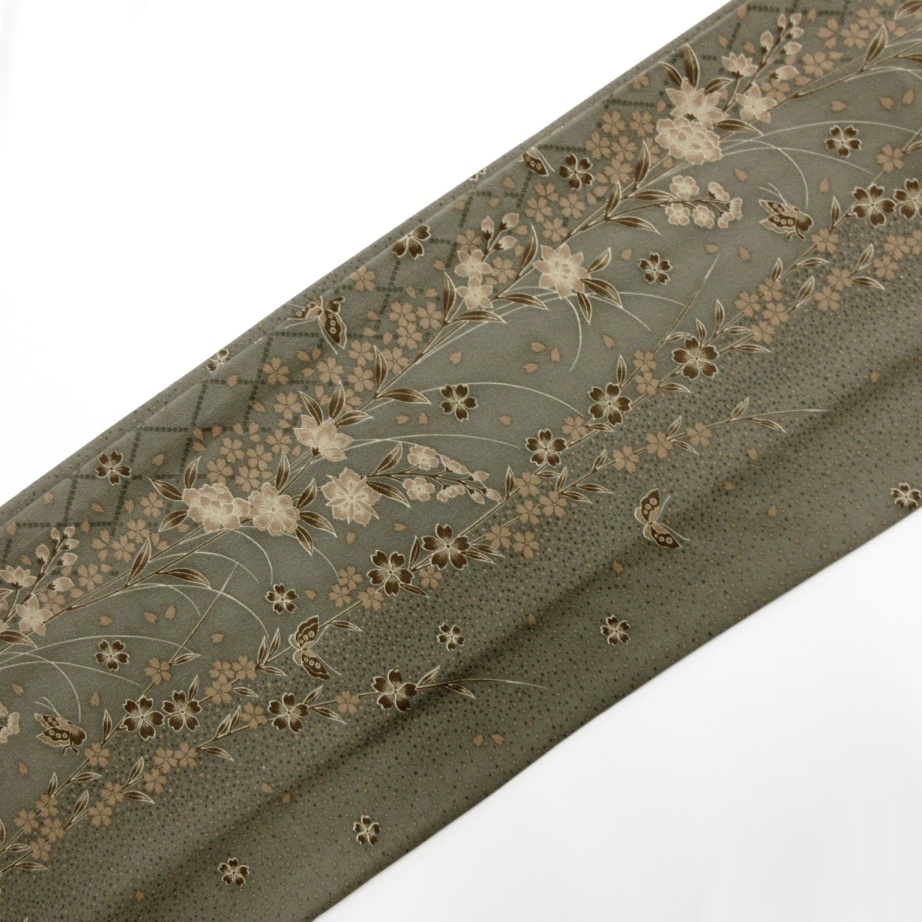 緑みを帯びたグレーベースに花鳥文があしらわれ控えめな大人の可愛らしさを感じます。