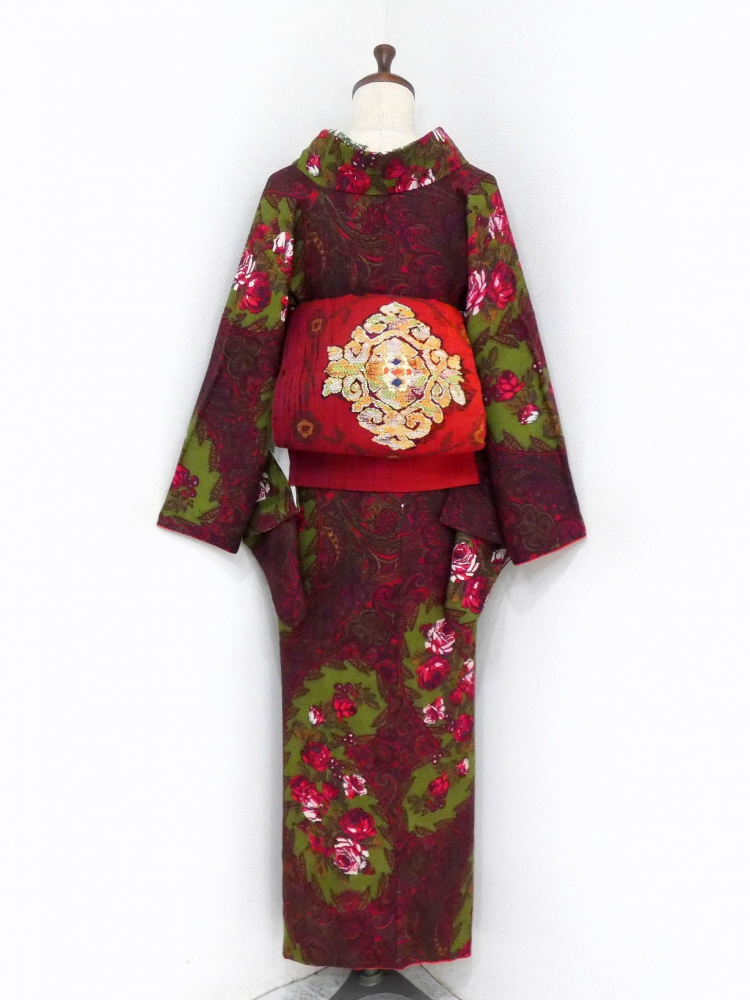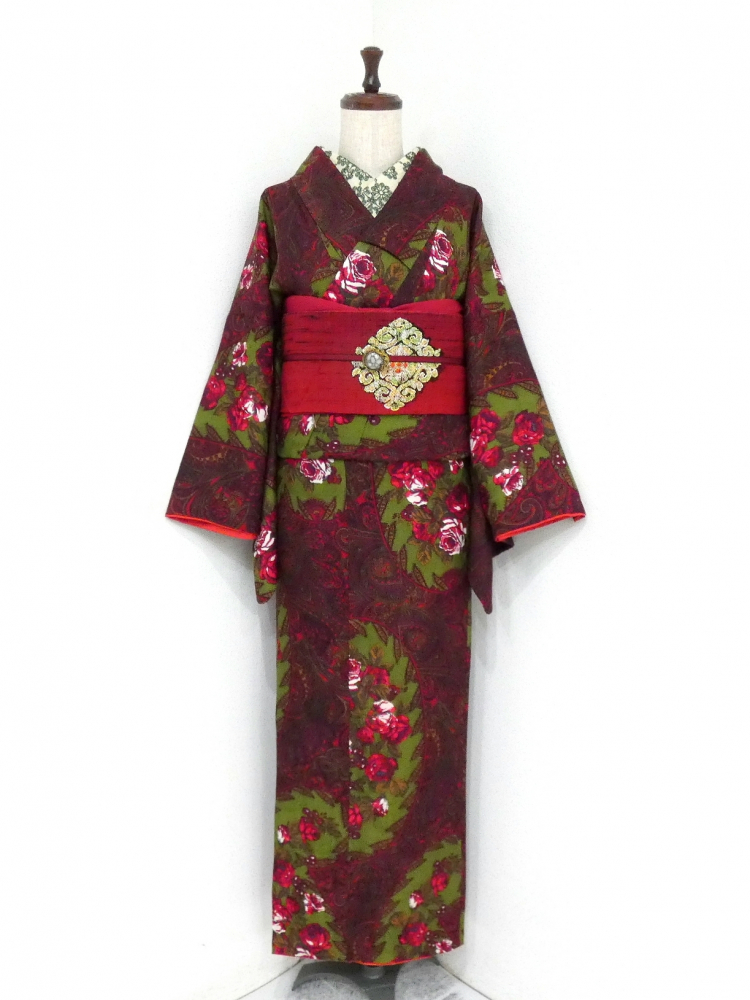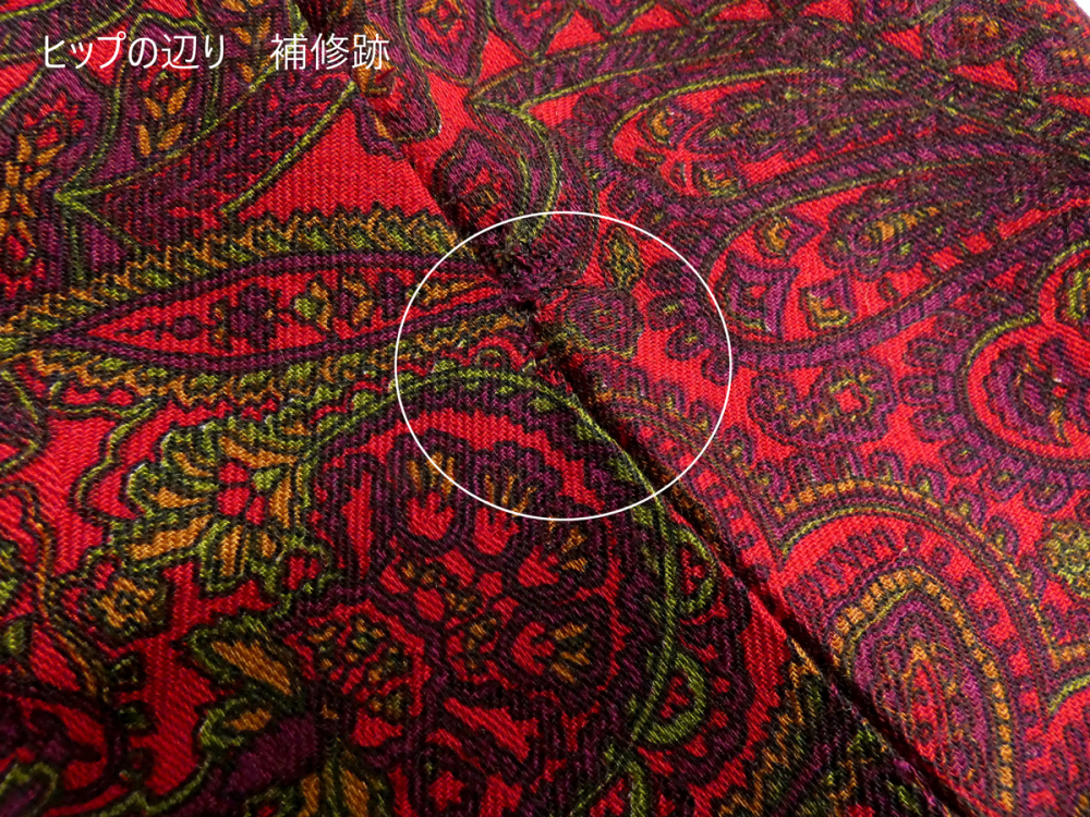 ◆雅星◆良品!!レッド×グリーン*ペイズリー バラ ウール 袷 裄65.5丈167ロング 販売価格 26,800円 (税込) sold out この商品について問い合わせる お気に入り 特定商取引法に基づく表記 コーディネートで使用している商品 ◆雅星◆超美!!レッド*ざっくり紬 宝相華 正絹八寸《名古屋帯》 24,800円(税込) ★雅星本店オリジナル★新品*リバーシブル 縁あり三分紐【クリックポスト発送】 6,600円(税込) 商品詳細 状態ランク: ★★★ ウールと化繊の交織ベース、柔らかくカシミアのような手触りをしています。 黄緑ベースに赤のペイズリー模様と薔薇の花が染められています。 普段着使いに最適なカジュアル感。 染め模様なので素朴感も控えめ、部屋着やワンマイル着物だけでなく、お出掛け着としても楽しめるウール着物です。 《袷・広衿》身長162〜172cm位までの方にオススメです。 八掛に薄シミ、ヒップの辺りに近くて見ないとわからない程度の補修痕が見られます。 その他は目立つシミ・汚れはありませんので、お気軽にお楽しみ頂けます。 着物のみの価格で、帯・小物は含まれておりません。 サイズ・素材 裄 65.5cm 肩身丈 167cm 袖丈 48.5cm 袖幅 33cm 前幅 22.5cm 後ろ幅 30.5cm 内揚げ 0cm 縫込み(袖側) 1cm 縫込み(肩側) 1cm 素材 ウールと化繊 状態ランクについて ★★★★★ 超美品・新品・未使用品です。 ★★★★ 中古品ですがダメージの無いお品です。 ★★★ 薄ジミなどがありますが着用時には目立ちません。 ★★ 工夫次第で十分着用可能なお買い得品です ★ 大きめのシミがありますので、リメイク材料等にどうぞ。 _woo