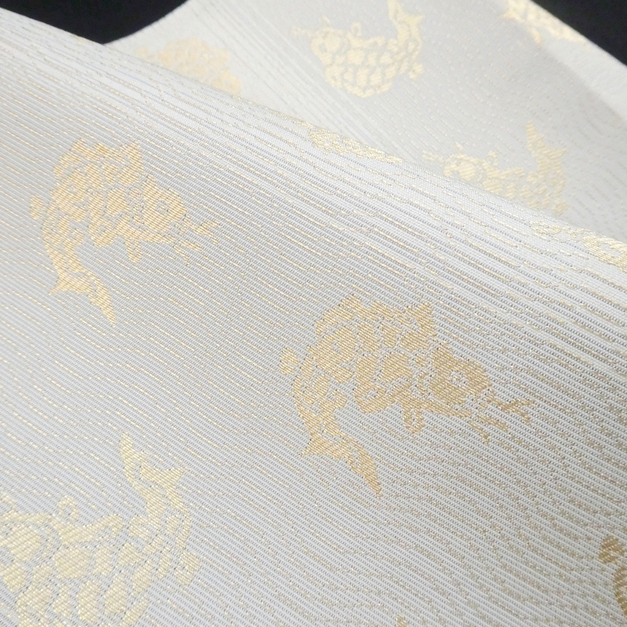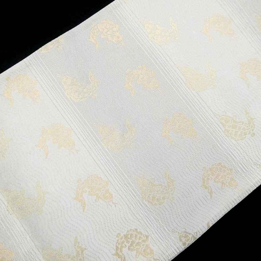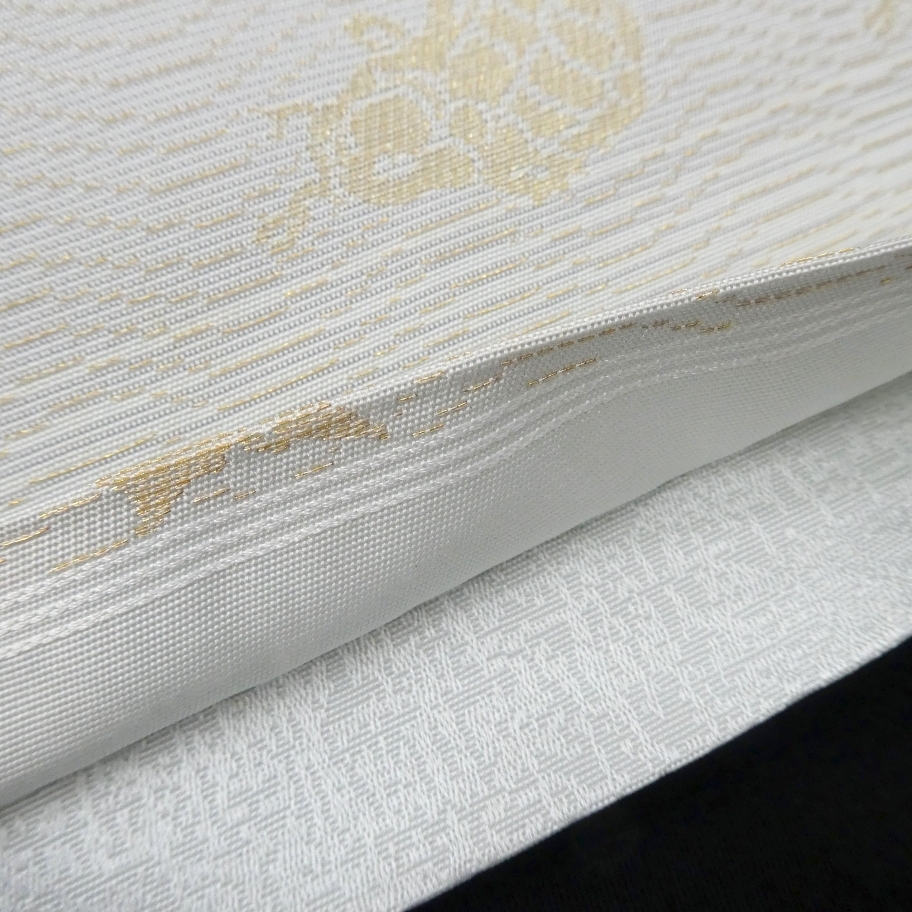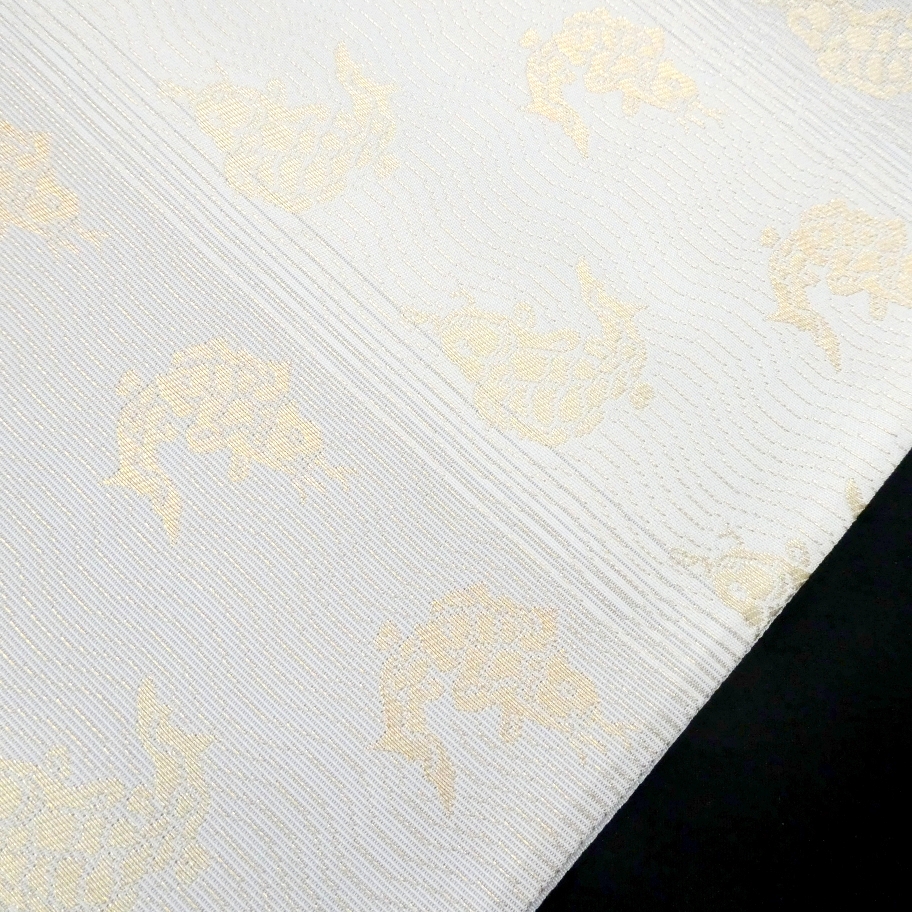 やや青味を感じる白に近いグレー地、横段状に金糸が煌めく荒磯文があしらわれています。