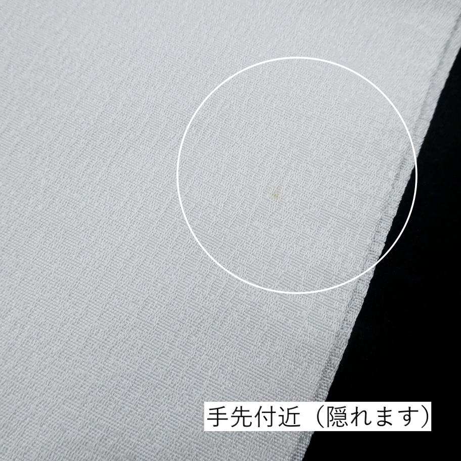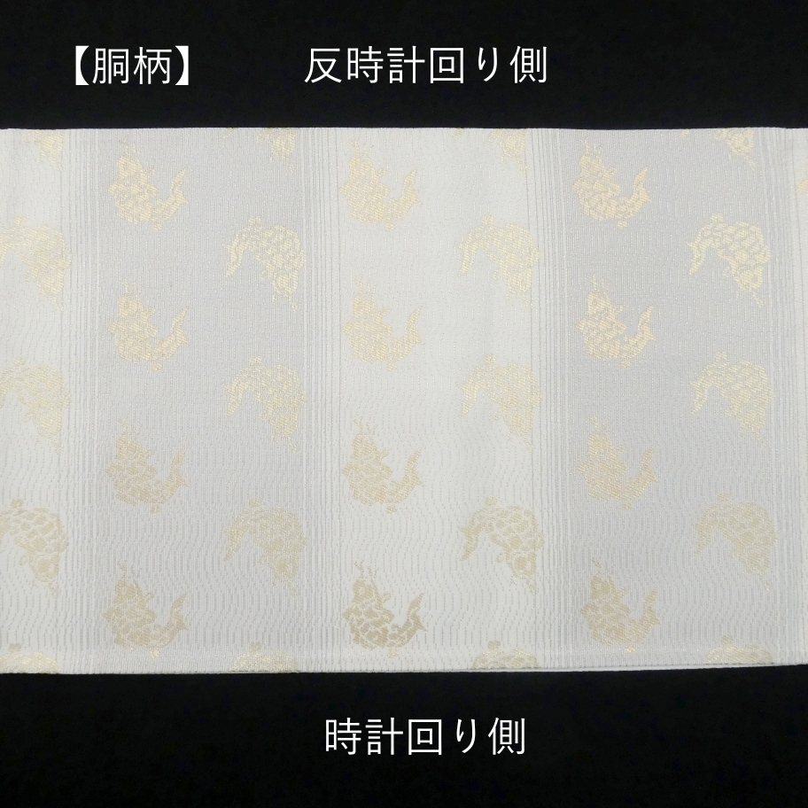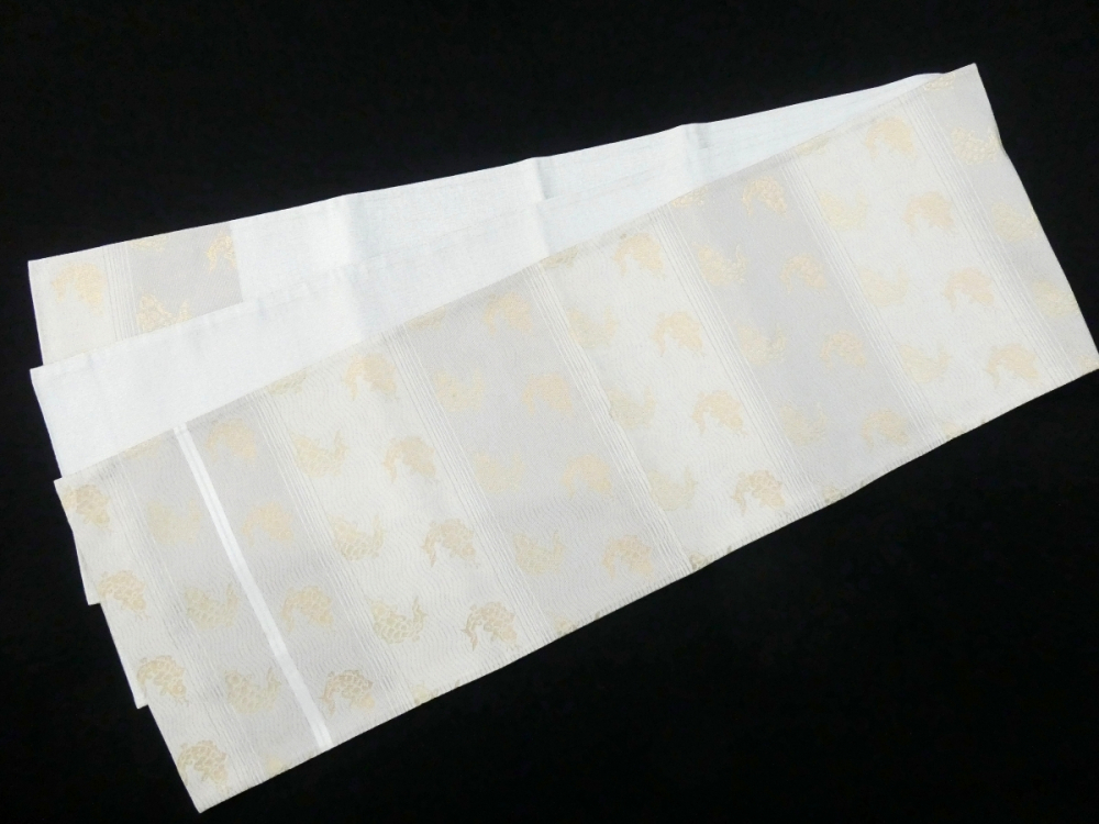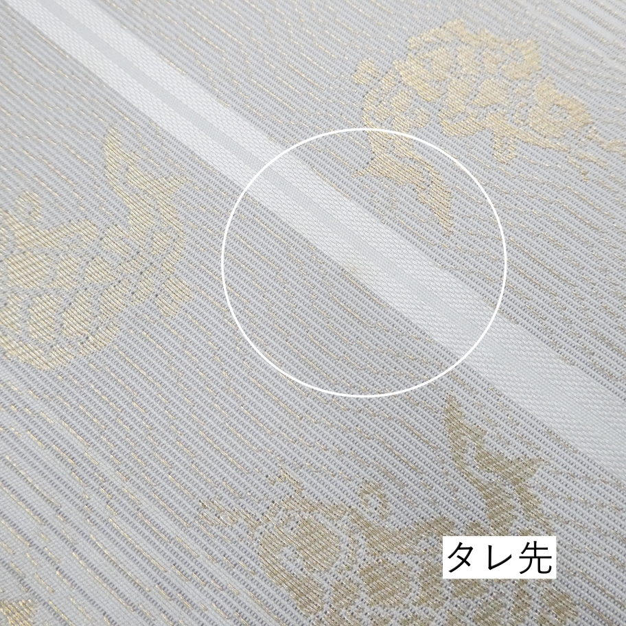 やや青味を感じる白に近いグレー地、横段状に金糸が煌めく荒磯文があしらわれています。