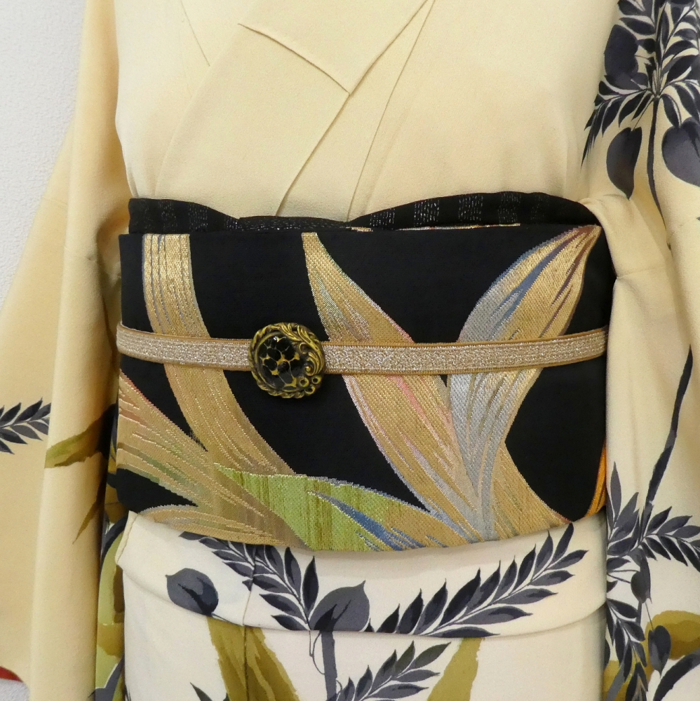 〓雅星〓レトロ!!ブラック*リーフ♪正絹九寸《名古屋帯》 販売価格 24,800円 (税込) 購入数 \送料無料/ カートに入れる この商品について問い合わせる お気に入り 特定商取引法に基づく表記 商品詳細 状態ランク: ★★★ ブラックベースに煌めく大胆なリーフ文がエレガントな印象。 時代感が古すぎないので現代のお着物と合わせても違和感なく楽しめます。 コーデの引き締めアイテムとしてはもちろん、ぐっと艶やかなスタイリングに格上げしてくれる九寸名古屋帯です。 時代なりの使用感はありますが、締めた後に目立つシミ・汚れはなくグッドコンディションなお品です。 帯のみの価格で、着物・小物は含まれておりません。 サイズ・素材 長さ 30.5cm×358cm 素材 正絹 状態ランクについて ★★★★★ 超美品・新品・未使用品です。 ★★★★ 中古品ですがダメージの無いお品です。 ★★★ 薄ジミなどがありますが着用時には目立ちません。 ★★ 工夫次第で十分着用可能なお買い得品です ★ 大きめのシミがありますので、リメイク材料等にどうぞ。 _an