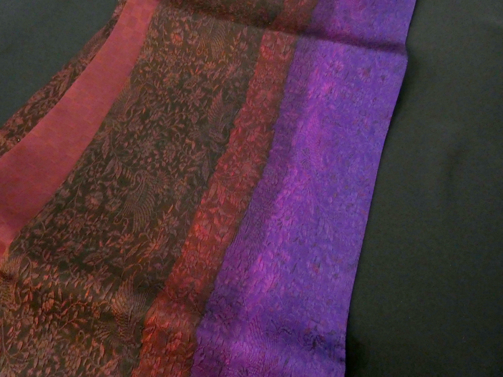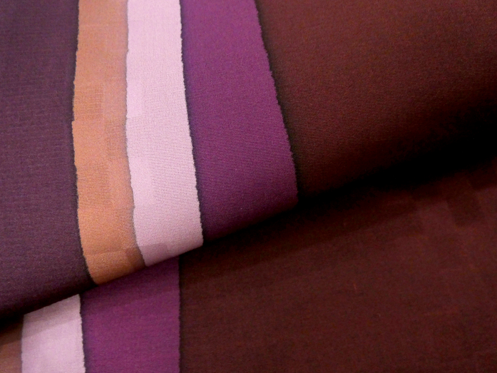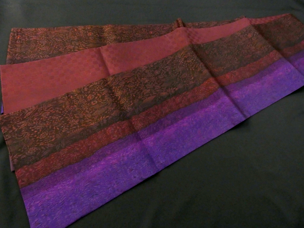 鳳凰とリーフの地紋、暗い赤と紫の太縞がお洒落な印象、全通柄なので柄出しに困ることもありません。