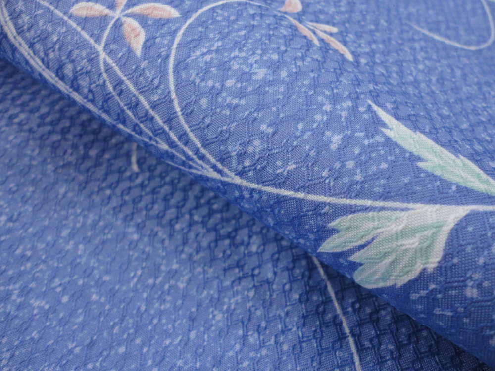 青色ベースに散らし文、草花があしらわれた清潔感あふれる上品なデザイン。