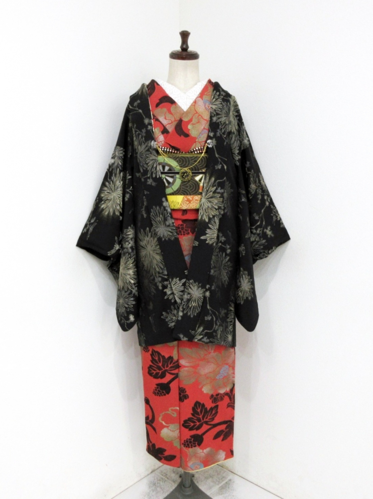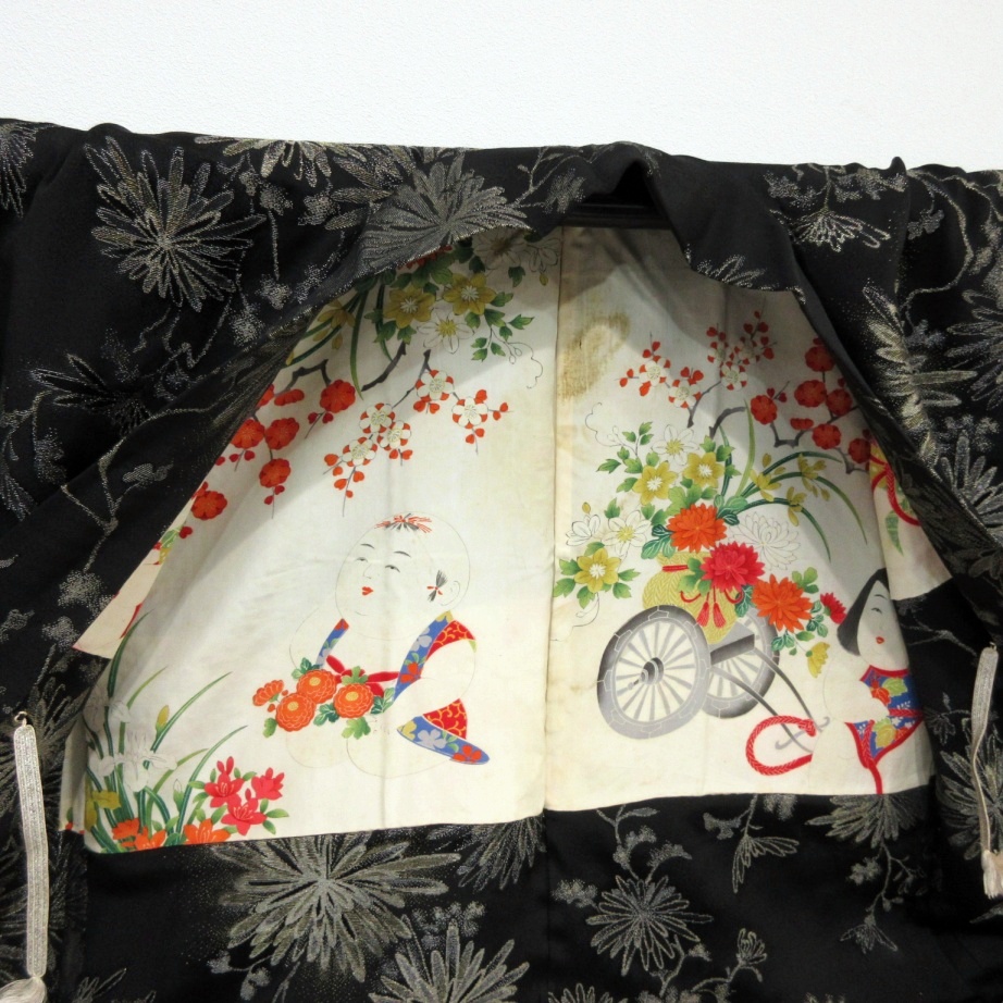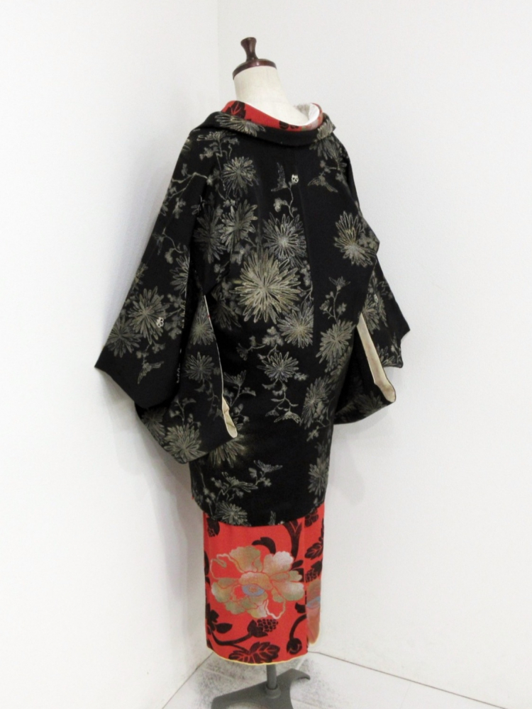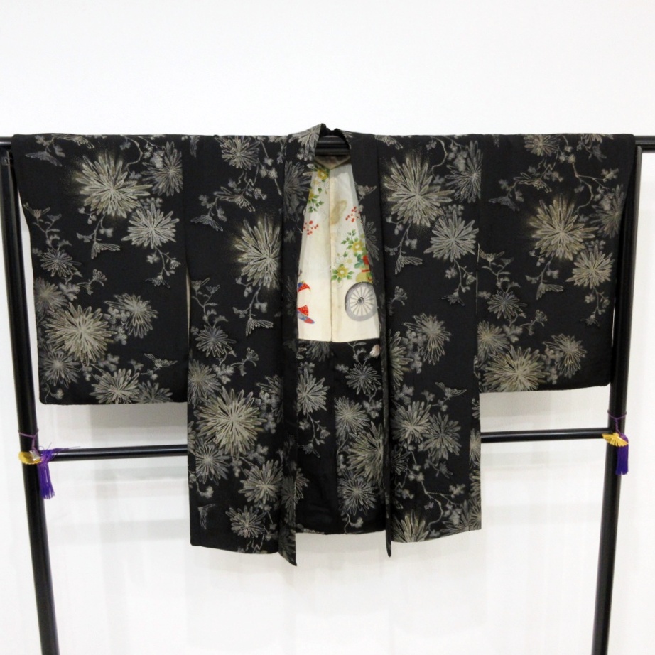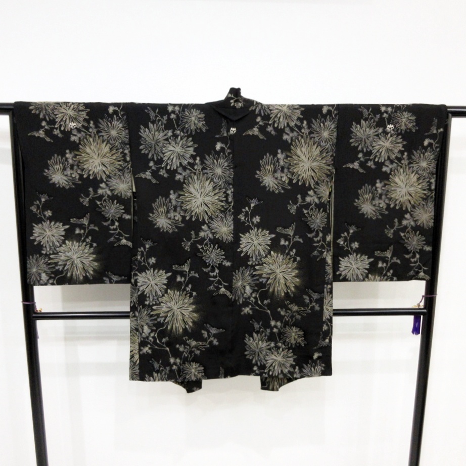 ■雅星■アンティーク!!ブラック*菊尽くし♪キラキラお召し 三つ紋 黒羽織 正絹 裄64.5丈89