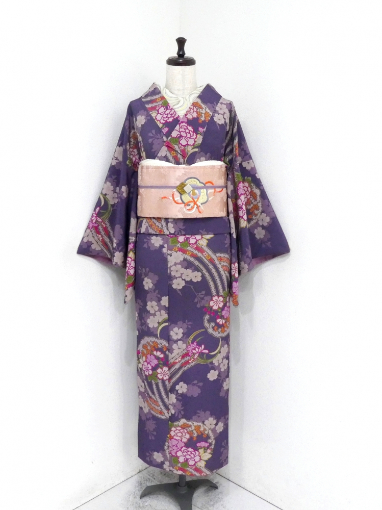〓雅星〓超美!!モーブ*波雪輪 花丸文♪洗える小紋 袷 裄64丈160ロング