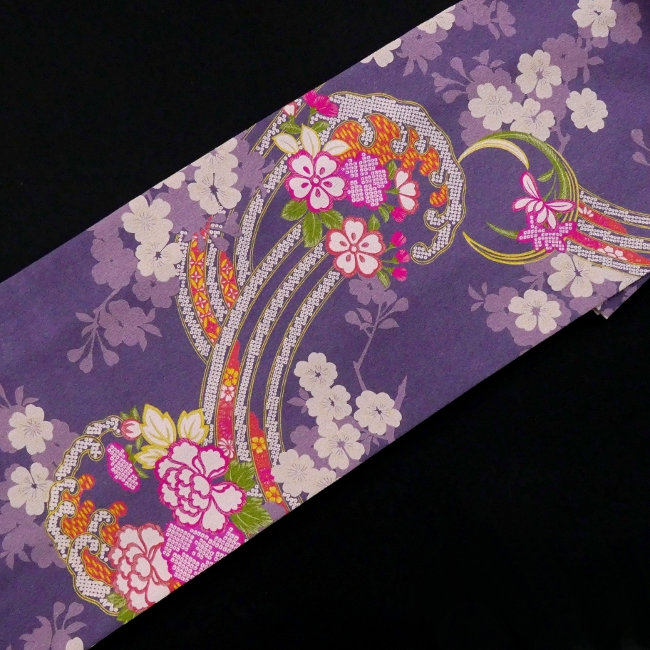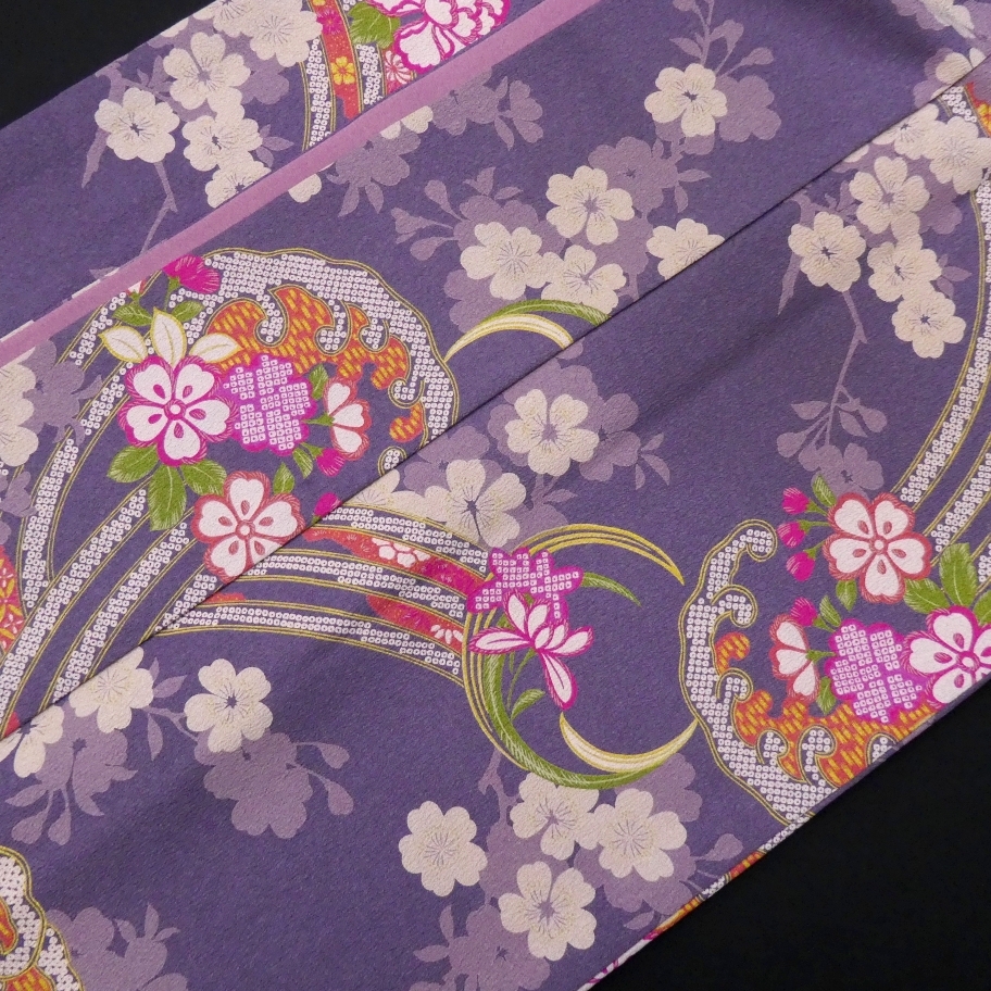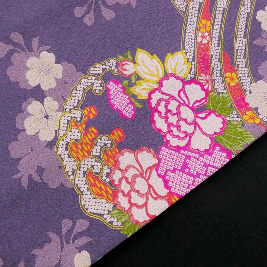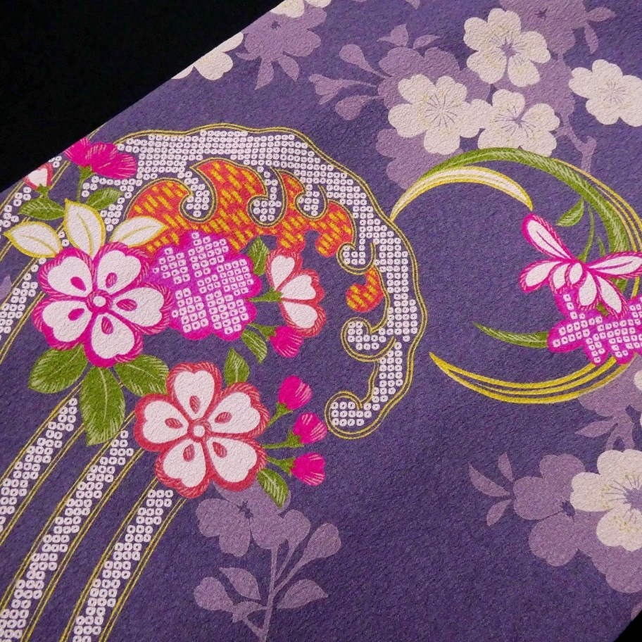 艶やかな花模様があしらわれた波モチーフの雪輪、桜の花もあしらわれ少しアンティークな雰囲気をまとった華やかなデザイン。