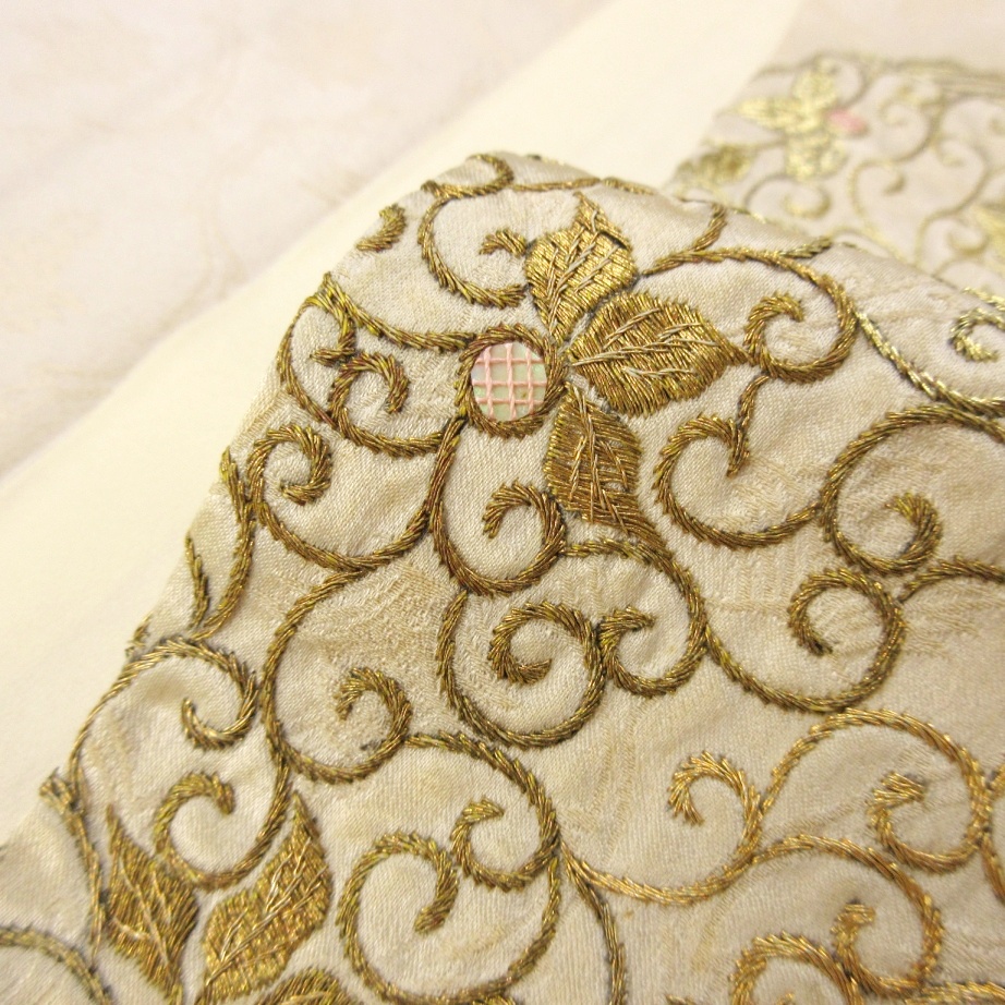 みっちりと金糸で織り出された唐草の刺繍に所々螺鈿細工が施されています。