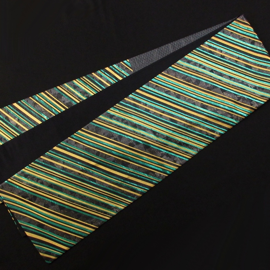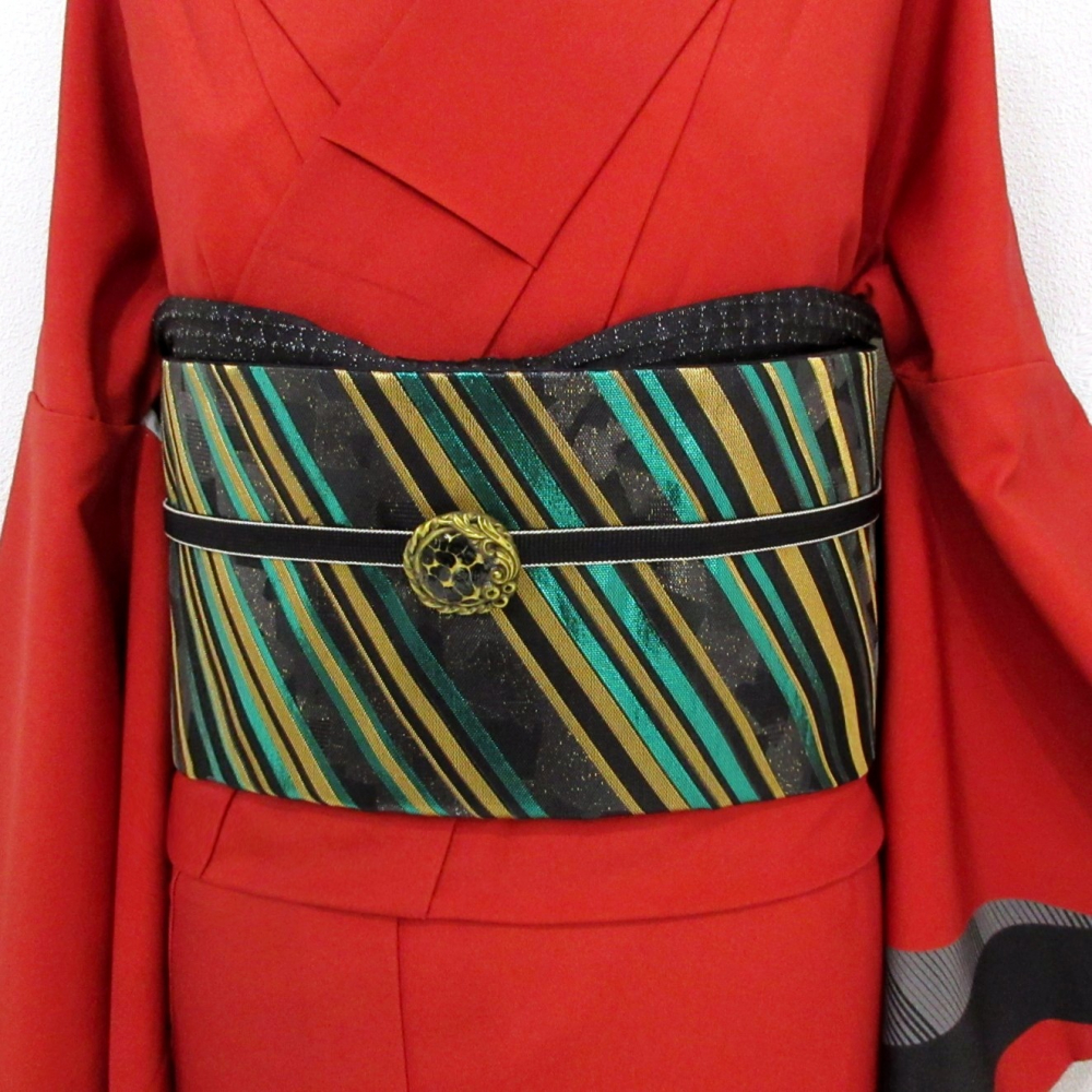 ■雅星■美品!!艶ブラック*漆箔 斜め縞♪正絹六通《袋帯》 販売価格 36,800円 (税込) 購入数 \送料無料/ カートに入れる この商品について問い合わせる お気に入り 特定商取引法に基づく表記 商品詳細 状態ランク: ★★★★ 艶感あるブラックベースに煌びやかな斜め縞がシャープで格好良い! 合わせるお着物をさりげなく引き立てつつ、凛とした着姿を叶えてくれます。 高級感・重厚感のある色柄ですが、しなやかな手触りなので軽い締め心地◎ お振袖・フォーマルシーンはもちろん、華やかなパーティなどにも振り幅広めに楽しめる袋帯です。 目立つシミ・汚れはなく大変綺麗なお品です。 帯のみの価格で、着物・小物は含まれておりません。 サイズ・素材 長さ 31cm×430cm 素材 正絹 状態ランクについて ★★★★★ 超美品・新品・未使用品です。 ★★★★ 中古品ですがダメージの無いお品です。 ★★★ 薄ジミなどがありますが着用時には目立ちません。 ★★ 工夫次第で十分着用可能なお買い得品です ★ 大きめのシミがありますので、リメイク材料等にどうぞ。 _fo