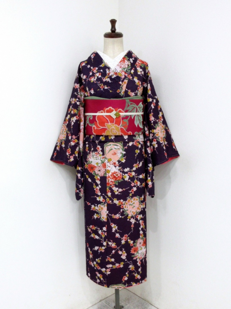 新着商品■雅星■アンティーク!!葡萄色*梅 花丸文♪小紋 袷 裄62丈146