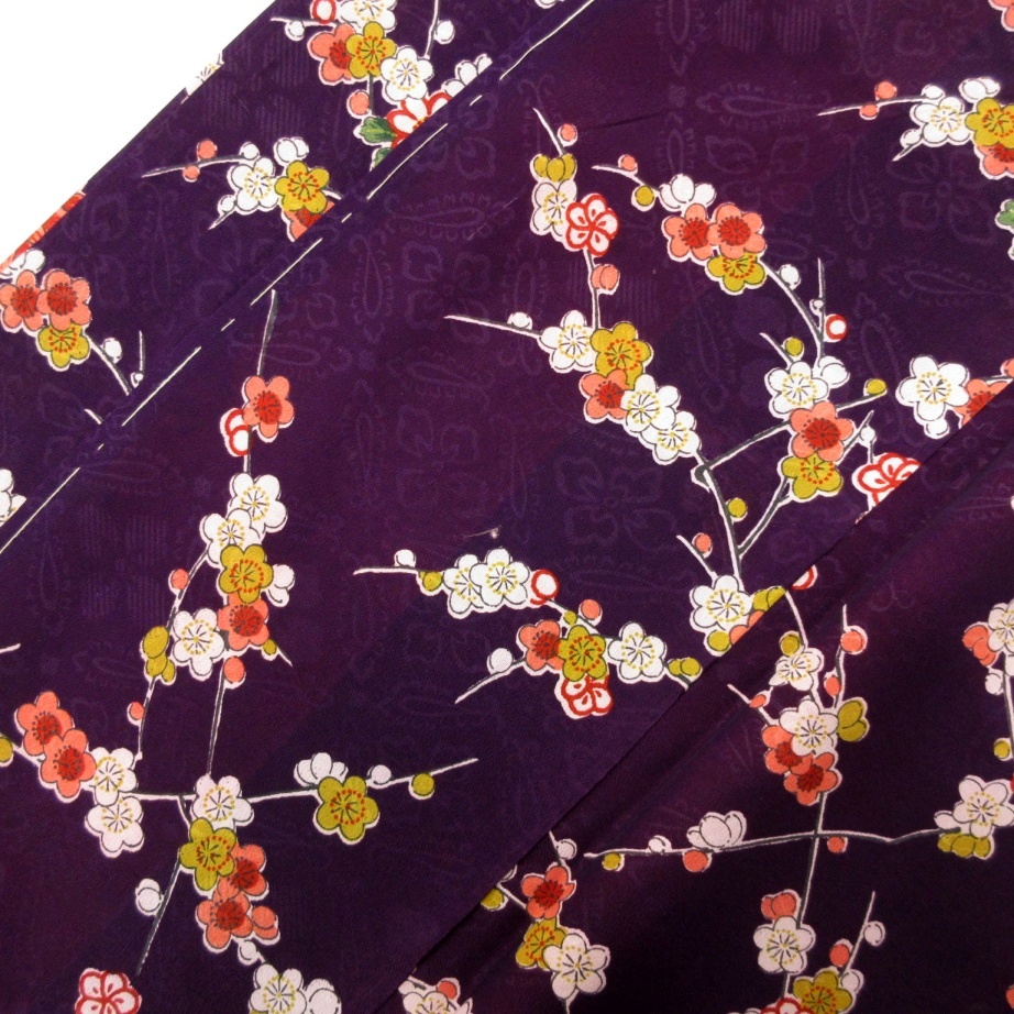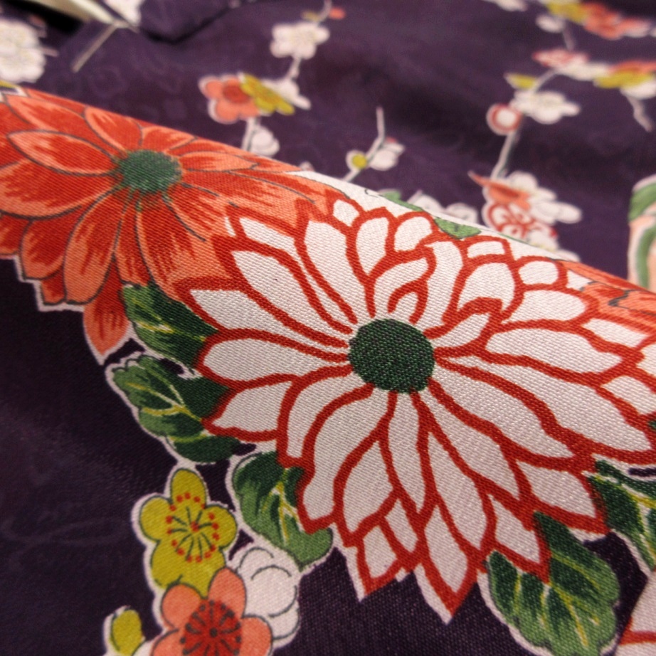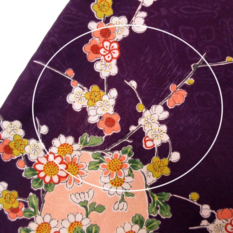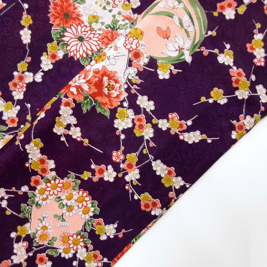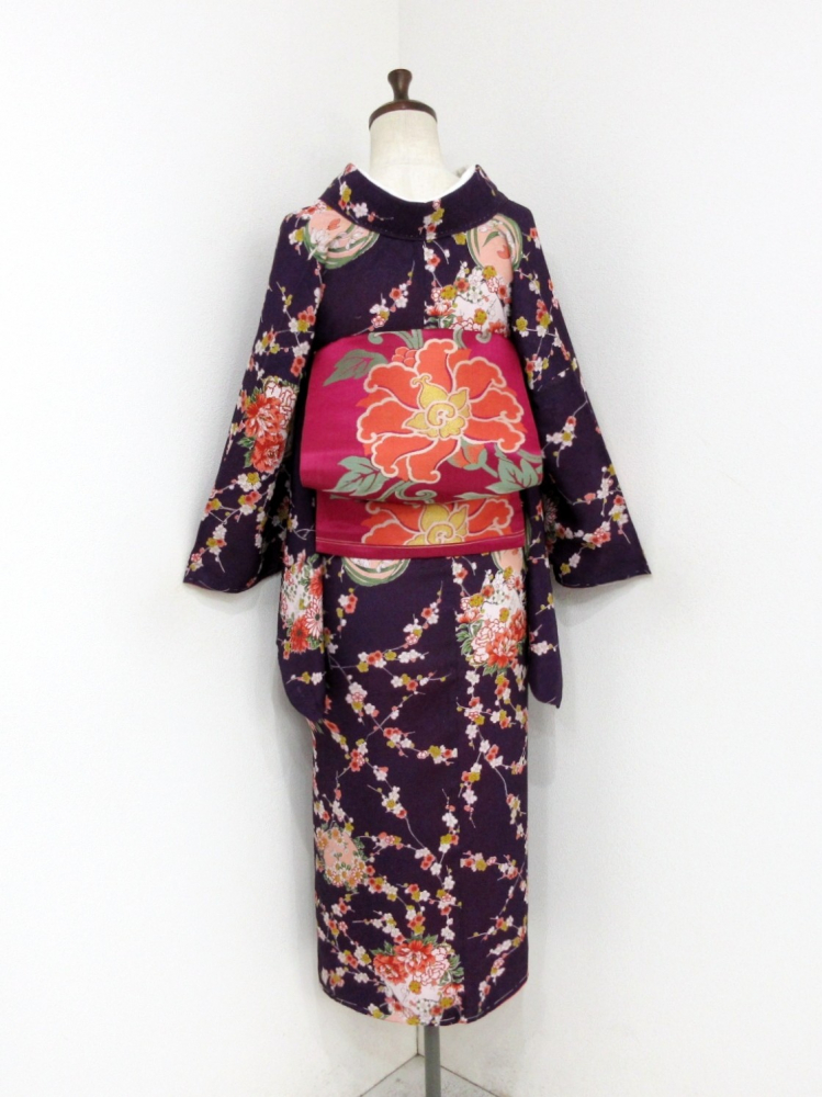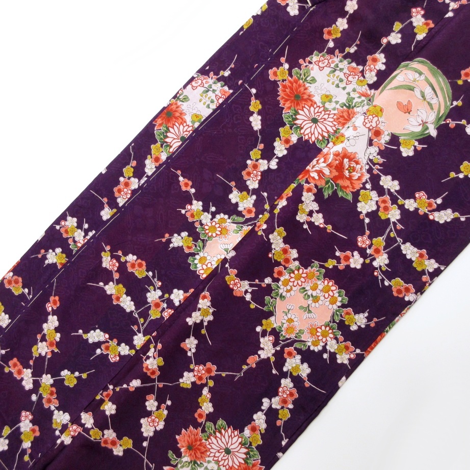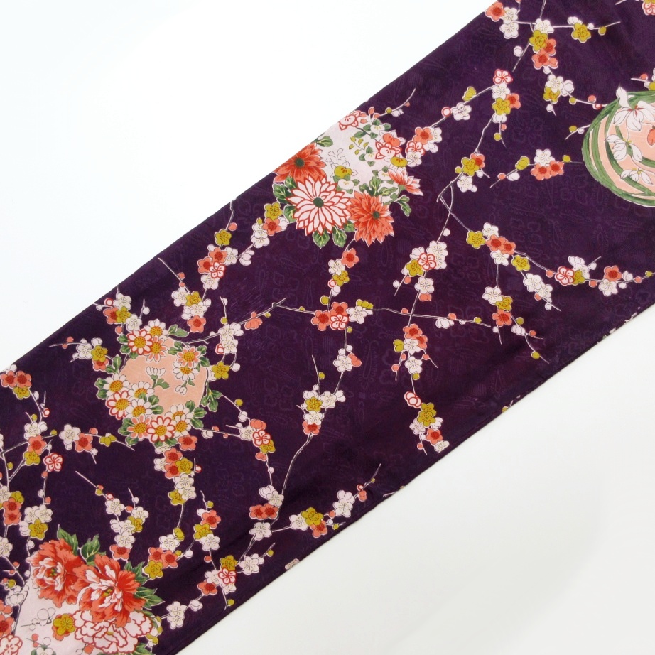 暗い紫色ベースに梅と四季の花丸文が一面にあしらわれ上品な華やかさ♪