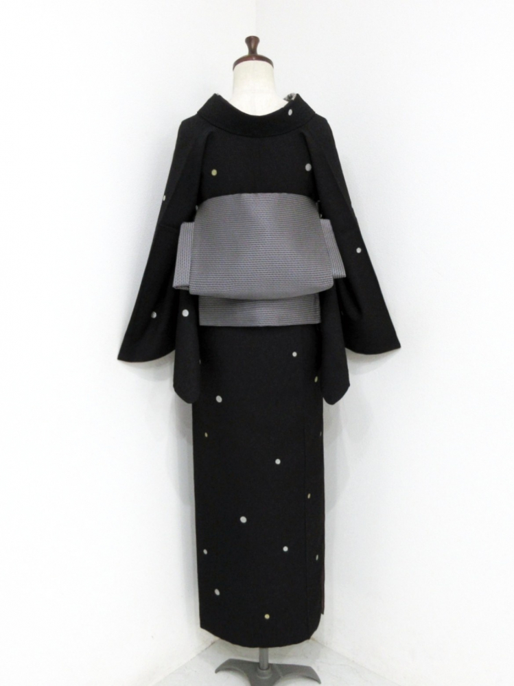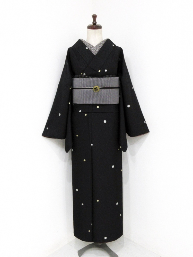 ■雅星■超美!!ブラック*金銀 水玉 ドット♪お召し 正絹袷 裄68.5丈169ゆったりロング 販売価格 64,800円 (税込) sold out この商品について問い合わせる お気に入り 特定商取引法に基づく表記 コーディネートで使用している商品 ★雅星本店オリジナル★新品!!ブラック*シマシマ 銀通し 帯揚げ 正絹 【クリックポスト発送】 15,400円(税込) ★雅星本店オリジナル★新品!!ブラック*帯締め 房付き四分紐 正絹【クリックポスト発送】 14,800円(税込) 商品詳細 状態ランク: ★★★★★ 浮線綾文地紋が浮かび上がる、しなやかな手触りのお召し地。 ブラックベースに金銀の水玉♪ シンプルですがエレガントで華のある着こなしが叶います。 こだわりの帯や小物もよく映え、着こなしのテイスト選ばず楽しめます。 カジュアルダウン・ドレスアップにと様々な着こなしができ、万能。 人と差のつく、ワンランク上の大人の普段着におススメな逸品です。 《袷・広衿》身長164〜174cm位までのゆったりサイズの方にオススメです。 シミ汚れの無い大変綺麗な超美のお品です! 着物のみの価格で、帯・小物は含まれておりません。 サイズ・素材 裄 68.5cm 肩身丈 169cm 袖丈 49cm 袖幅 35cm 前幅 27cm 後ろ幅 31.5cm 内揚げ 8cm 縫込み(袖側) 2cm 縫込み(肩側) 1.5cm 素材 正絹 状態ランクについて ★★★★★ 超美品・新品・未使用品です。 ★★★★ 中古品ですがダメージの無いお品です。 ★★★ 薄ジミなどがありますが着用時には目立ちません。 ★★ 工夫次第で十分着用可能なお買い得品です ★ 大きめのシミがありますので、リメイク材料等にどうぞ。 _mono