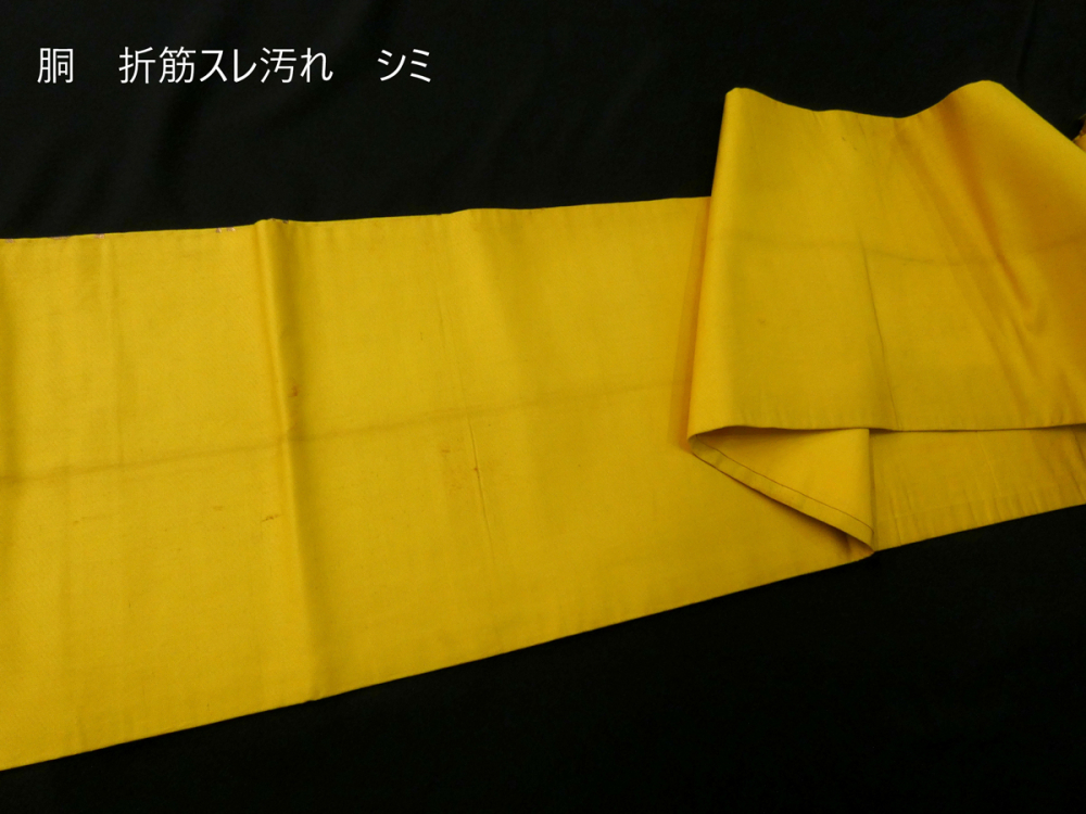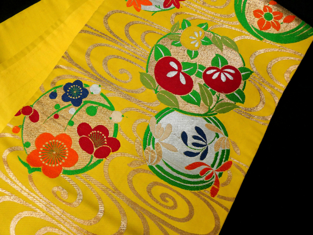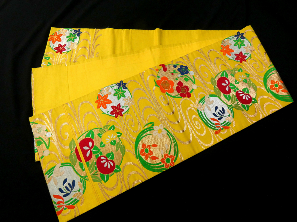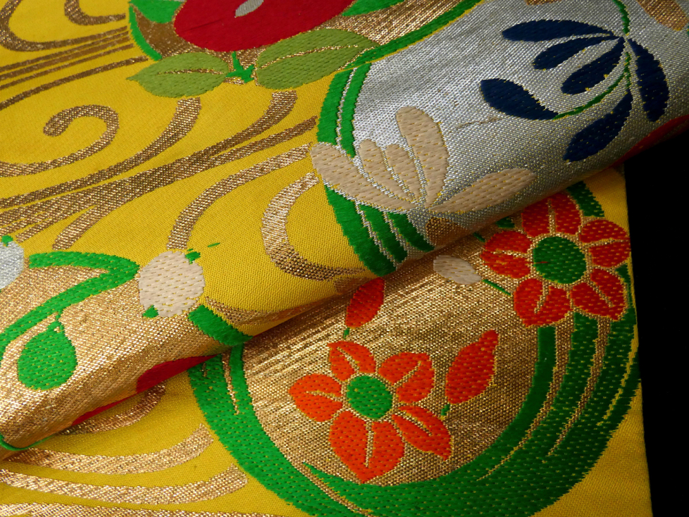 イエローベースに金糸の流水模様、カラフルな花丸紋が織り出されています。