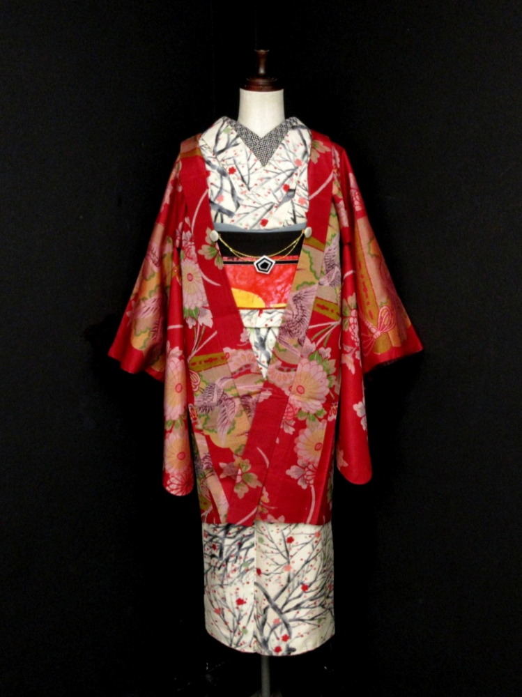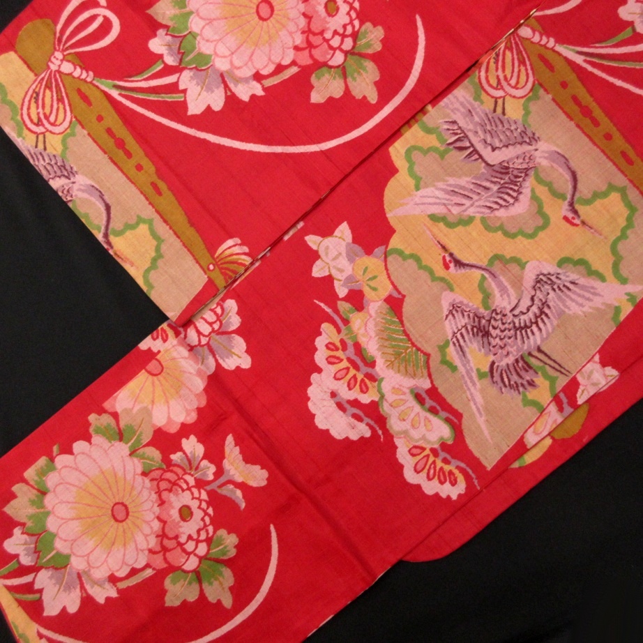 深いレッドベースに向い鶴の大扇子、菊花模様が古典的♪