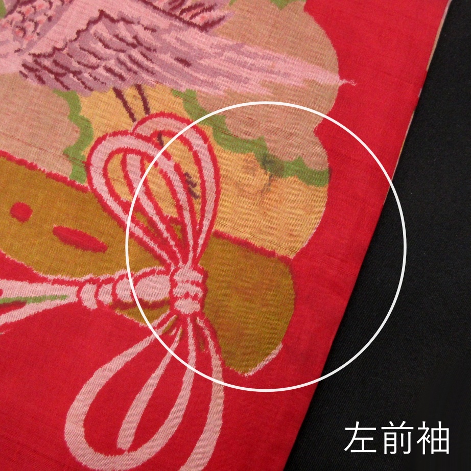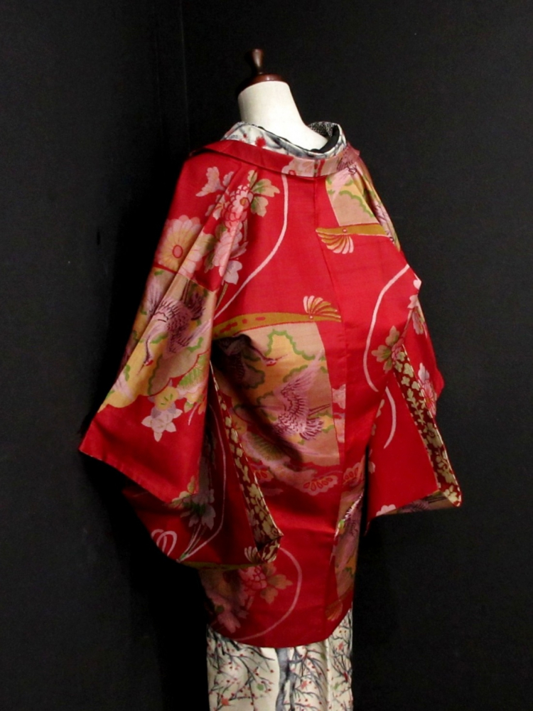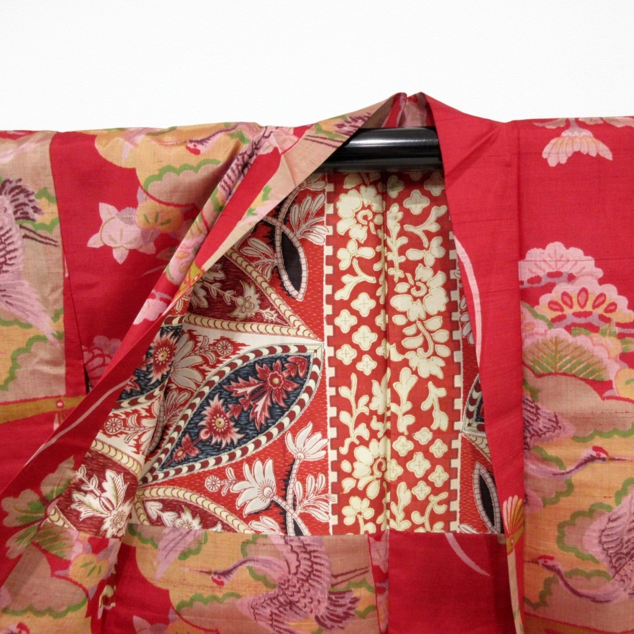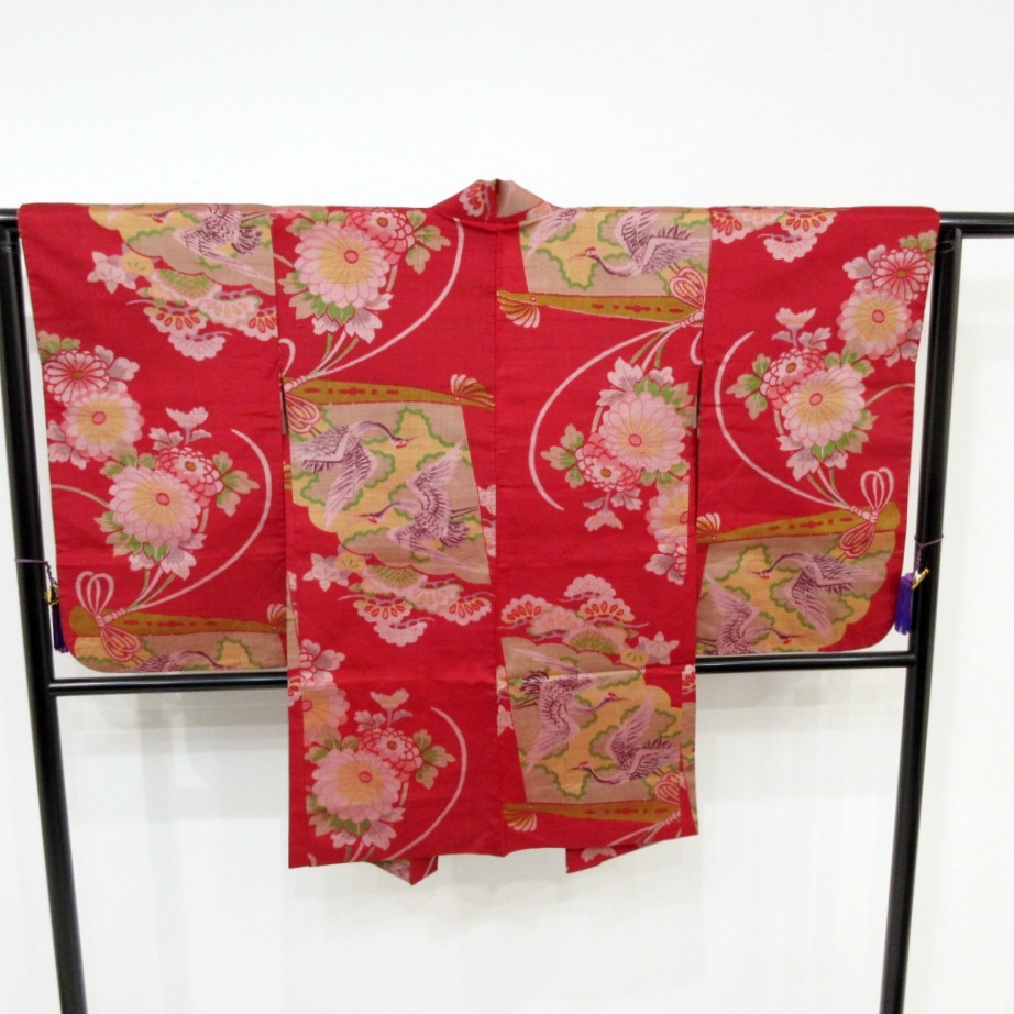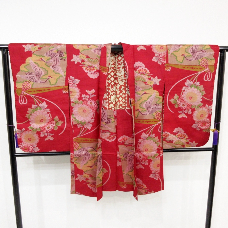 新着商品■雅星■アンティーク!!茜レッド*菊花 向い鶴扇子♪銘仙 長羽織 正絹 裄62.5丈95