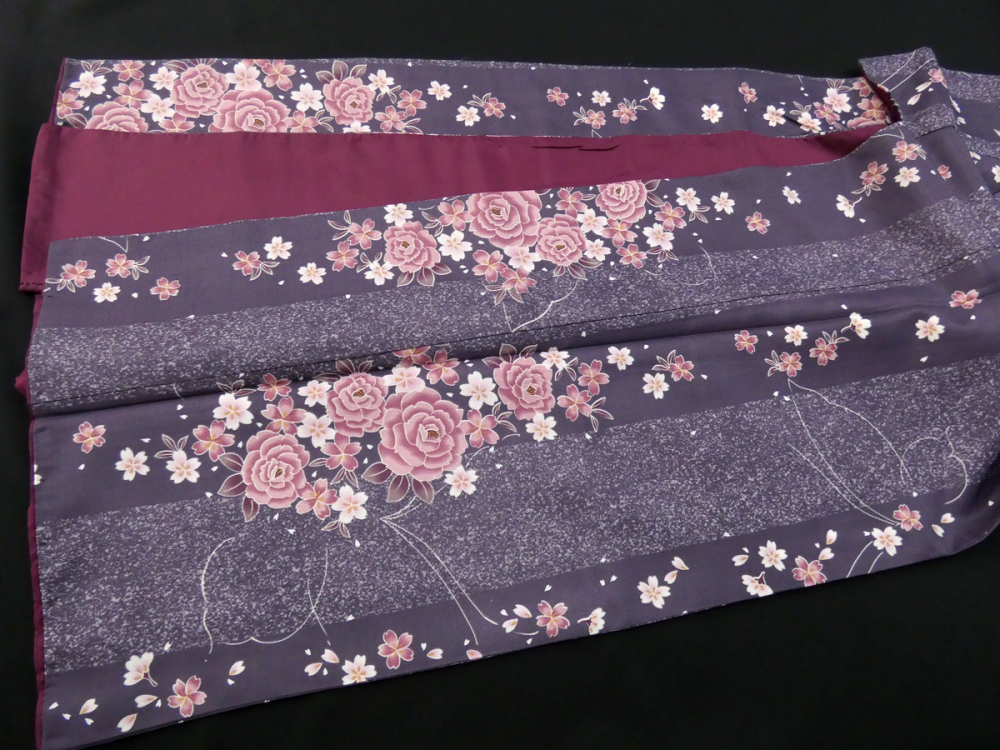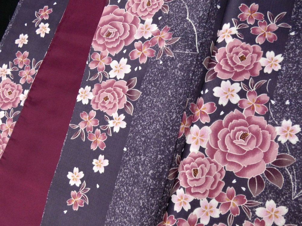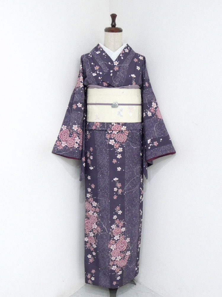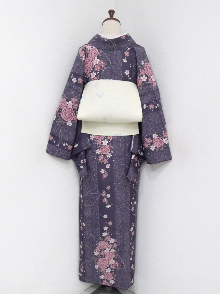 新着商品◆雅星◆超美!!滅紫色*太縞 桜と牡丹 洗える小紋 袷 裄68.5丈168ロング