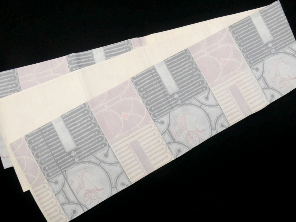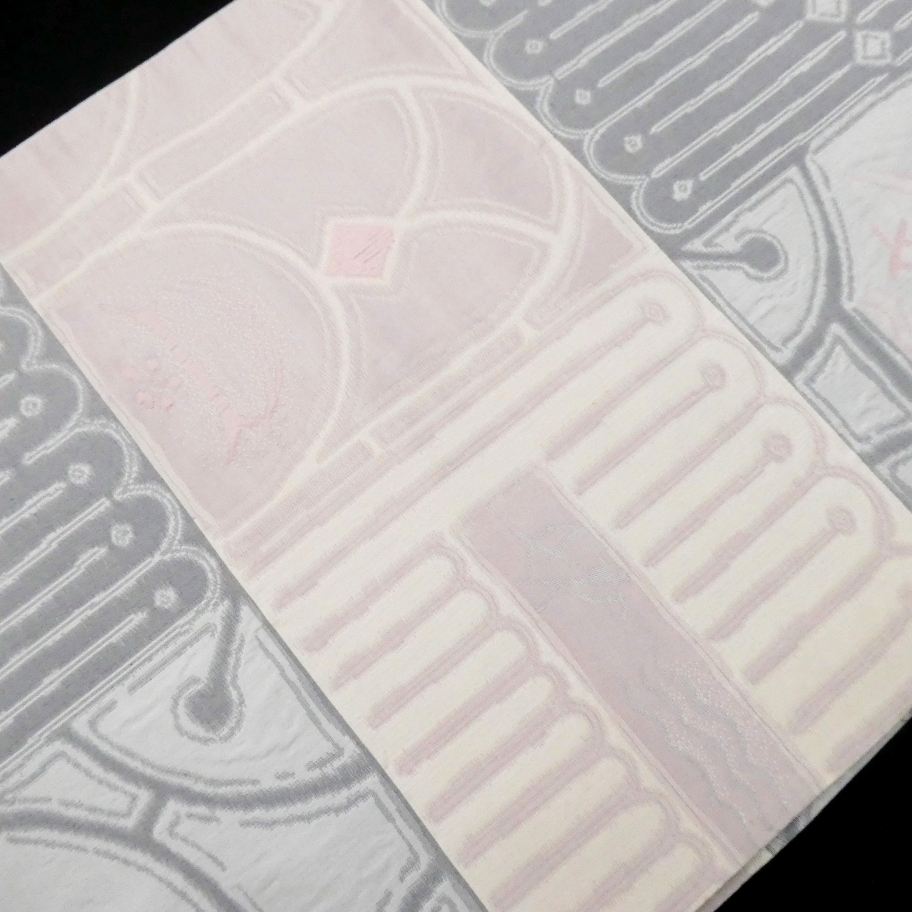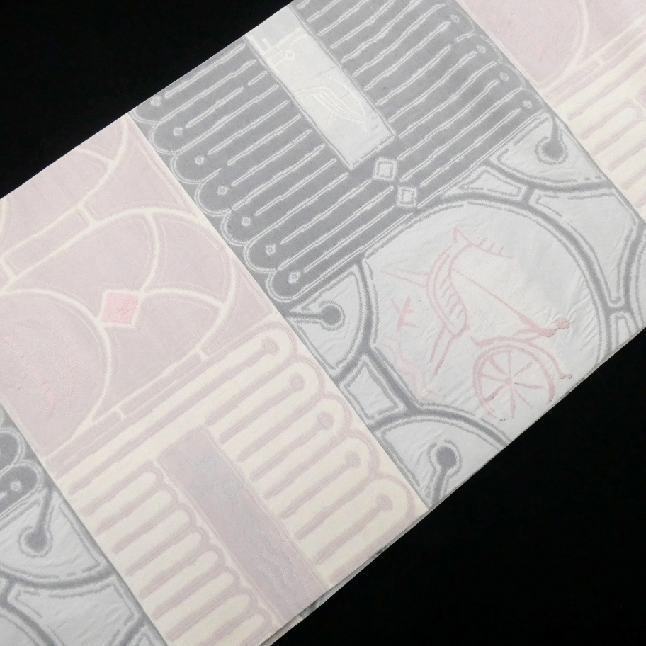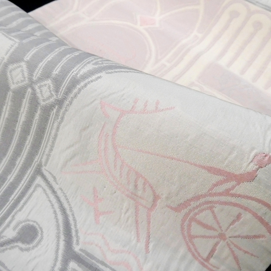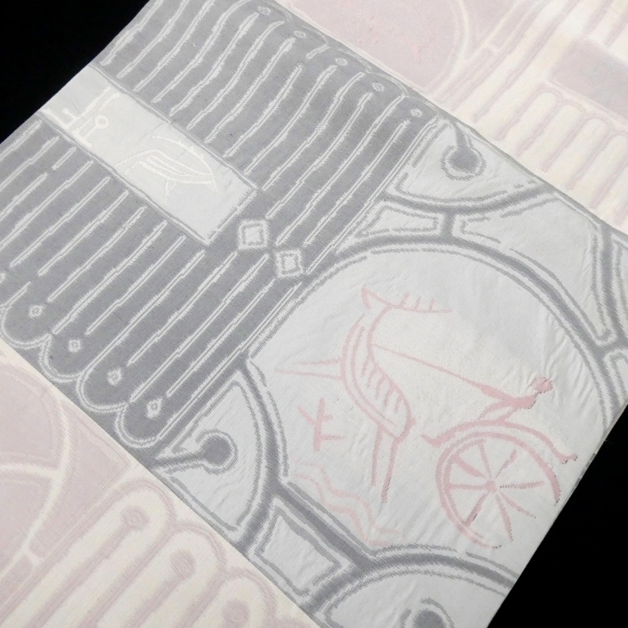 新着商品〓雅星〓美品!!グレー×ピンク*横段 オリエンタル 馬車♪正絹六通《洒落袋帯》