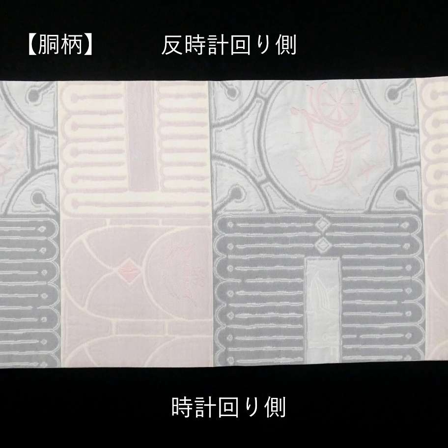手先の無地部分に丸い薄シミが見えますが、帯芯の変色が透けて見えているようです。