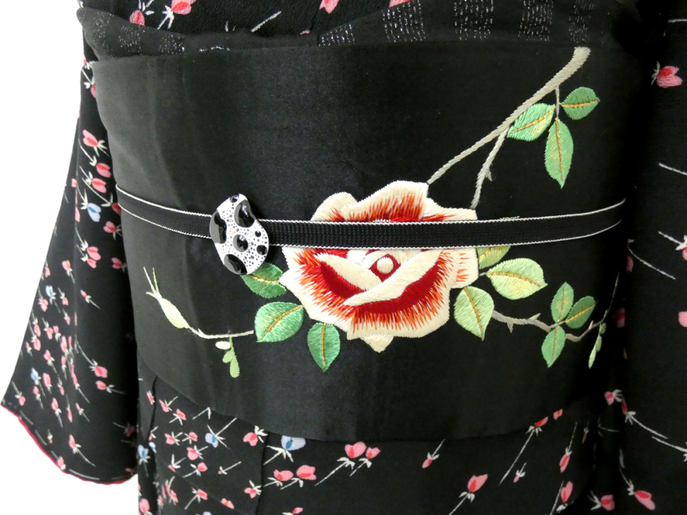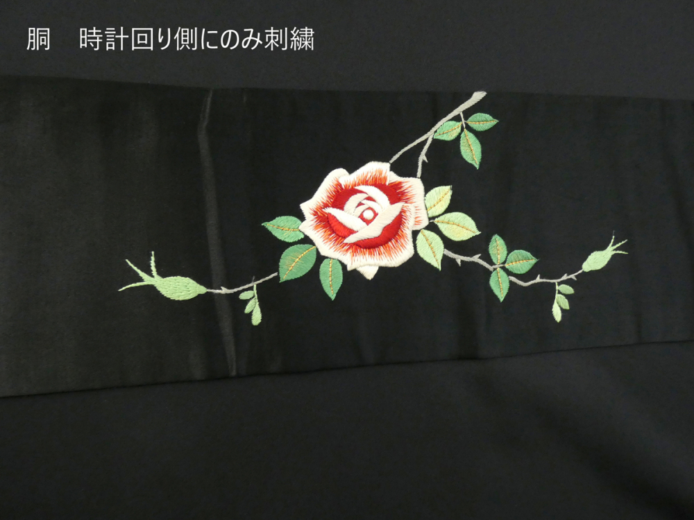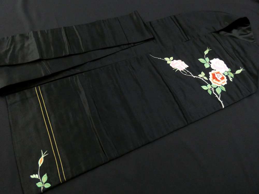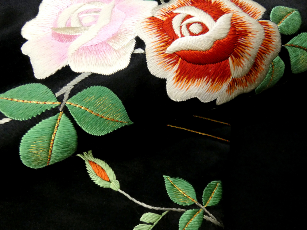 ふっくらとした柔らかい黒繻子生地に丁寧な刺繍のバラ文。